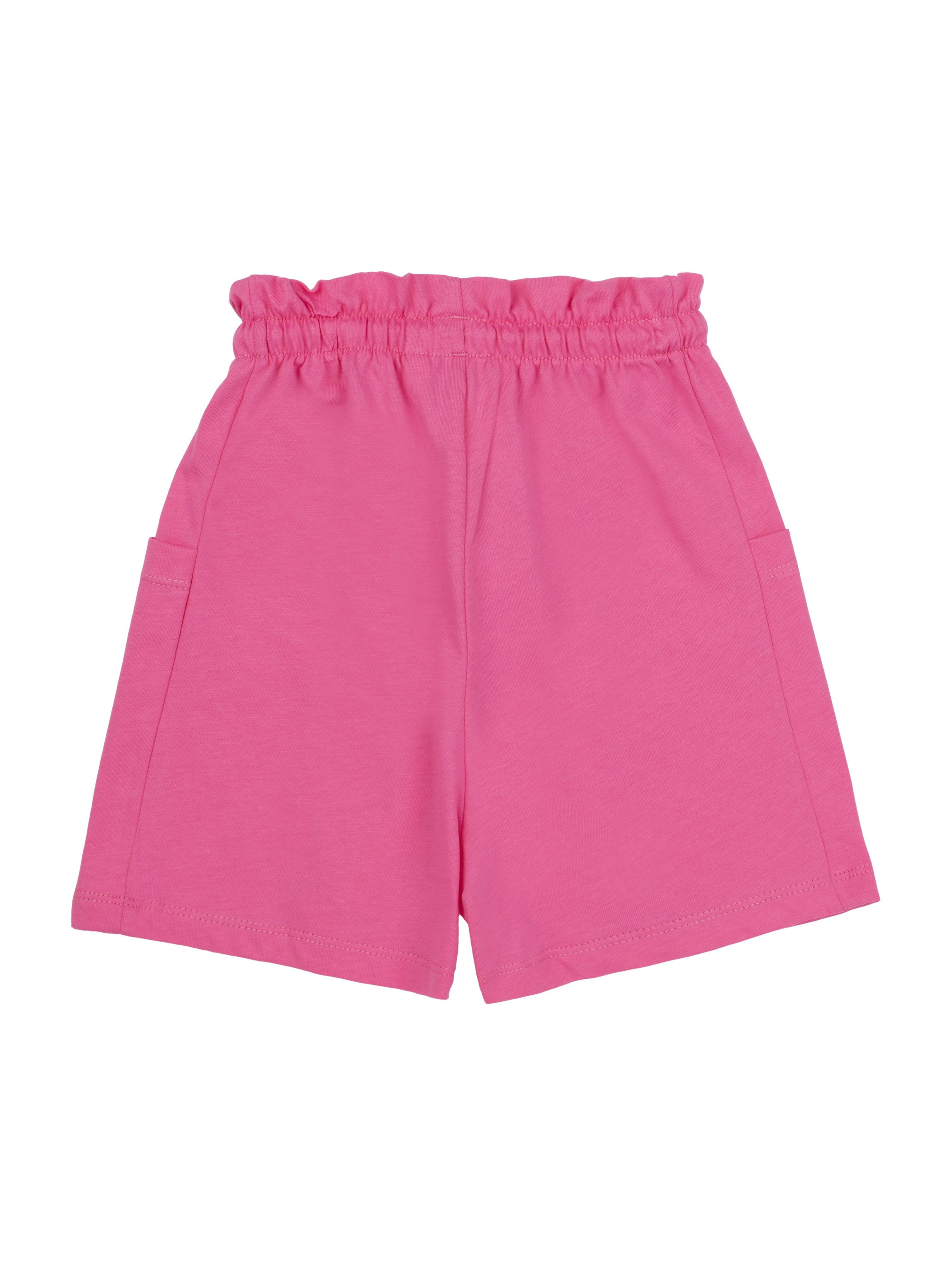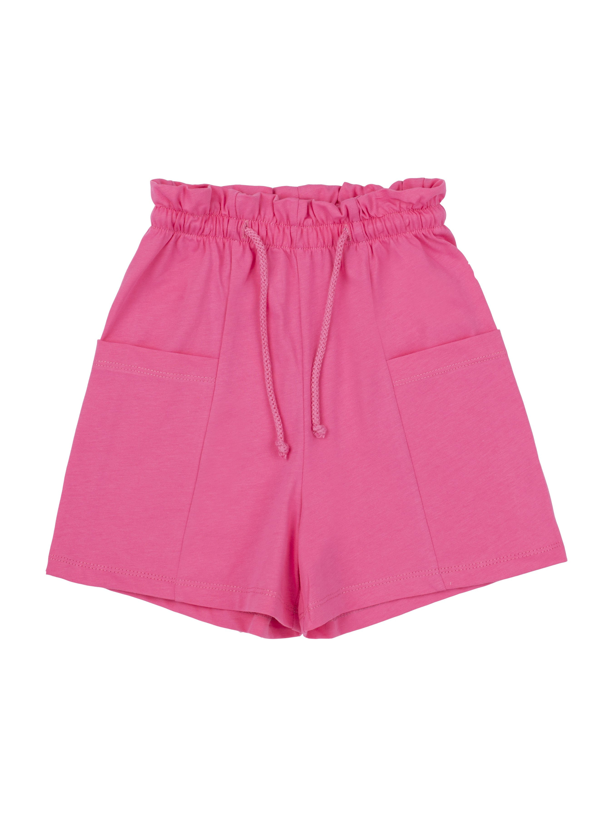 Шорты прямого силуэта, короткие. На передних и задних половинках вертикальные членения. По боковым швам вшивные карманы. Пояс цельнокроенный с рюшей и внутри с резинкой и шнуром.