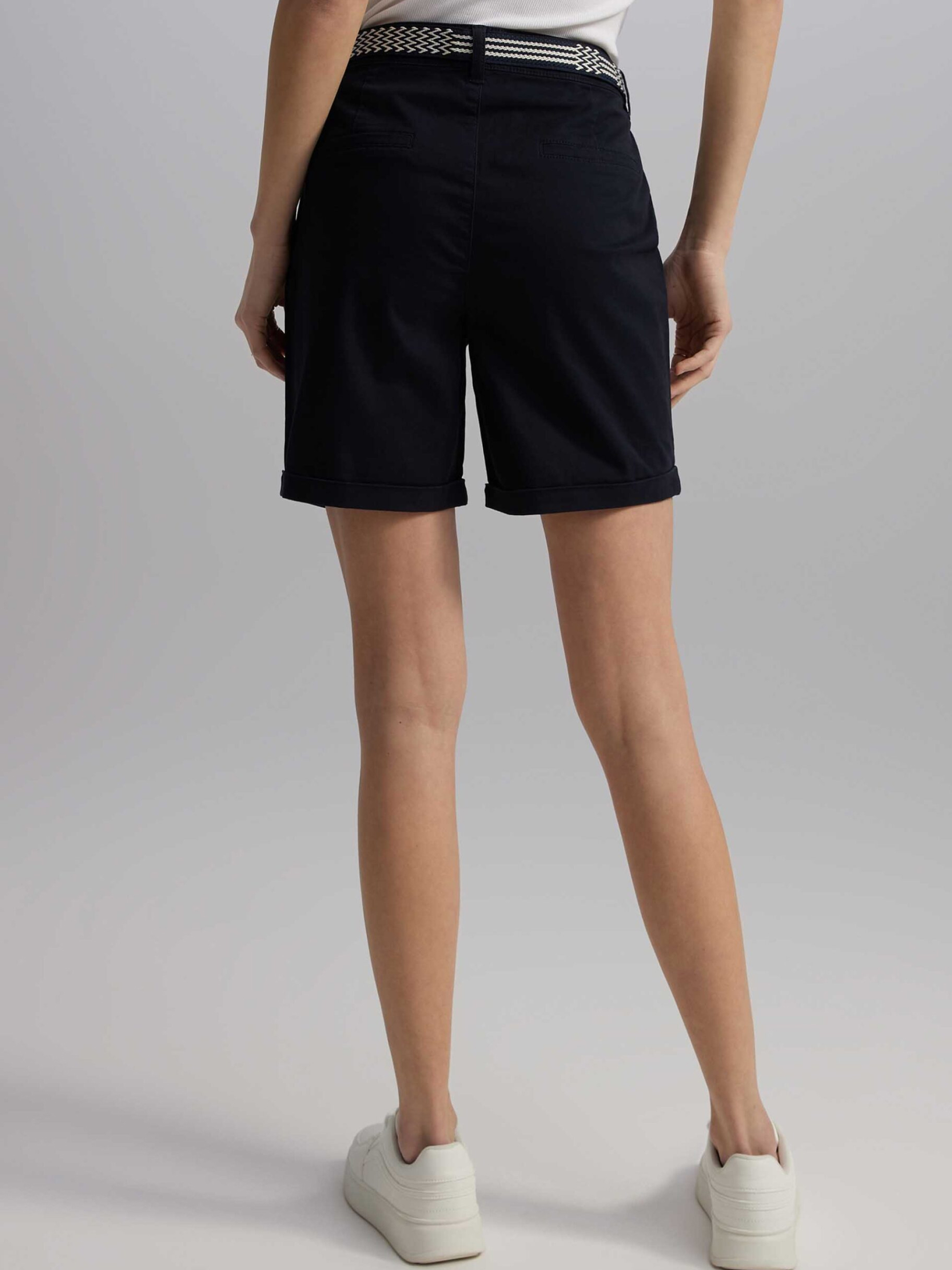 MERASSA Женские шорты чинос с куличом: - средняя посадка, - облегающие штанины до середины бедра, - декоративный пояс, – блестящие серебристые детали. Состав: 98% хлопок 7% эластан Сезон: Весна/Лето Уход: - стирка при максимум 30 °С - не отбеливать - не сушить в сушильной машине - гладить максимум при темп. 150 °С - не химчистка Размер на модели – S Рост модели – 179 см