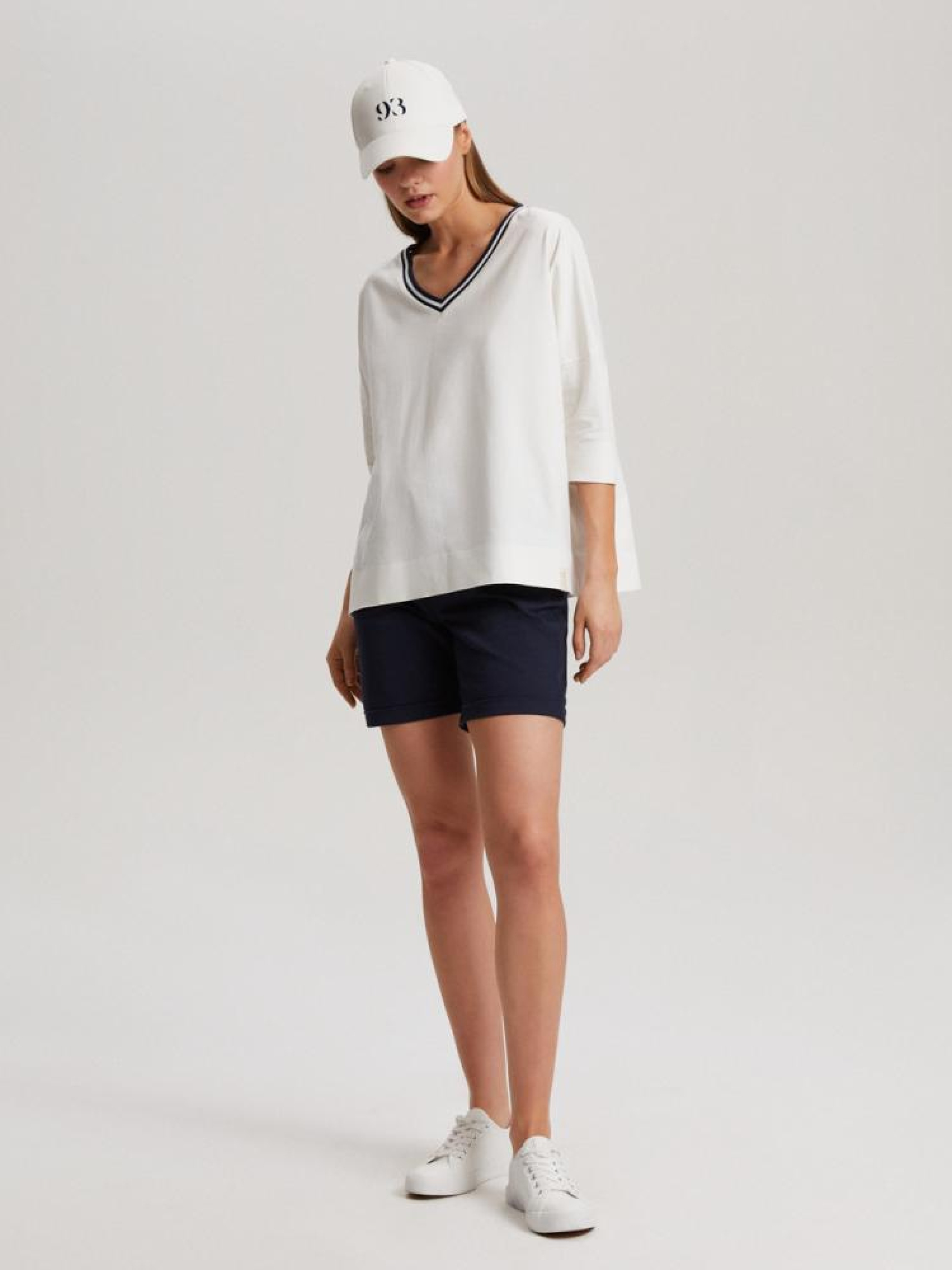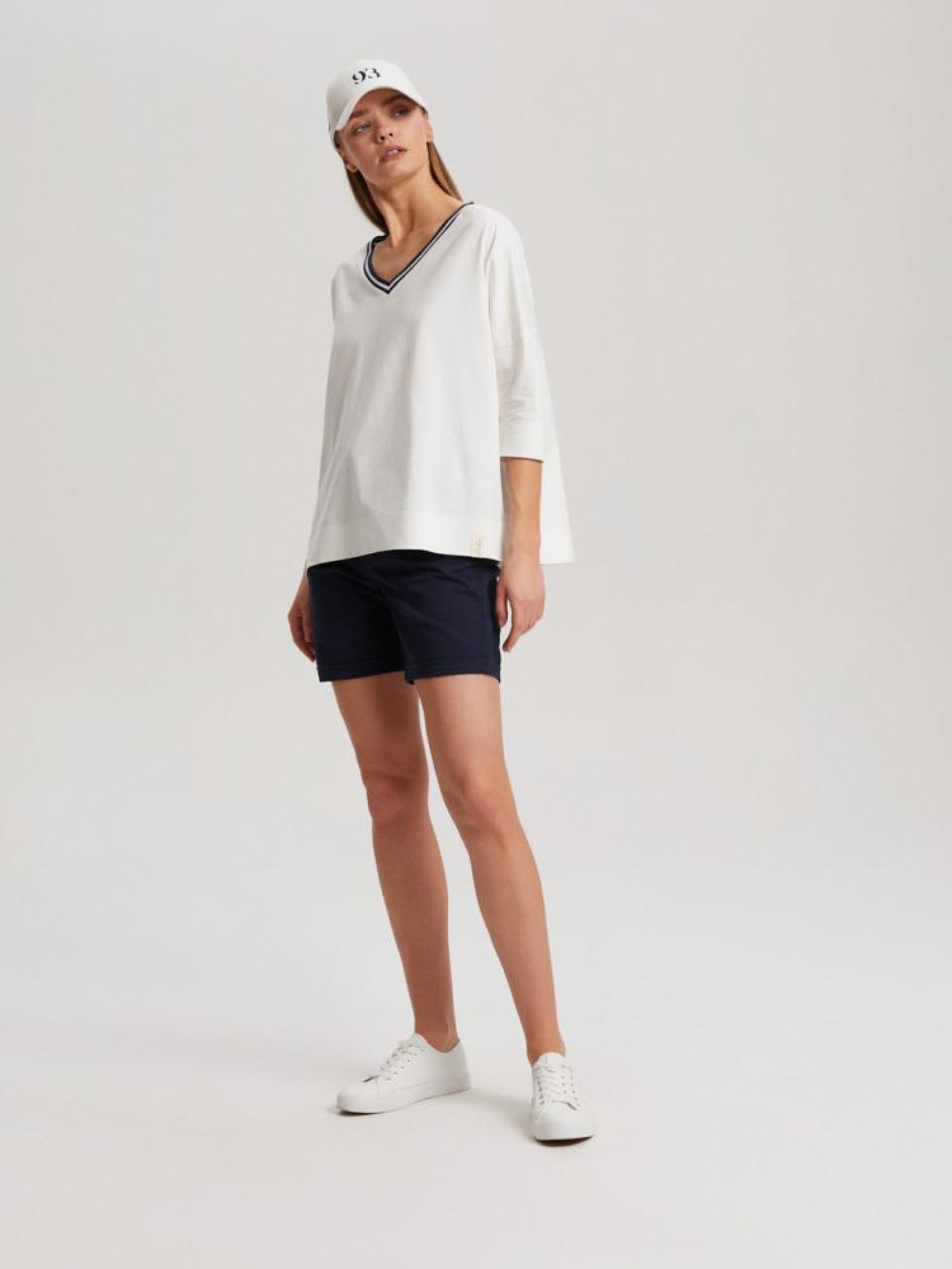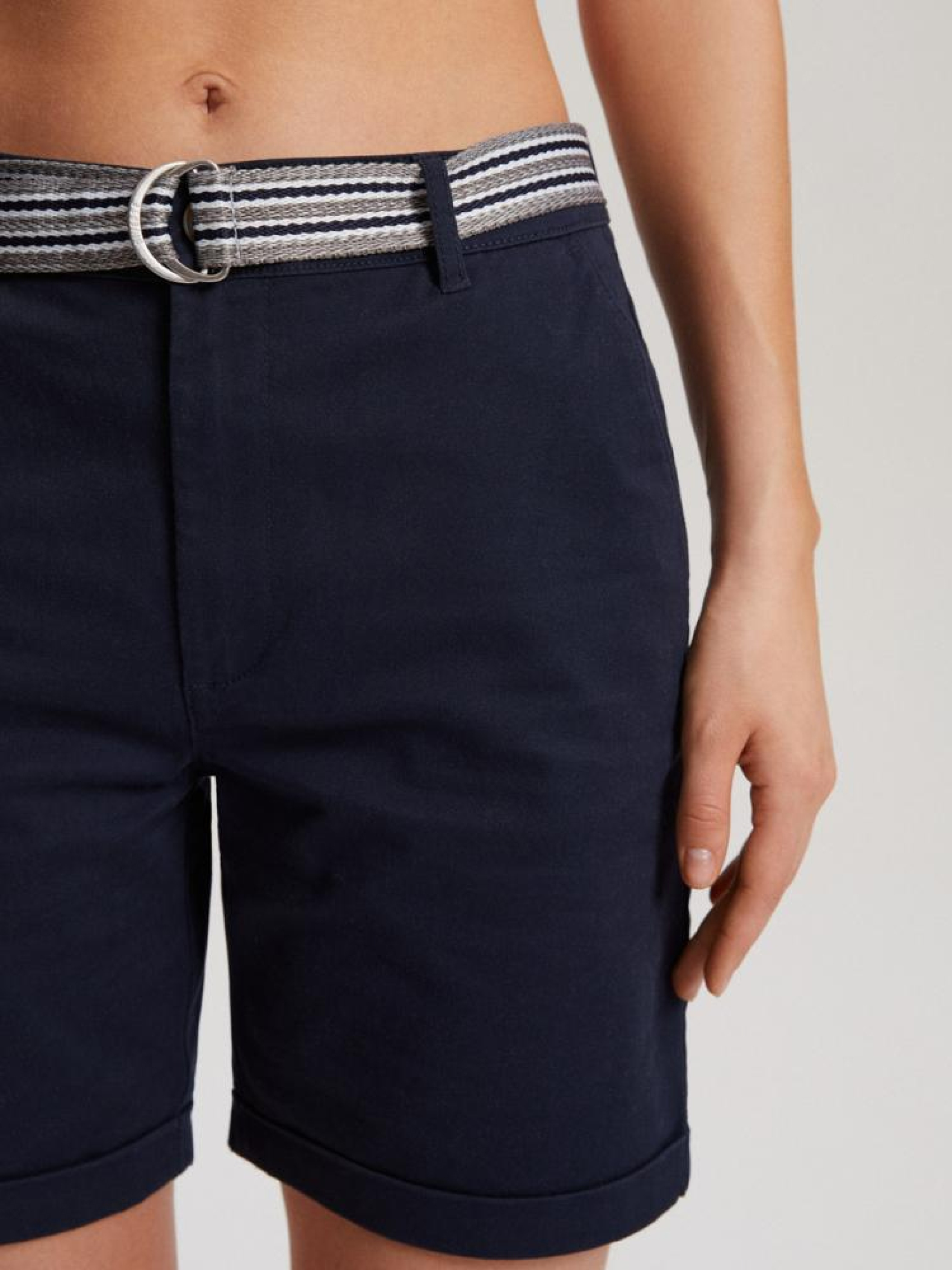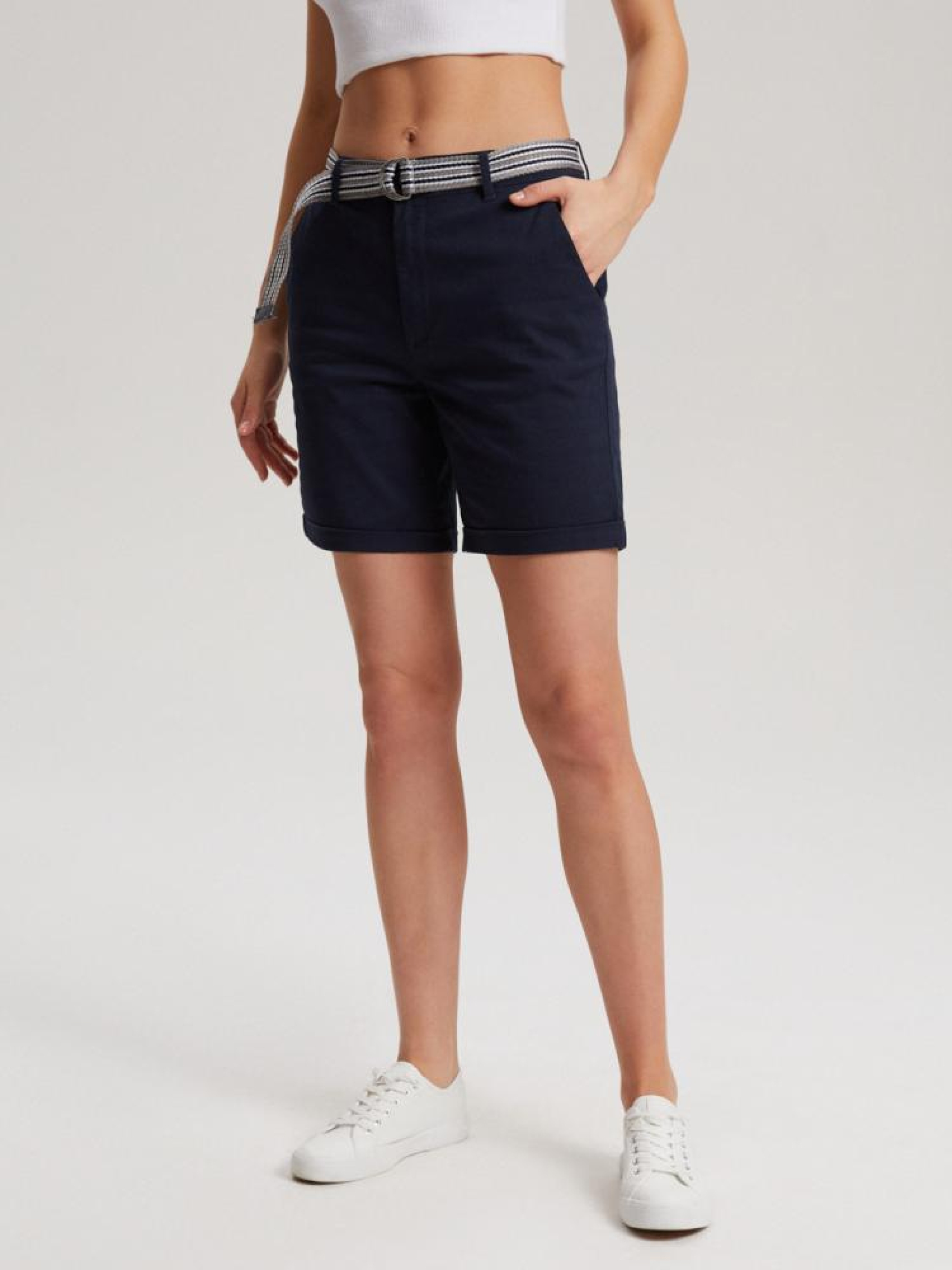 Шорты MARESE 10041491 Шорты тканевые с поясом и подвернутыми штанинами: - свободного кроя, - из хлопковой ткани с примесью эластана, - с поясом, - с подвернутыми штанинами, - в наличии синего цвета. Сезон: Весна/Лето Состав: 98% хлопок, 2% эластан Уход: - стирка при максимум 30 °С - не отбеливать - не сушить в сушильной машине - гладить максимум при темп. 150 °С - не химчистка Размер на модели - M Рост модели - 179 см
