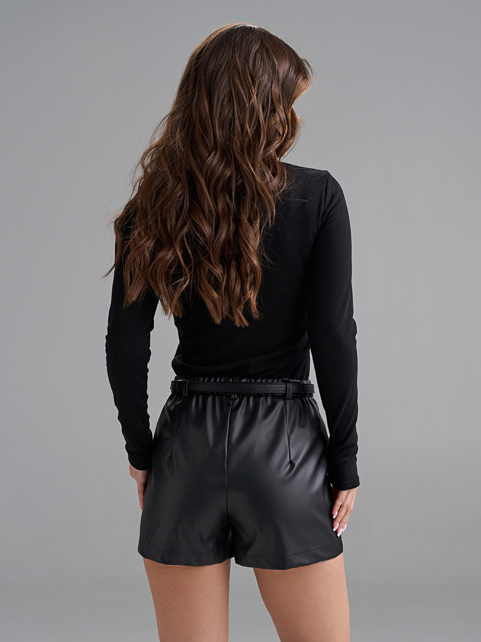 Чорні облягаючі міні шорти, виготовлені з еко-шкіри. Модель високої посадки з поясними шльовками. Шорти на блискавці та гудзику, позаду поясу еластична гумка. Напівобхват: Талія: XS (32), S (34), M (36), L (38), XL (40), Стегна: XS (42), S (44), M (46), L (48), XL (50), Довжина виробу - 32, Довжина по внутрішньому шву - 5, Тканина: Низької еластичності.