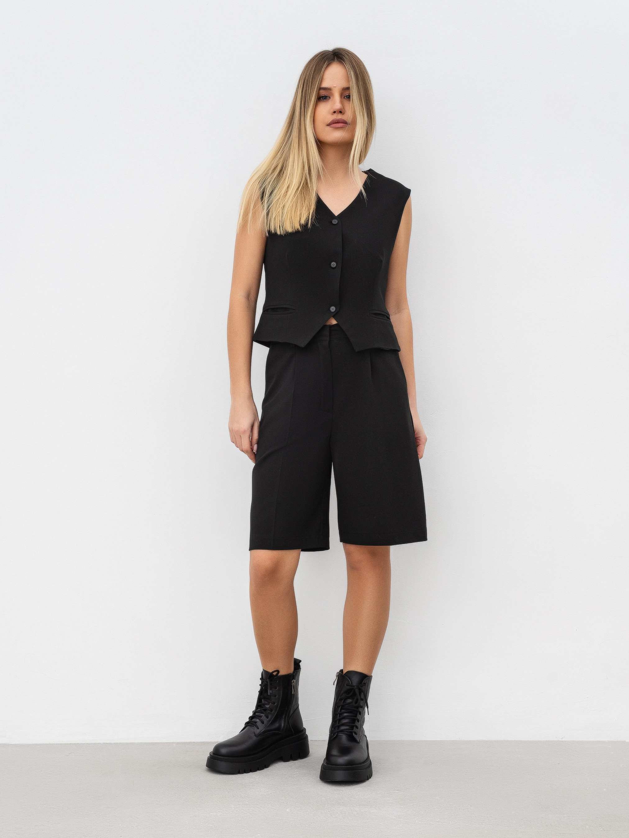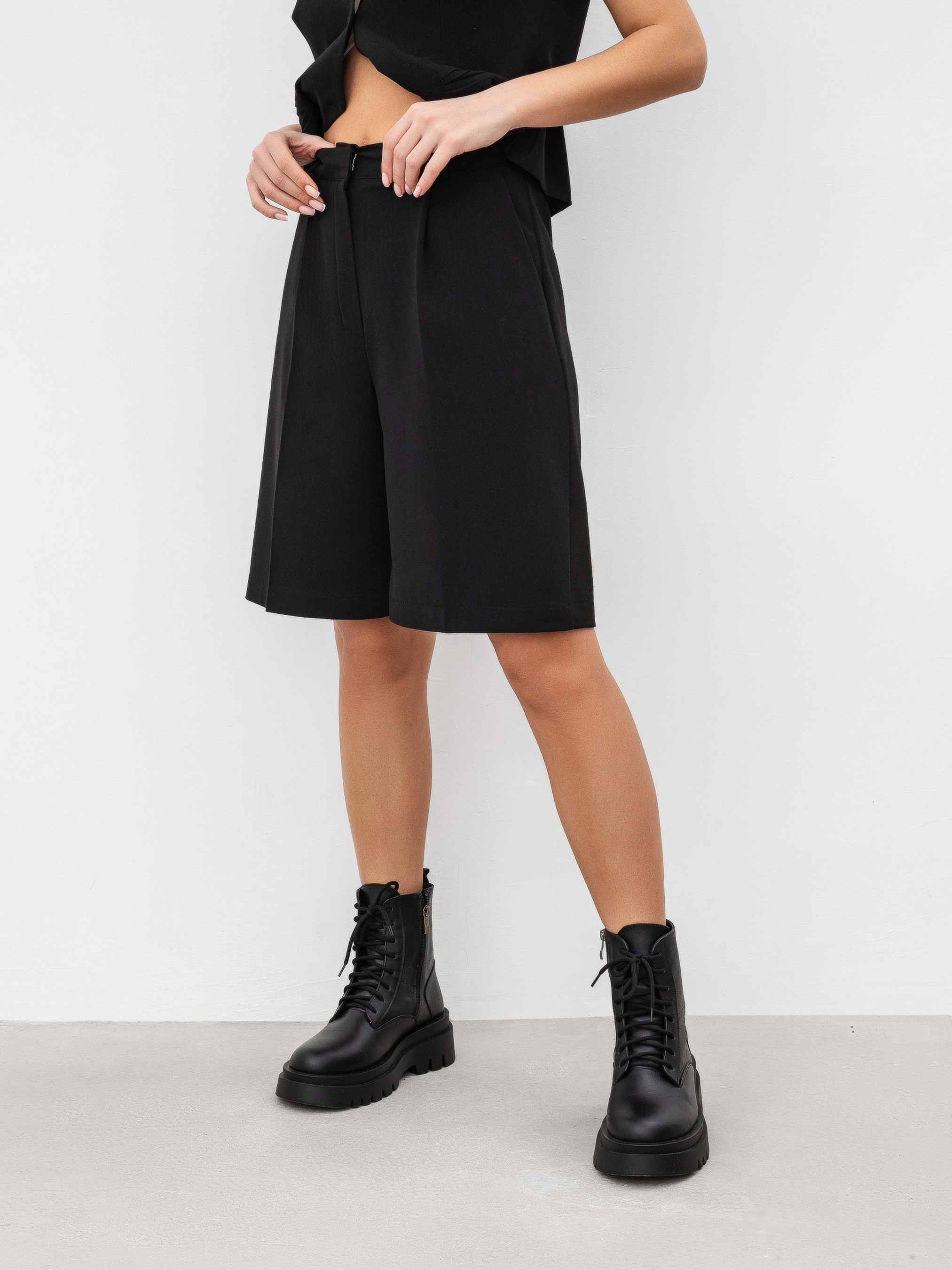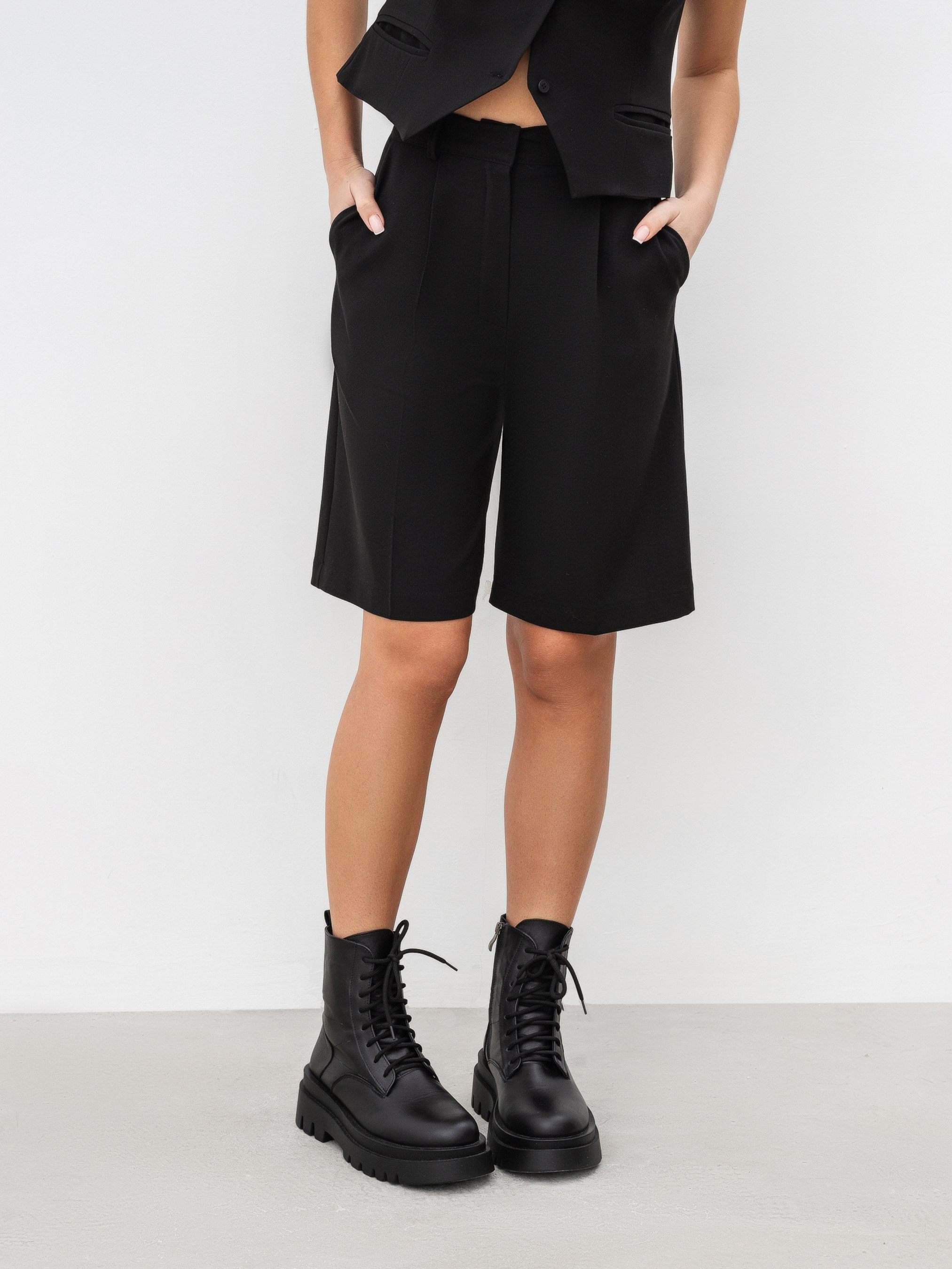 Базовые шорты-бермуды с высокой талией. Трендовая модель имеет застежку на пуговицу с крючком по поясу и молнией. На спинке по поясу есть резинка. Шорты имеют глубокие карманы спереди. На поясе есть петли, чтобы можно было надеть ремешок. Советуем сочетать с базовым верхом и акцентной верхней одеждой. Например, косуха или объемный бомбер. XS:- Длина по внешнему шву : 51 см; Полуобхват бёдер : 44 см; Посадка : 31 см; Полуобхват талии : 30 см, S:- Длина по внешнему шву : 51 см; Полуобхват бёдер : 46 см; Посадка : 31 см; Полуобхват талии : 31 см, M:- Длина по внешнему шву : 51 см; Полуобхват бёдер : 48 см; Посадка : 31 см; Полуобхват талии : 33 см, L:- Длина по внешнему шву : 51 см; Полуобхват бёдер : 51 см; Посадка : 31 см; Полуобхват талии : 34 см.