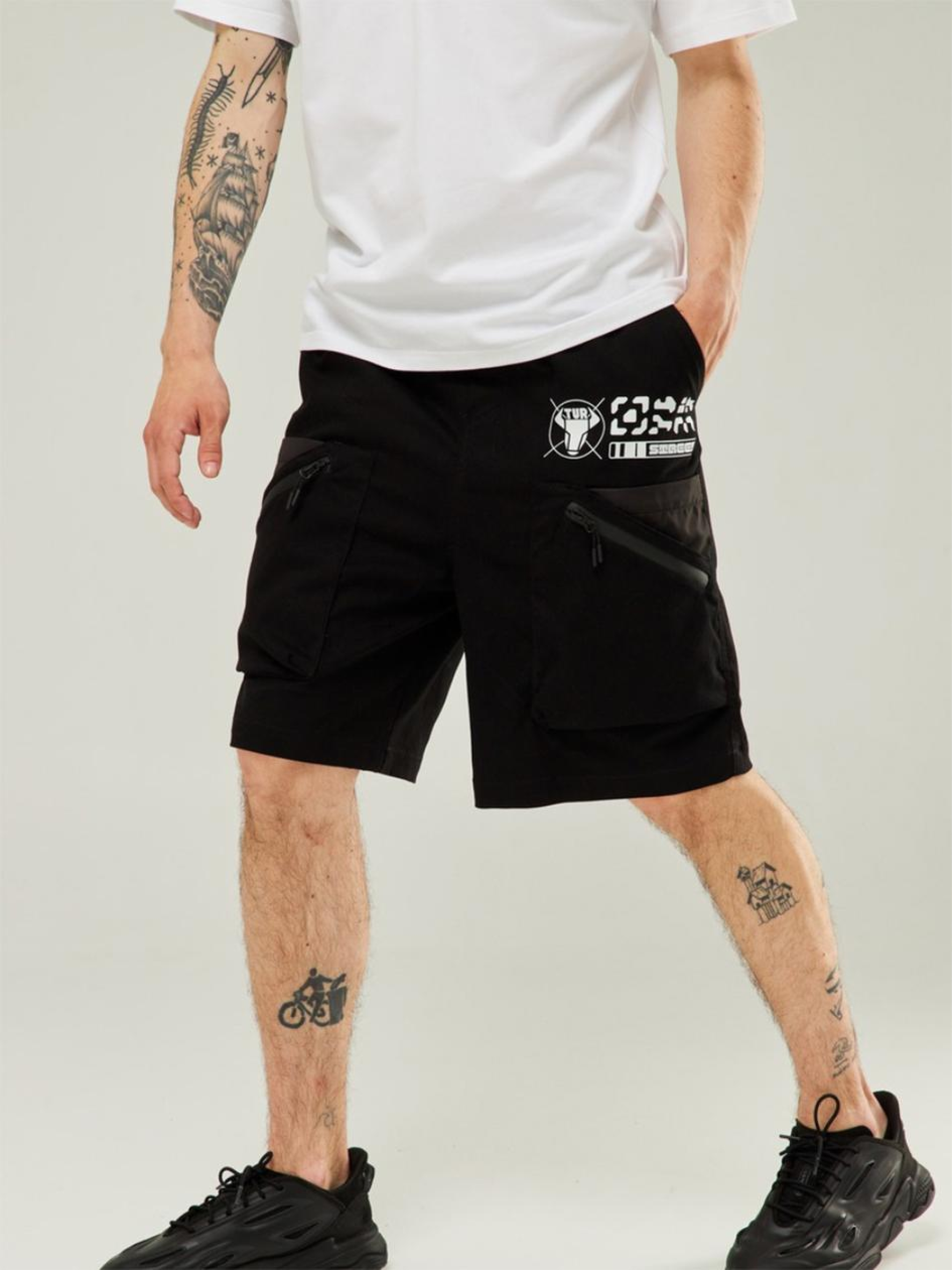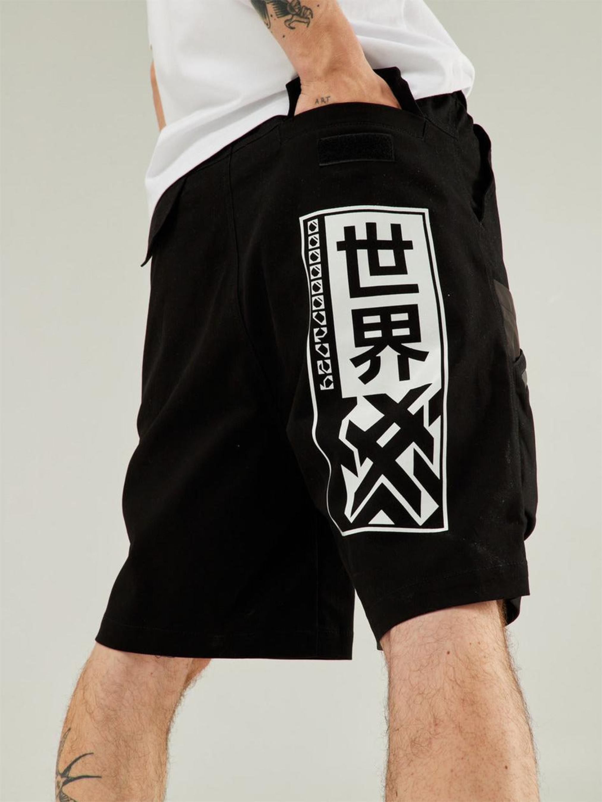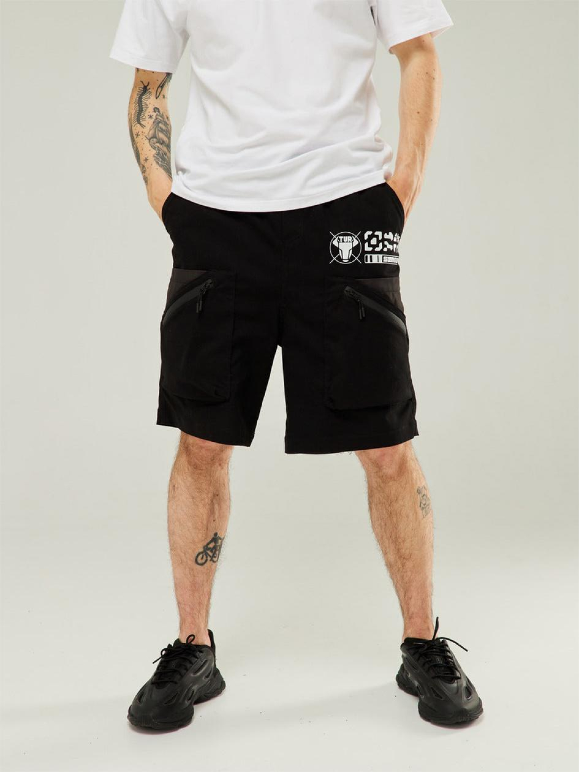 Состав ткани: 85% котон, 15% полиэстер. Особенности материалов и фурнитуры: Основная ткань — котон: мягкий, дышащий материал, обеспечивающий комфорт при ношении. Вставки из плащевки придают изделию водоотталкивающие свойства, повышают прочность и устойчивость к погодным условиям. Ткань не эластична, хорошо держит форму и подходит для повседневного использования. Фурнитура — молнии YKK, надежны и рассчитаны на интенсивную эксплуатацию. Ключевые особенности модели: Шорты карго с низкой свободной посадкой. В поясе встроена резинка для лучшей посадки и двусторонний пояс на ременной ленте для точной фиксации по фигуре. На уровне боковых швов установлены пластиковые держатели для укрепления свободного края ременной ленты. Два кармана брючного типа сверху изделия. Накладные карманы имеют тройную конструкцию: первый вход через прорезиненную молнию, второй вход сверху в карман из плащевки, третий вход между плащевкой и основным накладным карманом из коттона. На бегунках двойные пуллеры черного цвета. Модель украшена двумя принтами белого цвета для дополнительного акцента. Рекомендации по уходу: Машинная стирка при максимальной температуре 30 ºC с коротким циклом отжима. Не использовать щелочные средства или отбеливатель. Можно использовать сушилку. Химчистка запрещена
