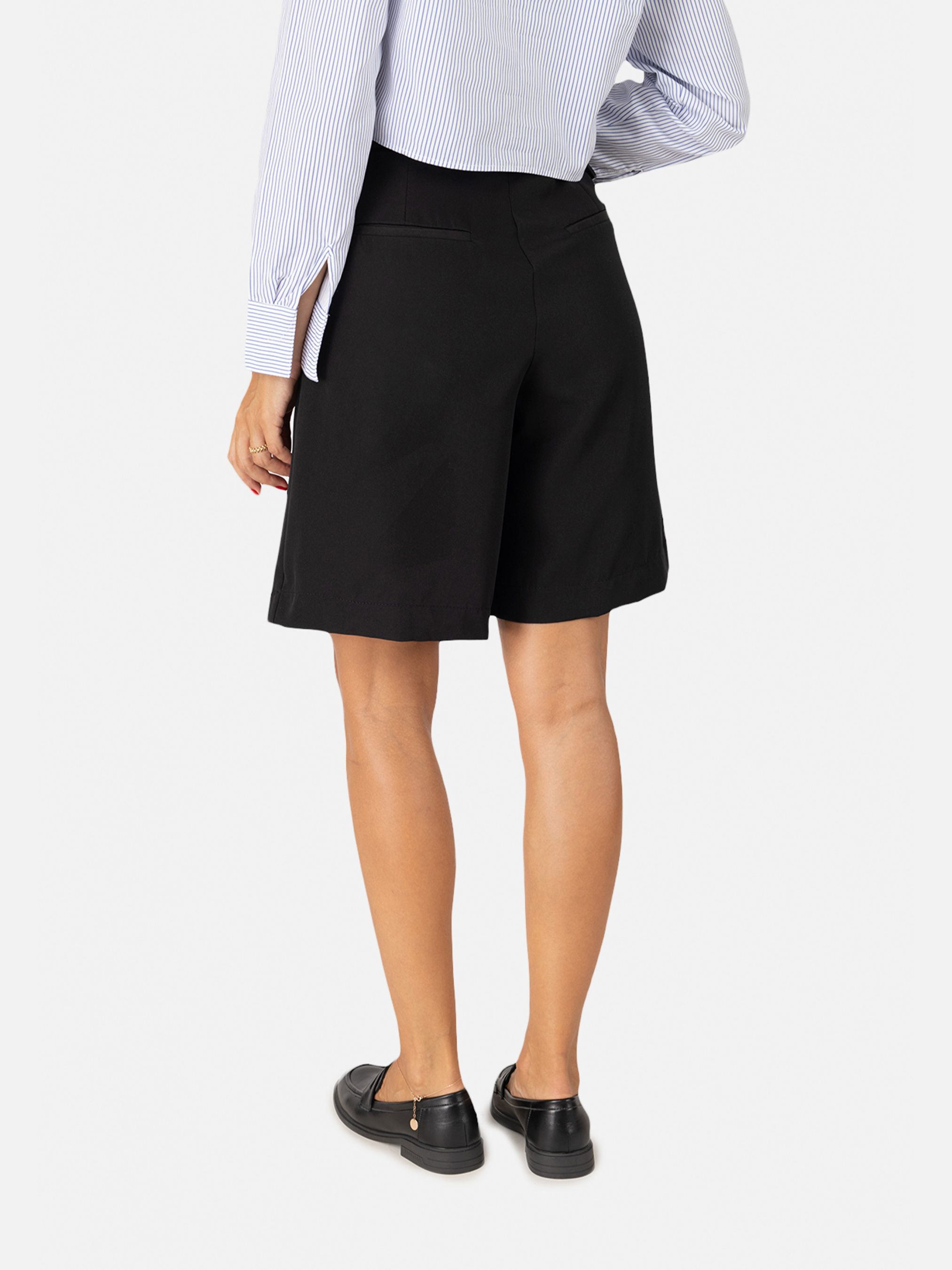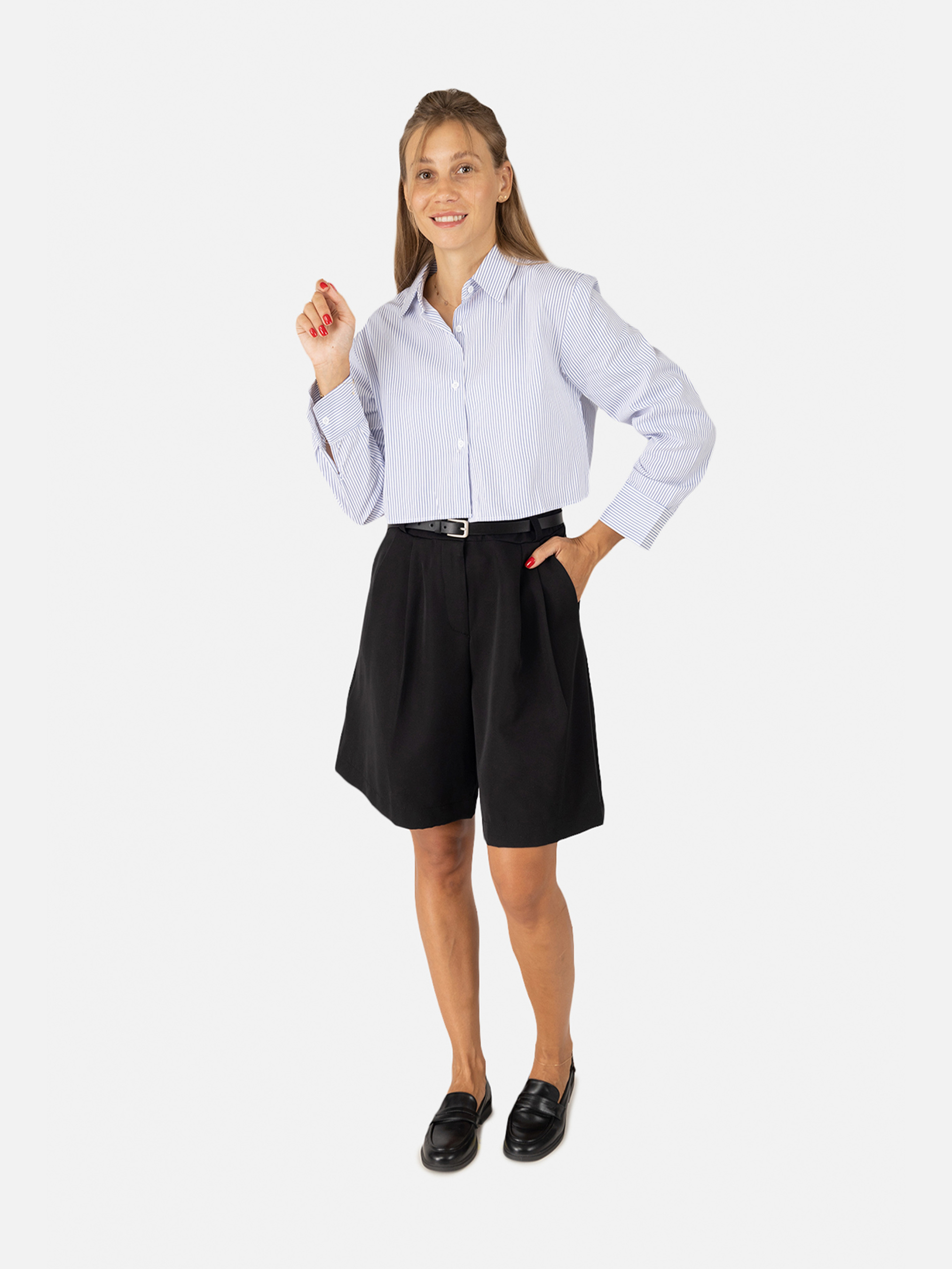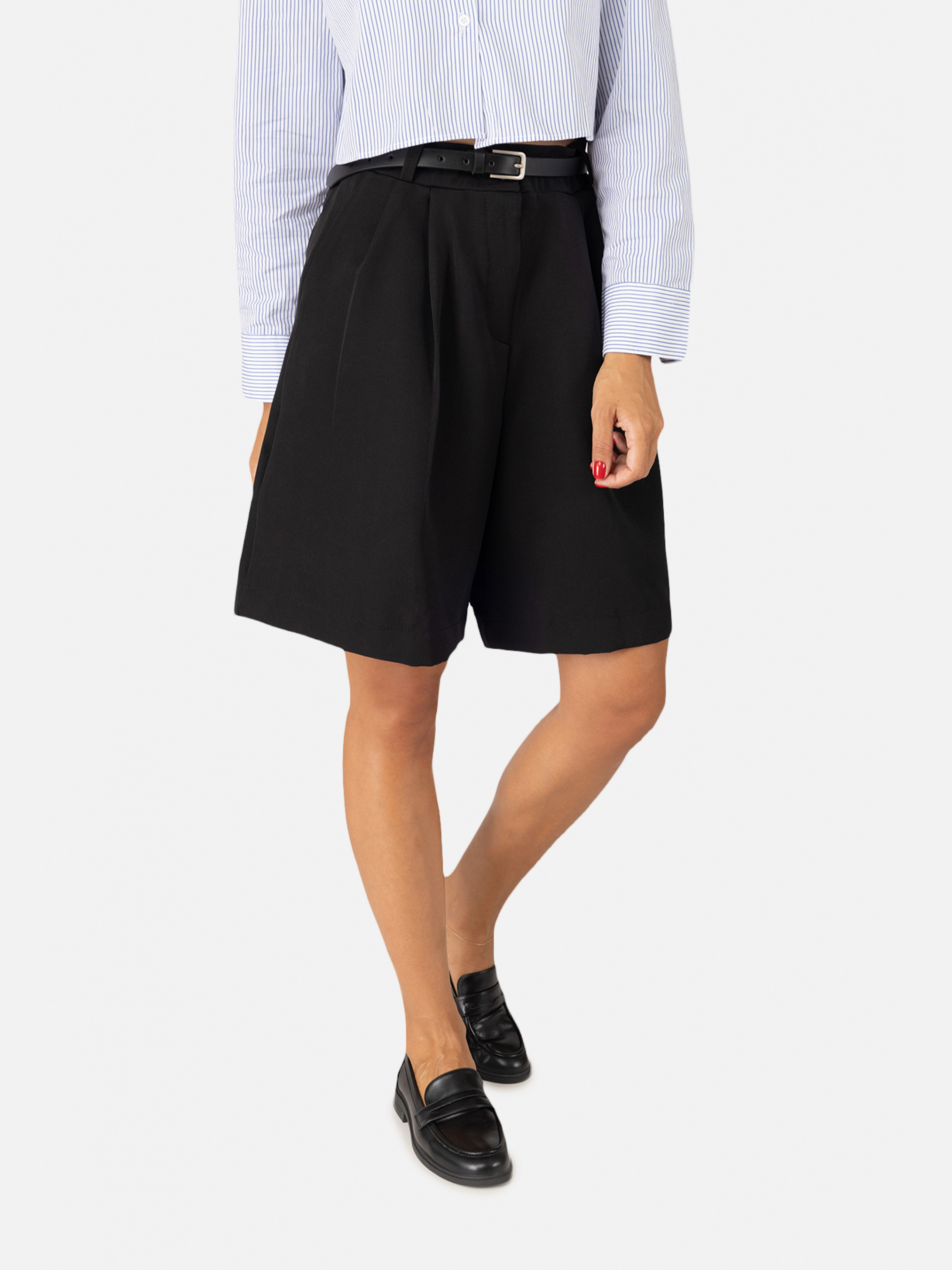 Женские шорты бермуды – стильный и удобный выбор для летнего гардероба, сочетания комфорта и элегантности. Изготовлены из легких и дышащих материалов, обеспечивают комфорт даже в самые жаркие дни. Средняя посадка идеально подчеркивает талию, а удобный пояс с застежкой гарантирует комфортную посадку. Шорты бермуды легко комбинируются с разными элементами гардероба – от легких блузок до футболок или рубашек, что позволяет создавать как повседневные, так и более официальные образы. Станут незаменимым элементом вашего летнего гардероба, обеспечивая удобство и стиль в любой ситуации – от прогулок по городу до встреч с друзьями или поездок на отдых. Особенности: Цвет: черный, однотонный. Материал изготовления: костюмная ткань. Состав: 60 % шерсть, 30 % полиэстер, 10 % вискоза. Посадка: средняя. Крой: свободные. Параметры модели: Рост: 170 сантиметров. Размер на модели: 44. Страна производитель: Украина.