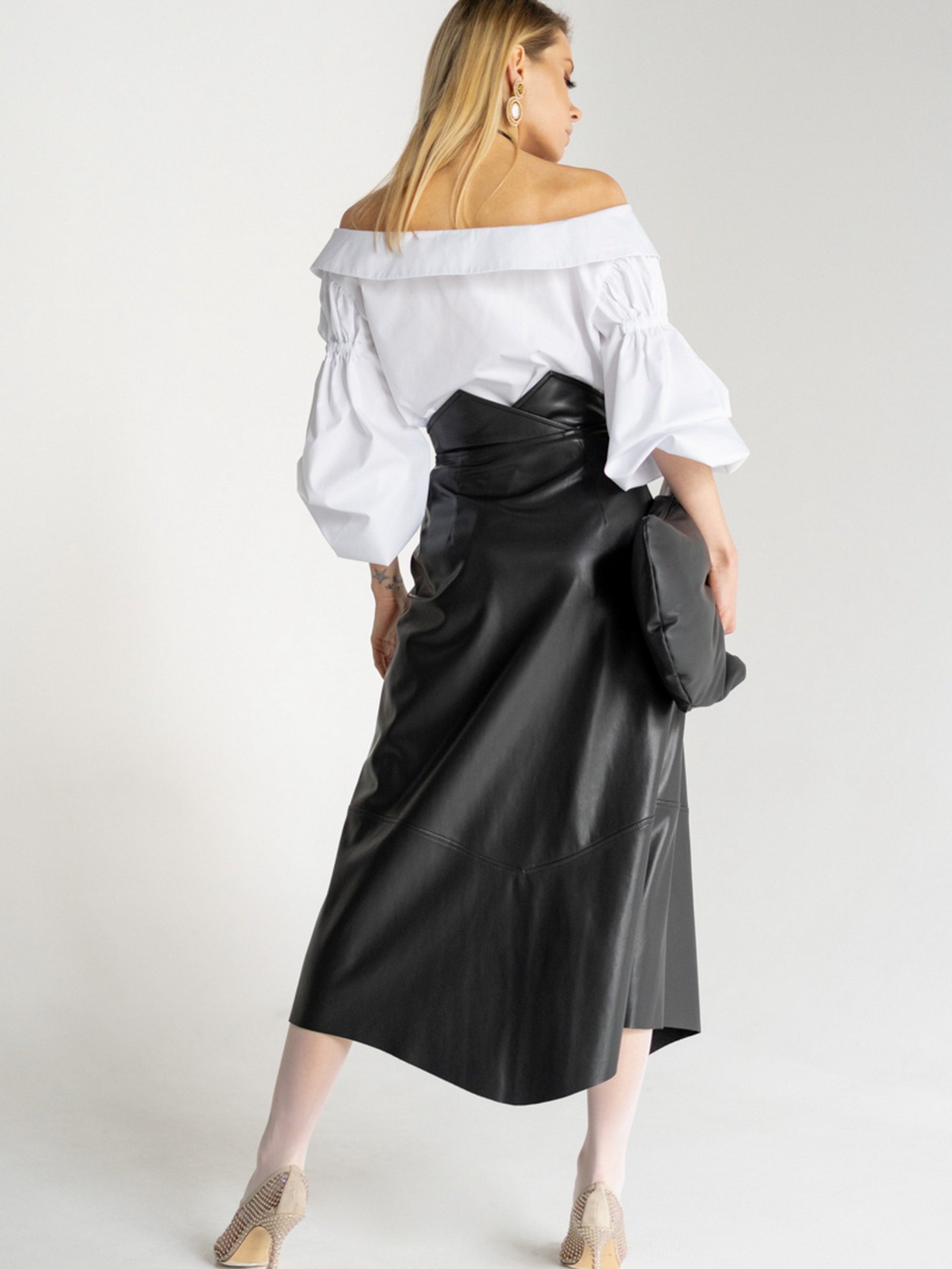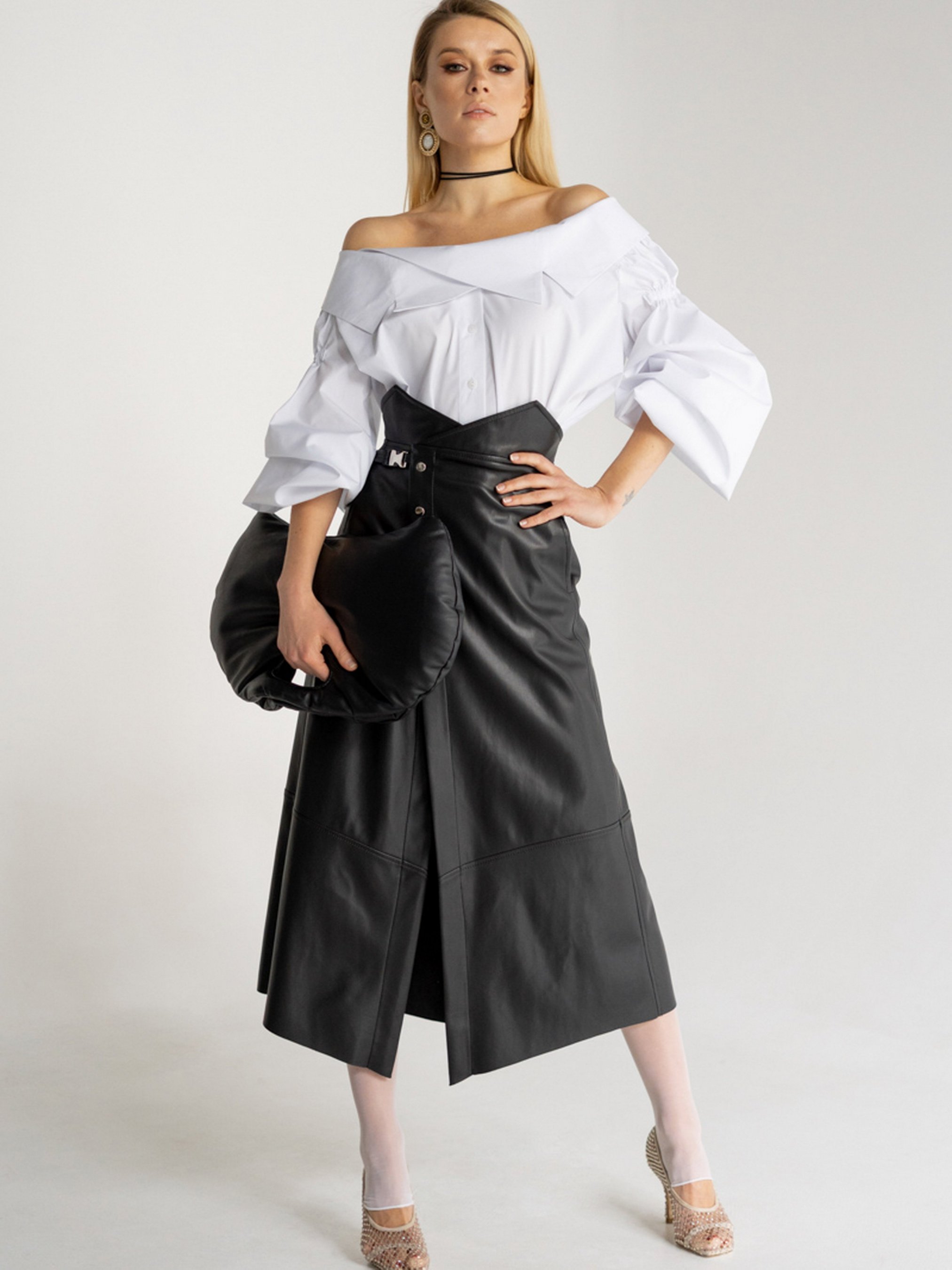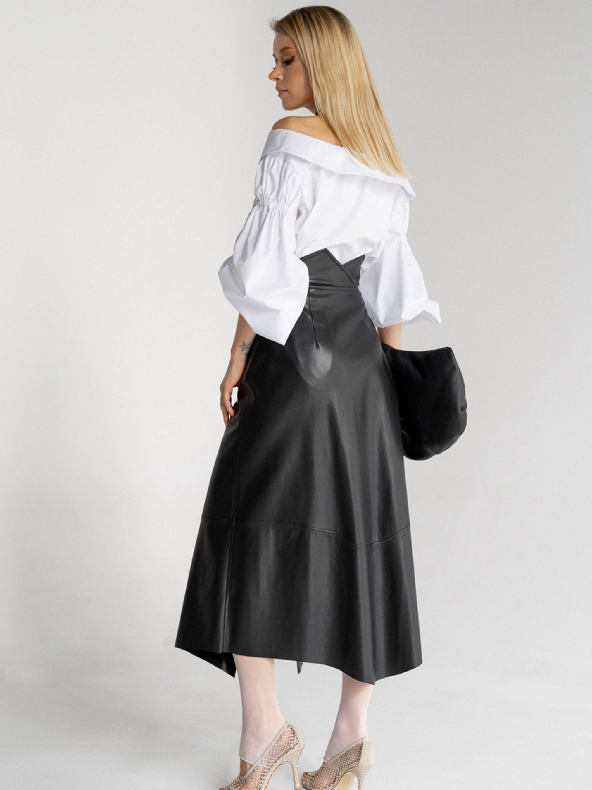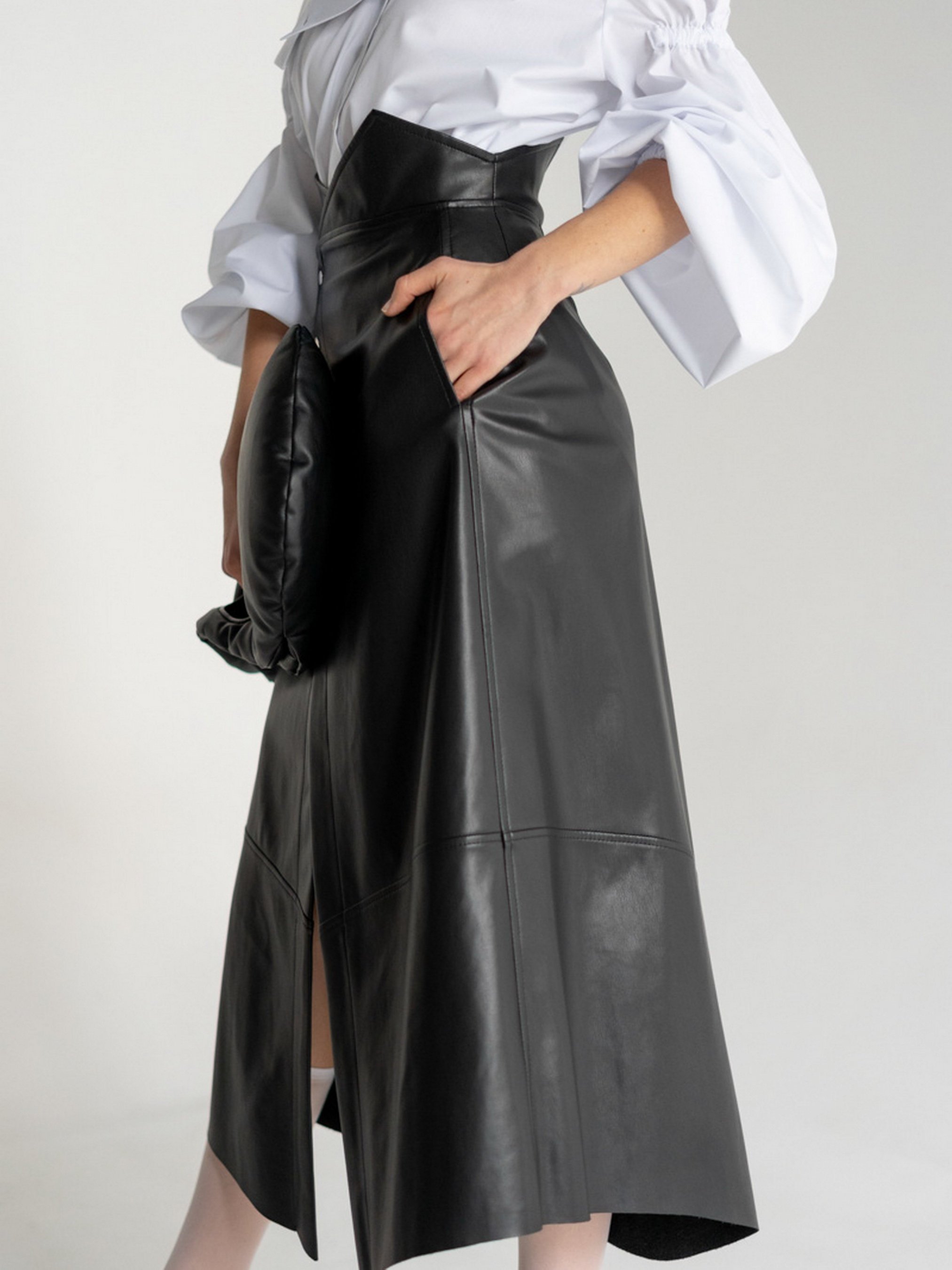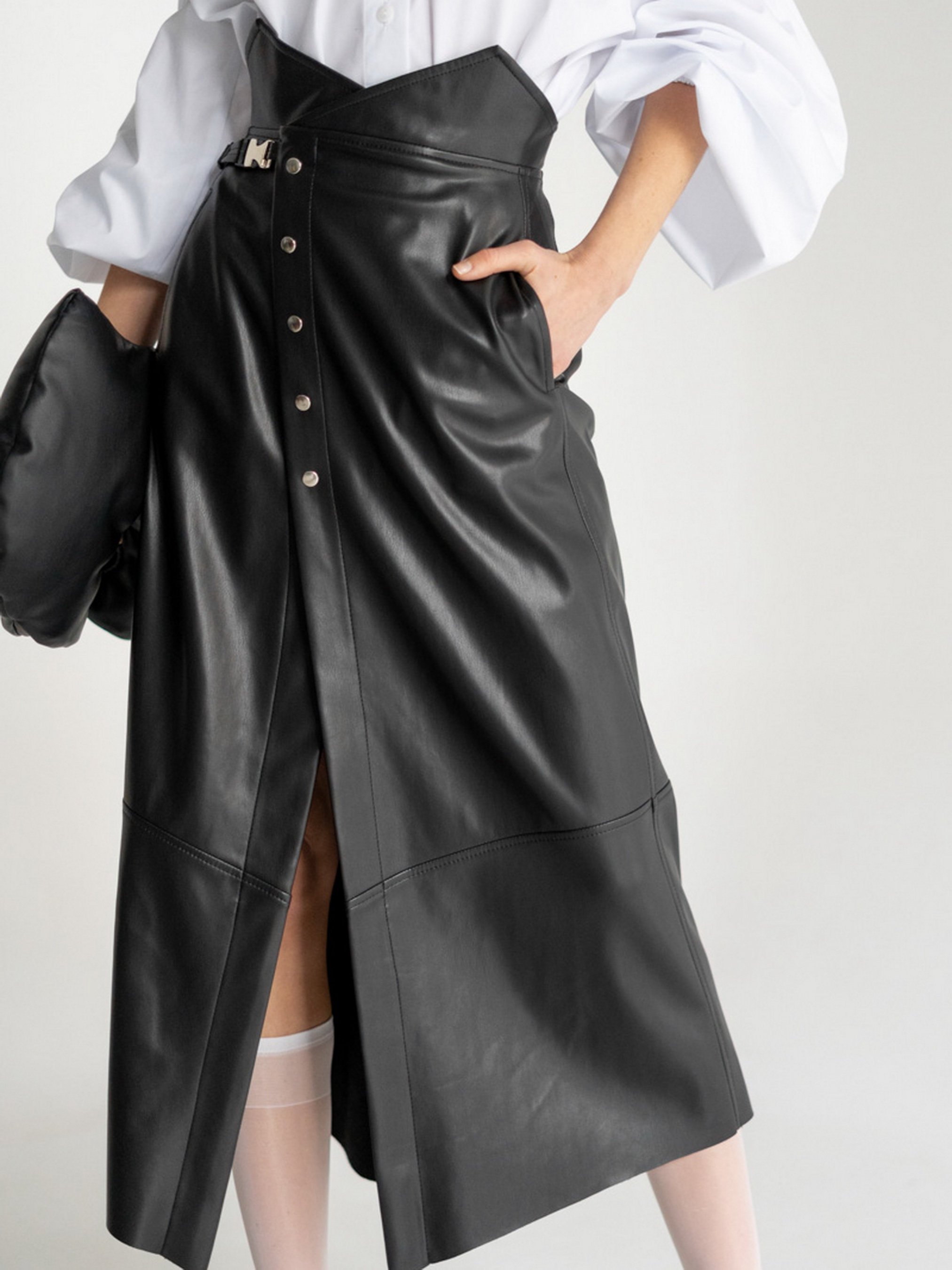 Юбка миди на запах выполнена из искуственной кожи, расширенная к низу.