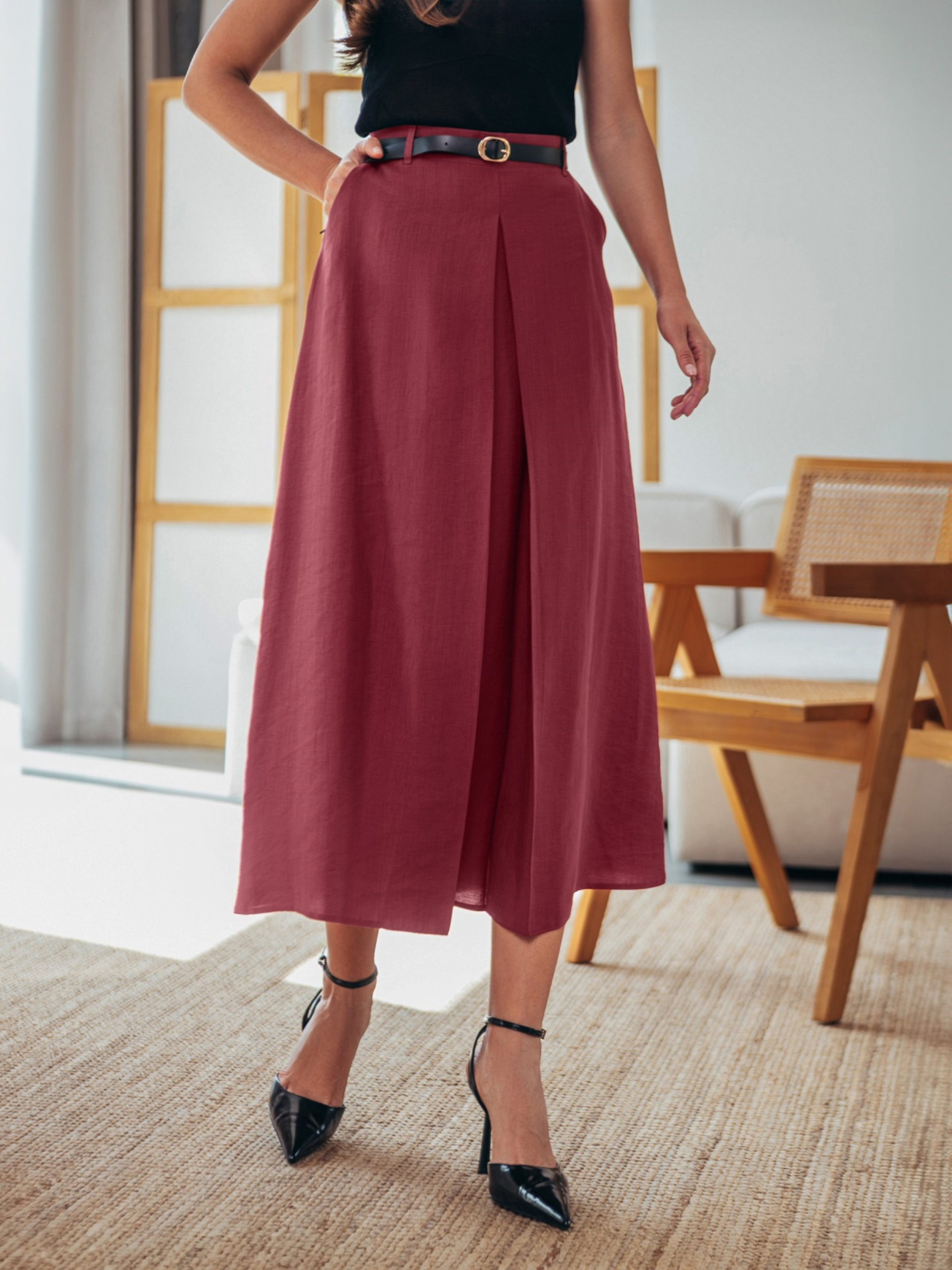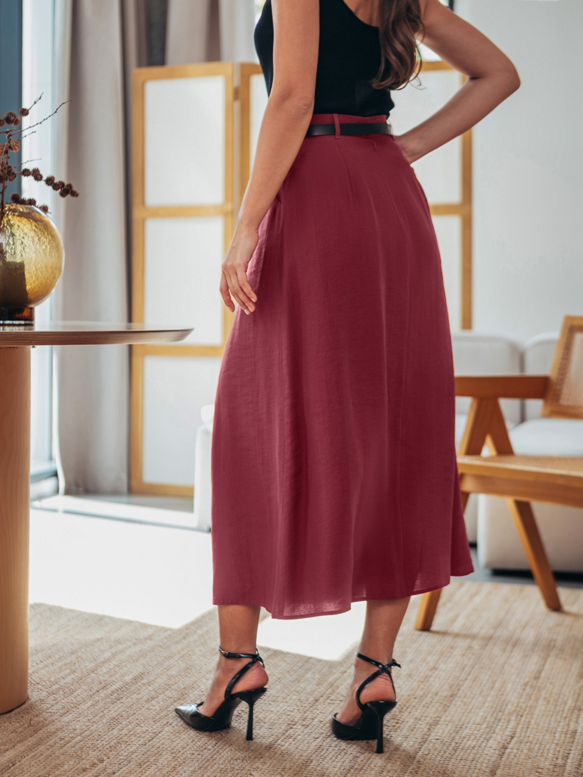 Бордовая юбка миди со складкой спереди модель 75891