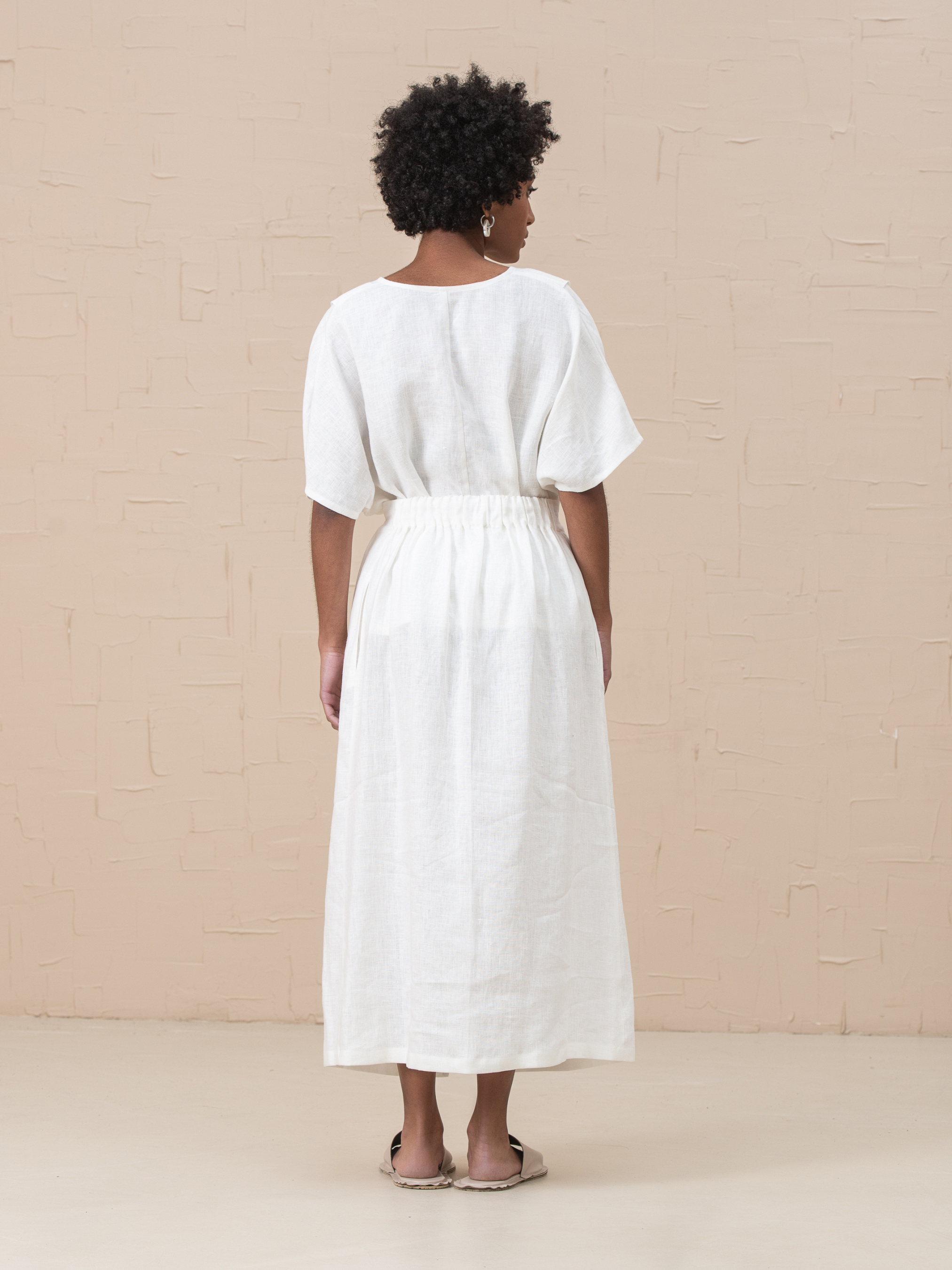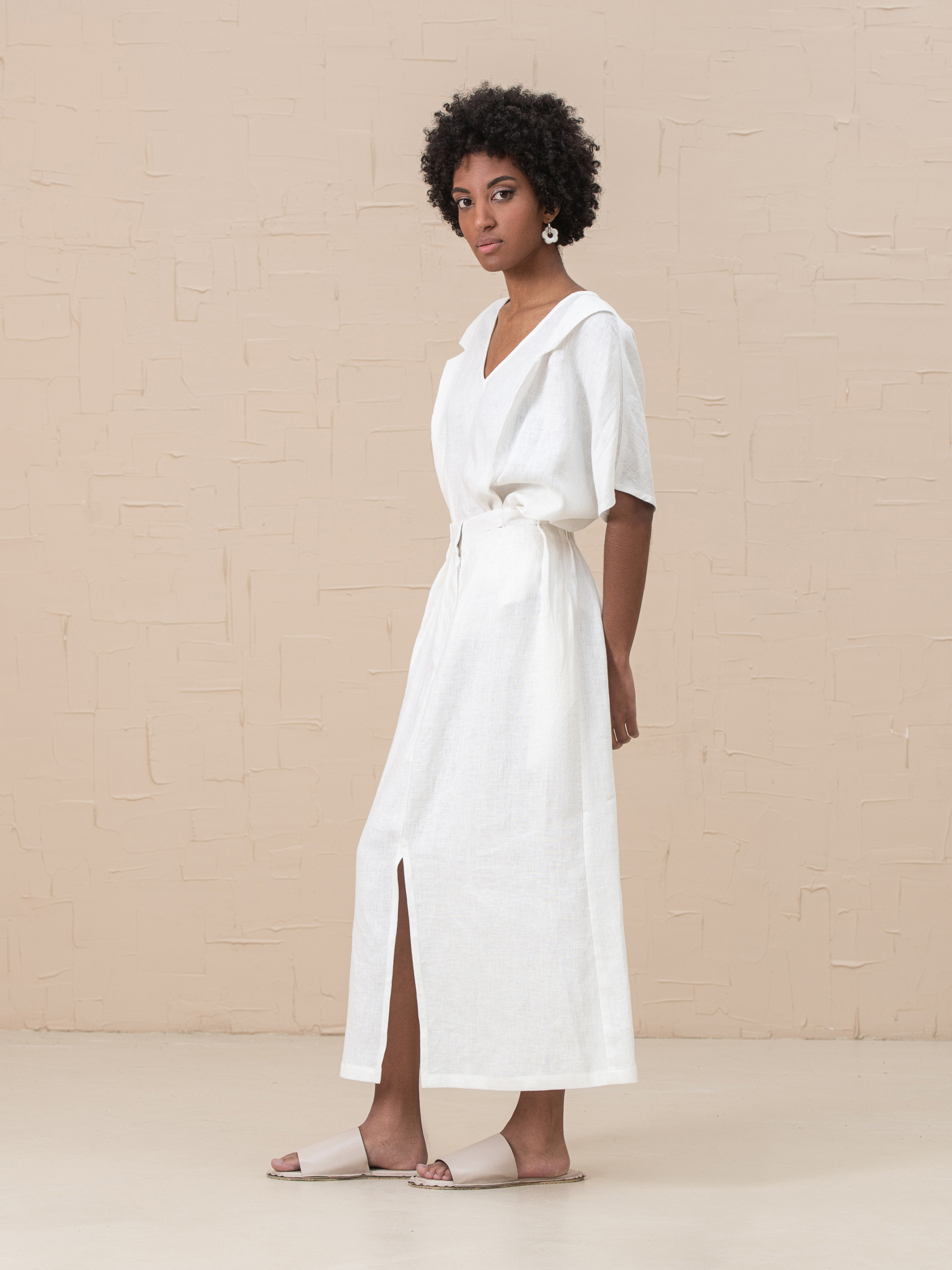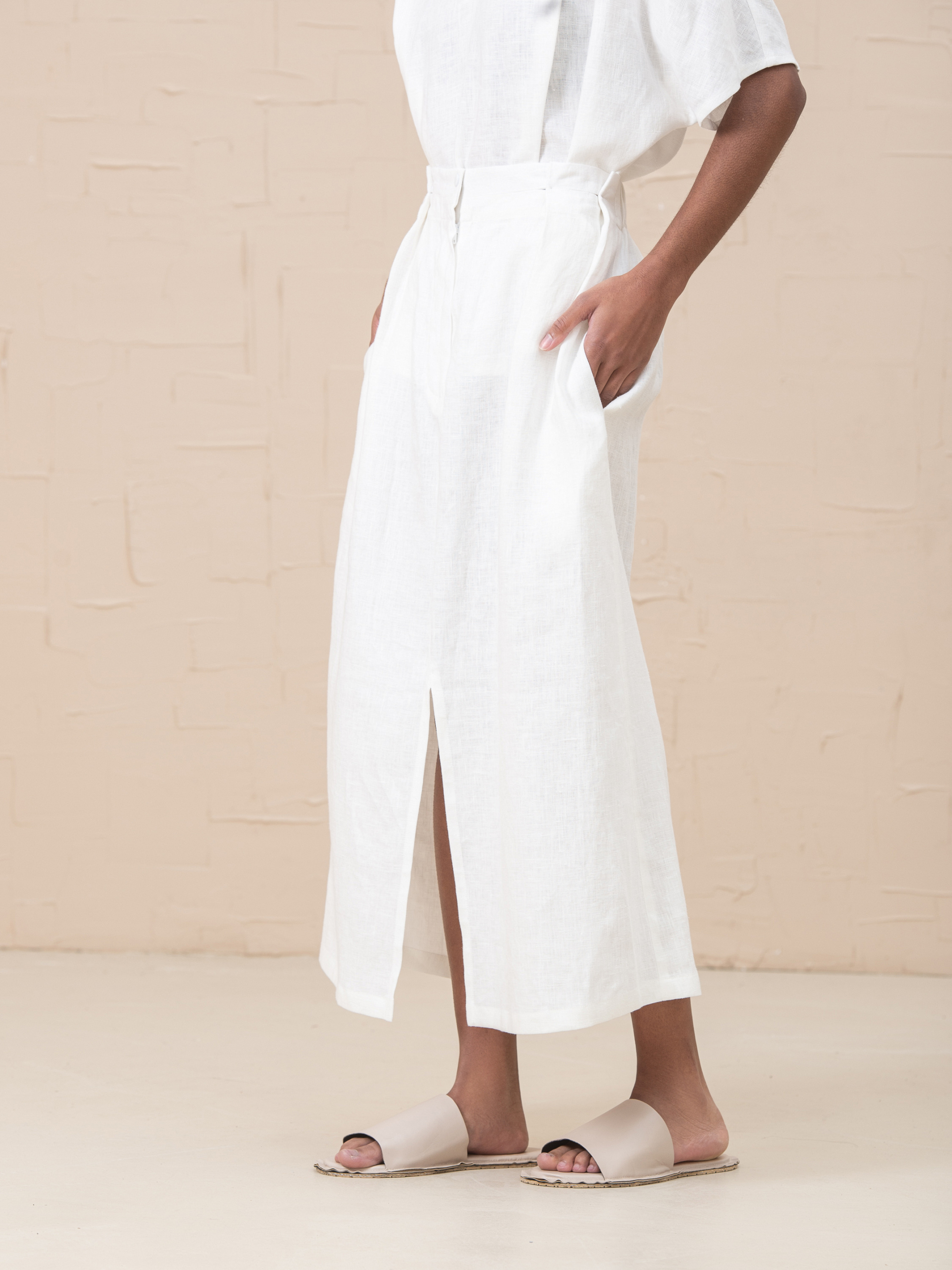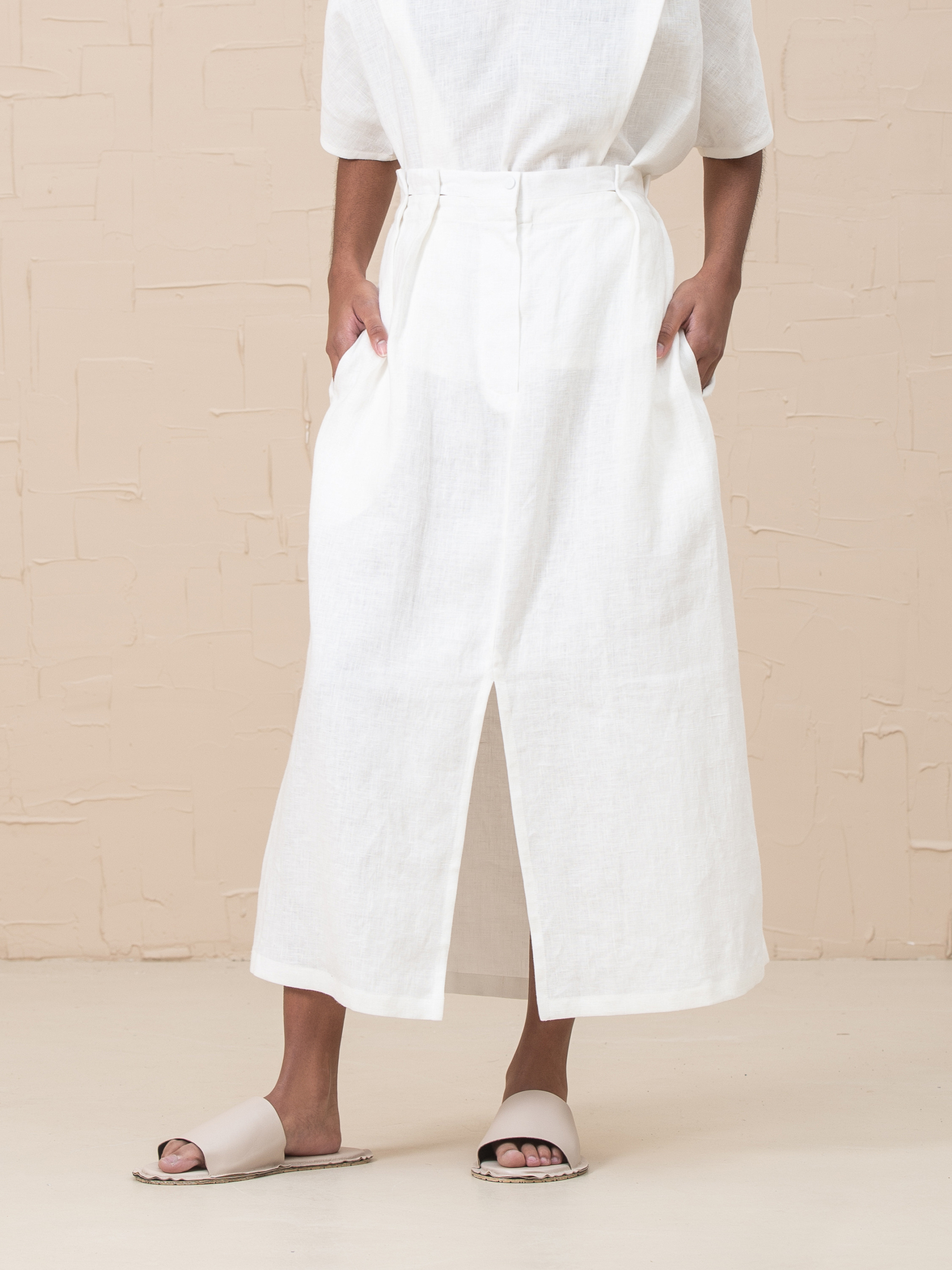 Роскошная юбка Lidia, изготовленная из 100% льна, является обязательной вещью современного гардероба. Высокая талия, застежка на молнию и пуговицы, регулируемые складки на талии для формирования объема талии, функциональные боковые карманы, без подкладки, эластичная задняя часть на резинке, разрез спереди. Размер НК 1 (S-M): Талия 66cm, Талия растянутая 78cm, Бедра 115cm, Длина 88cm. Размер НК 2 (L-XL): Талия 79cm, Талия растянутая 105cm, Бедра 126cm, Длина 88cm.