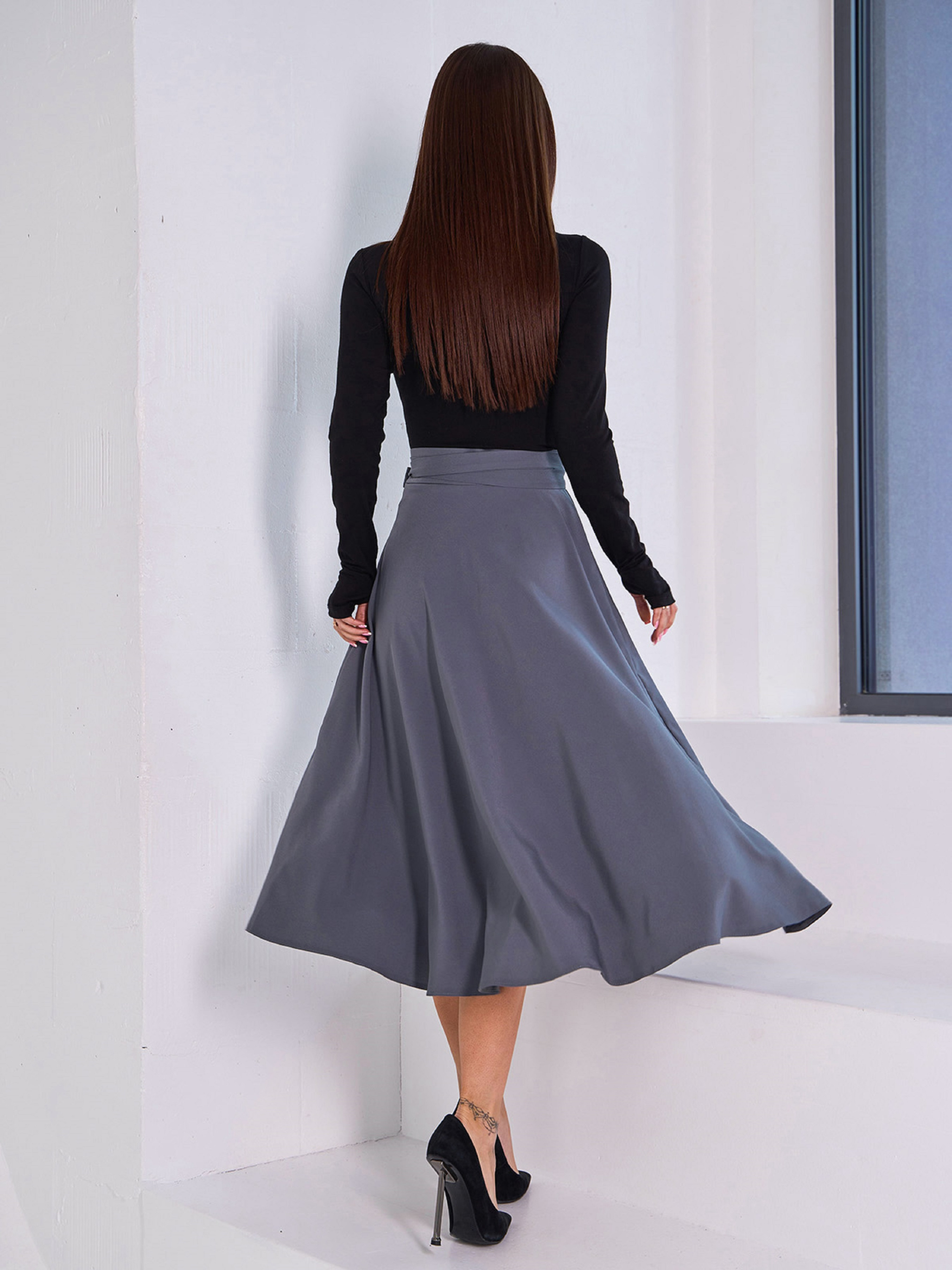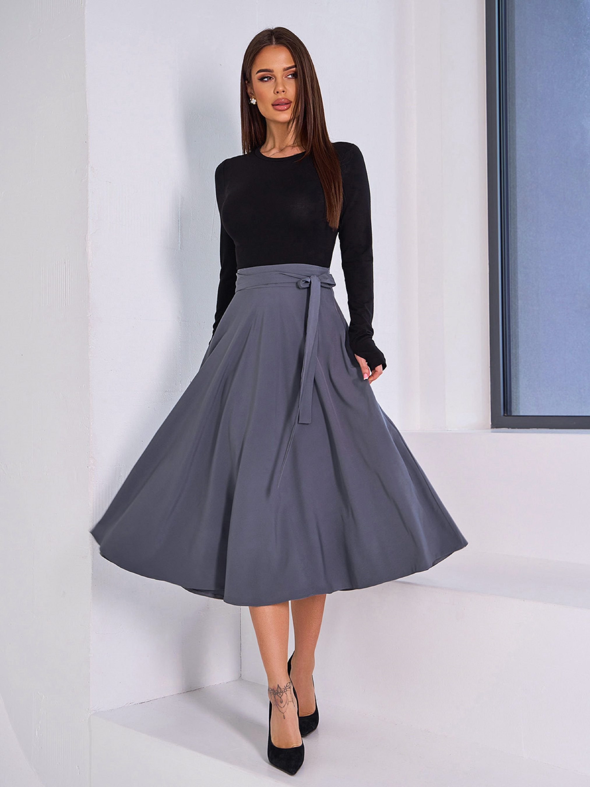 Серая классическая юбка, выполненная из однотонного софта. Модель расклешенного кроя с завязками на поясе и миди длиной. Юбка на молнии. Полуобхват: Талия: S (33), M (35), L (37), XL (39), Бедра: S (76), M (78), L (80), XL (82), Длина изделия - 78, Ткань: Низкой эластичности.