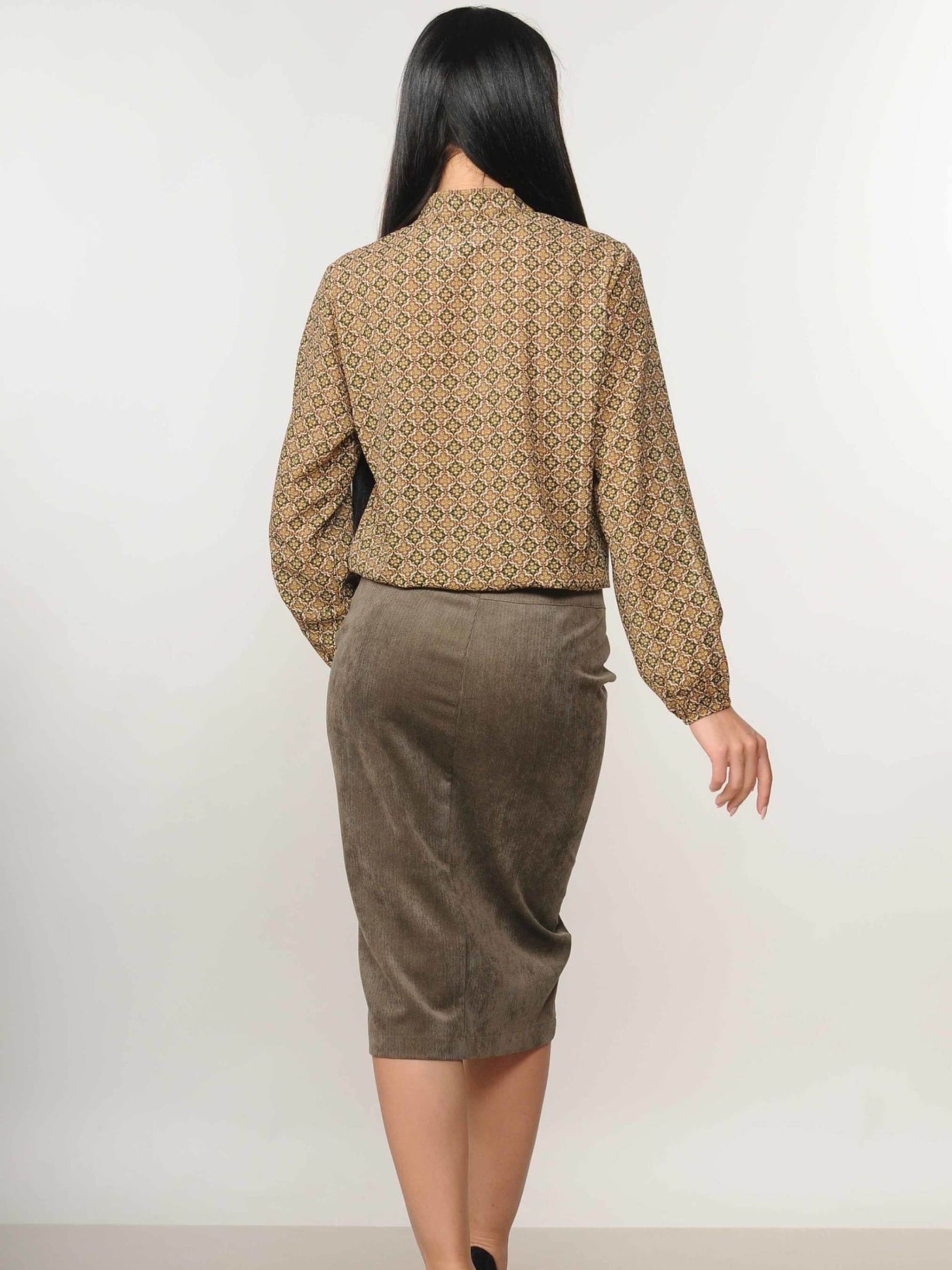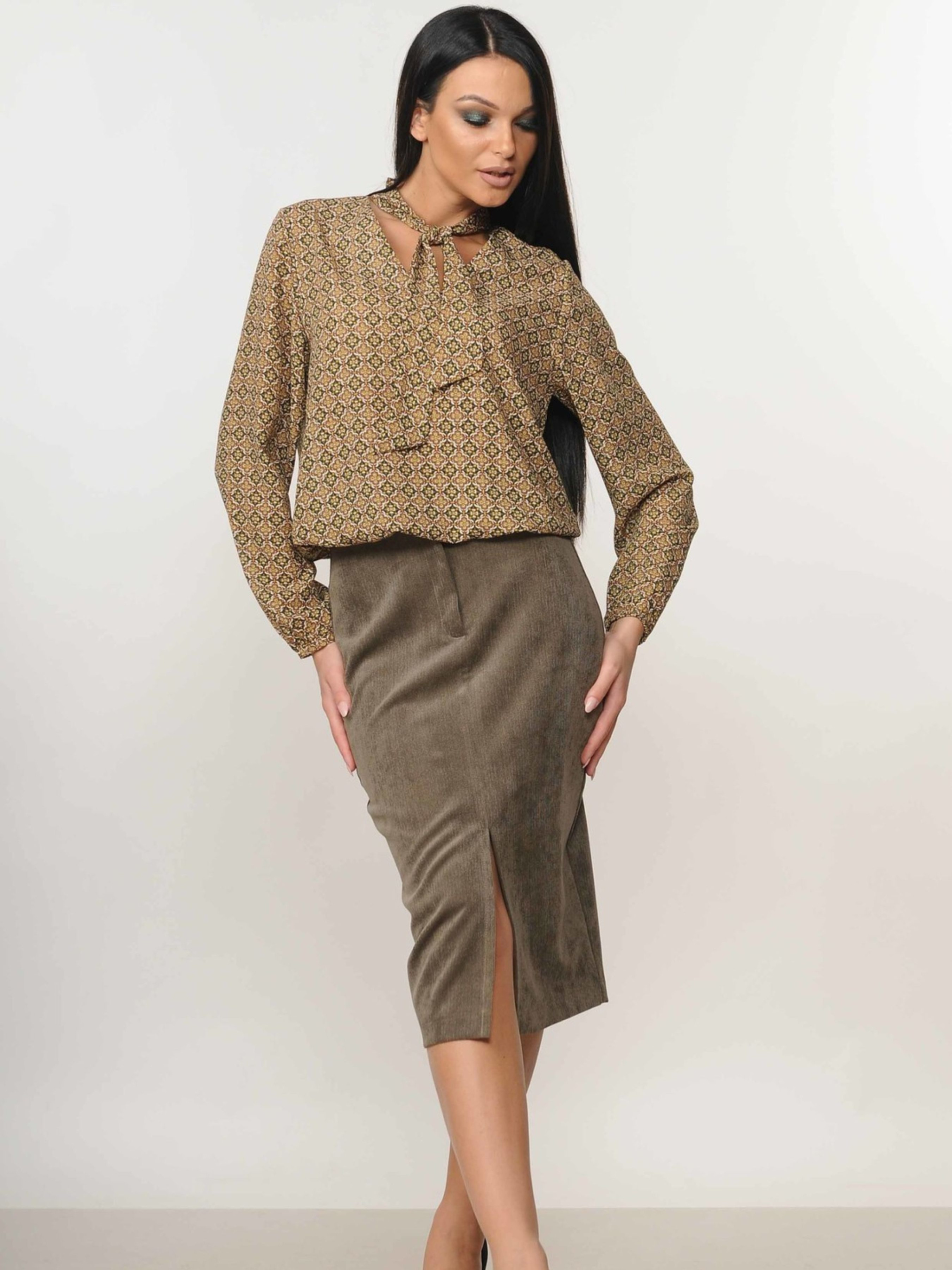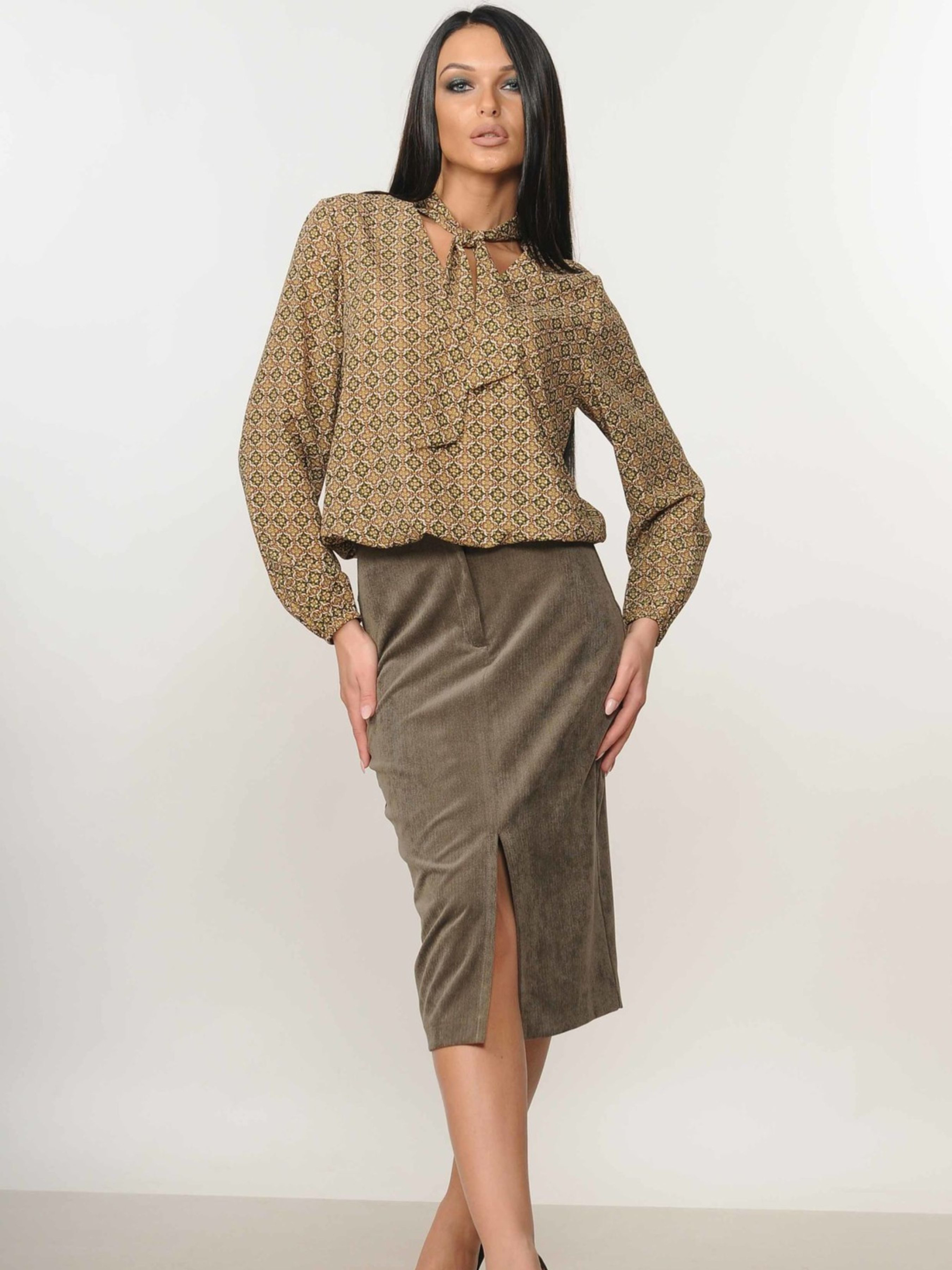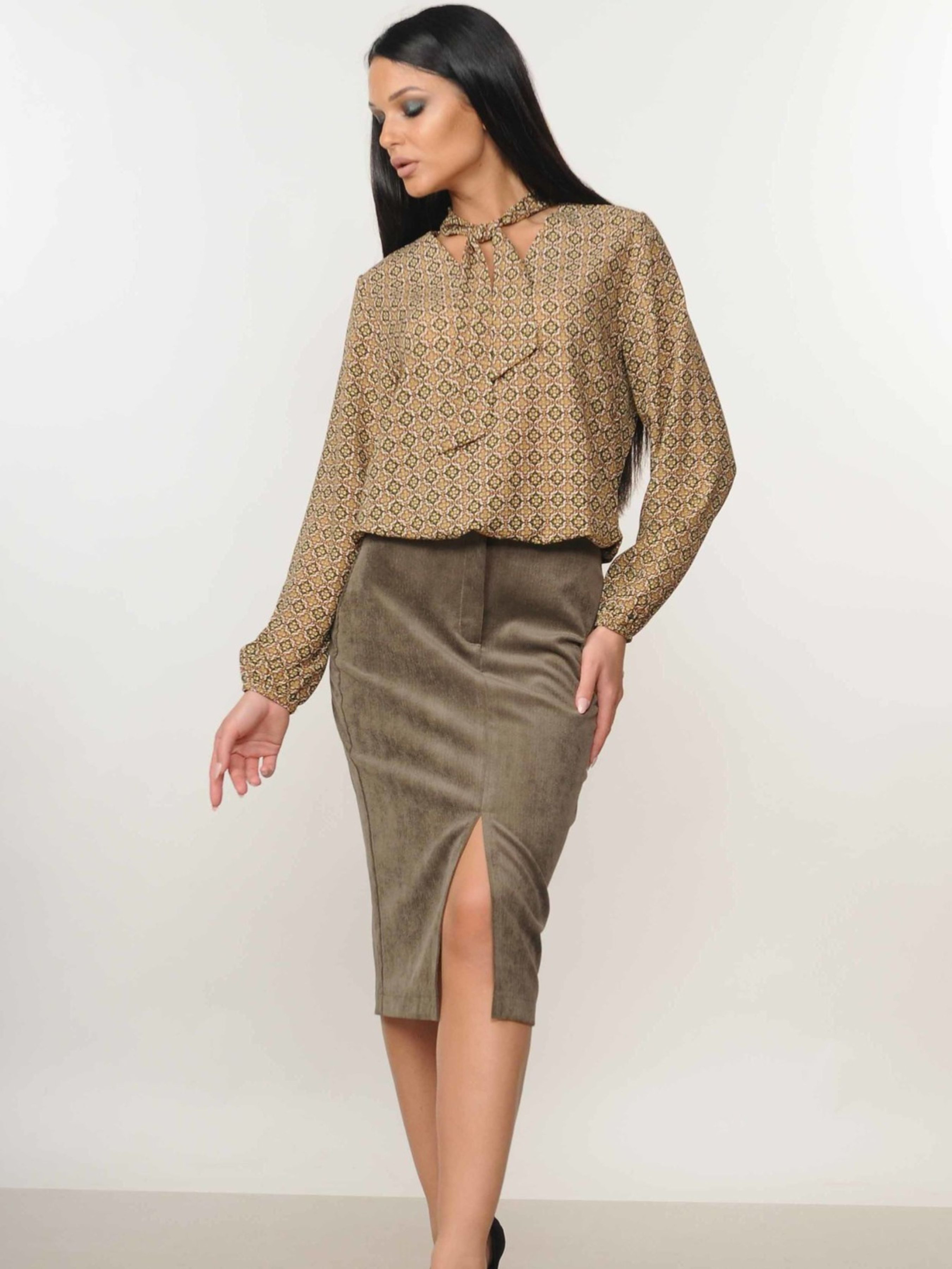 Спідниця-олівець міді-довжини спокусливо підкреслить вашу фігуру, додаючи елегантності кожному образу. Її особливістю є розріз, розташований у передньому центральному шві, який не лише є стильним акцентом, але й забезпечує свободу рухів. Ця універсальна спідниця чудово комбінується як з класичними блузами, створюючи витончений діловий стиль, так і з романтичними топами, підкреслюючи жіночність. Завдяки своєму крою та довжині, спідниця-олівець міді вигідно представляє силует, роблячи акцент на талії та стегнах. Виготовлена з м'якого вельвету, вона приємна на дотик та комфортна у носінні. Ця спідниця стане цінним доповненням вашого гардеробу, дозволяючи створювати безліч стильних та елегантних комбінацій. Характеристики: Матеріал: Вельвет (50% поліестер, 50% віскоза) Крій: Олівець Довжина: Міді Деталі: Розріз у передньому центральному шві Стиль: Спокусливий, елегантний, класичний, романтичний Властивості: Підкреслює фігуру, універсальна у поєднанні
