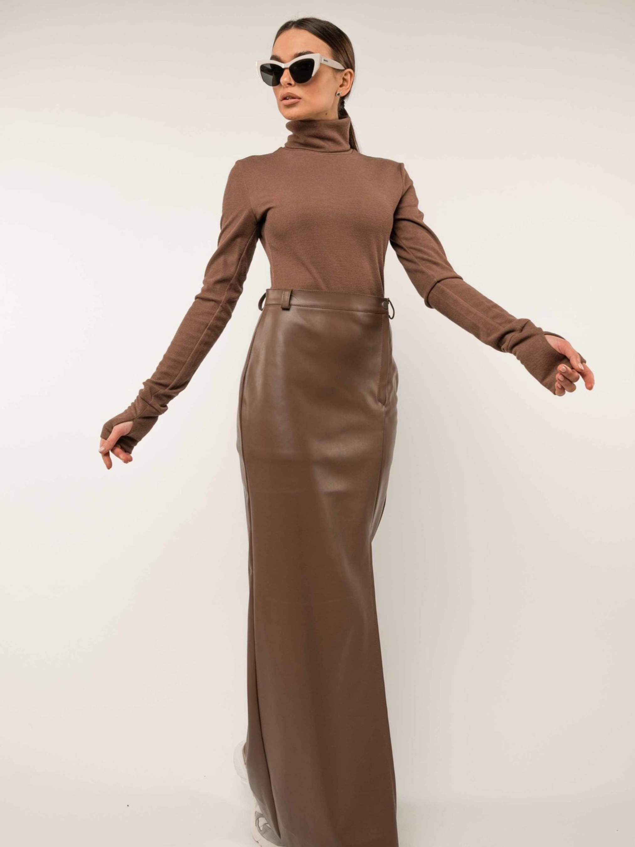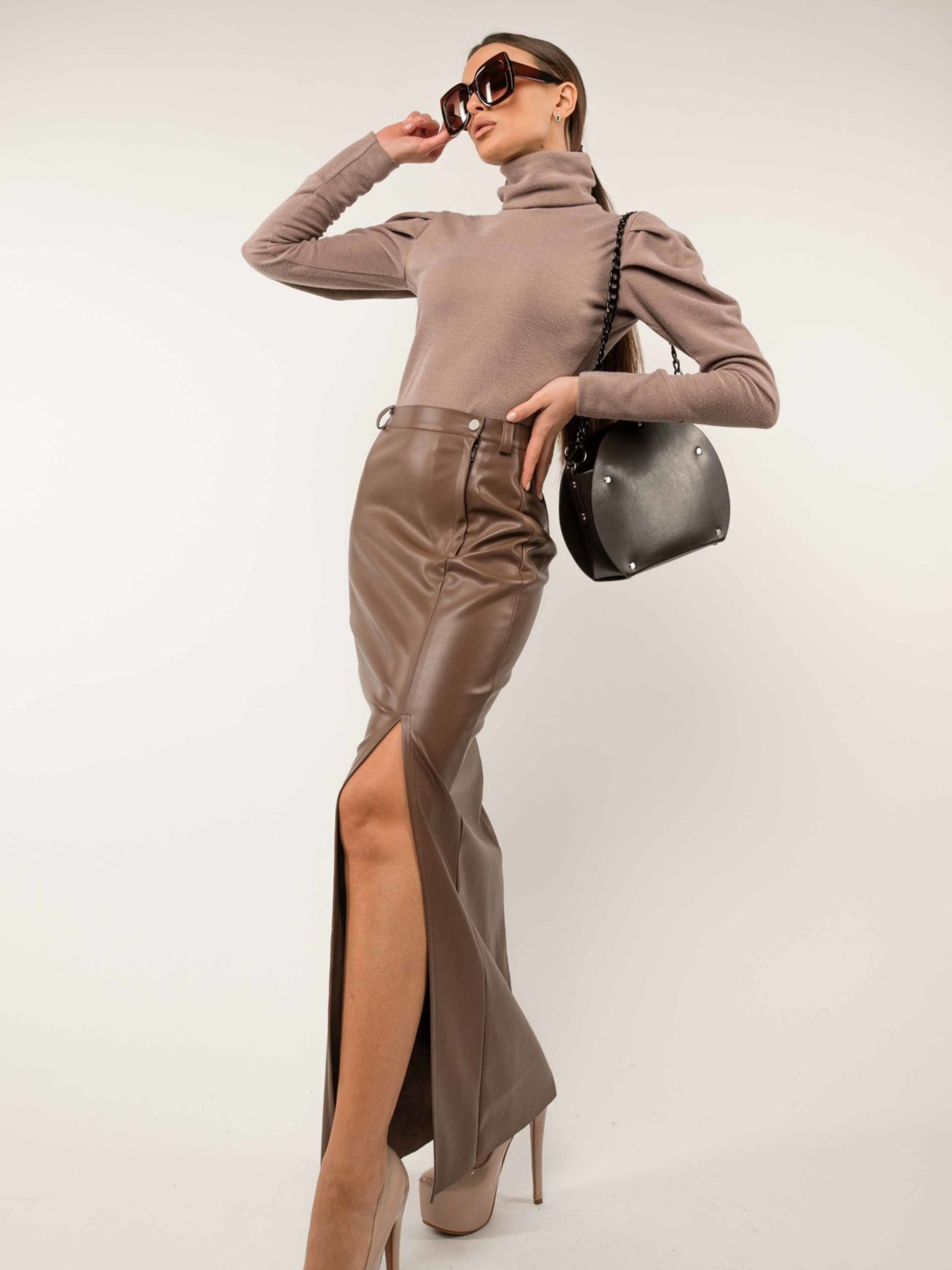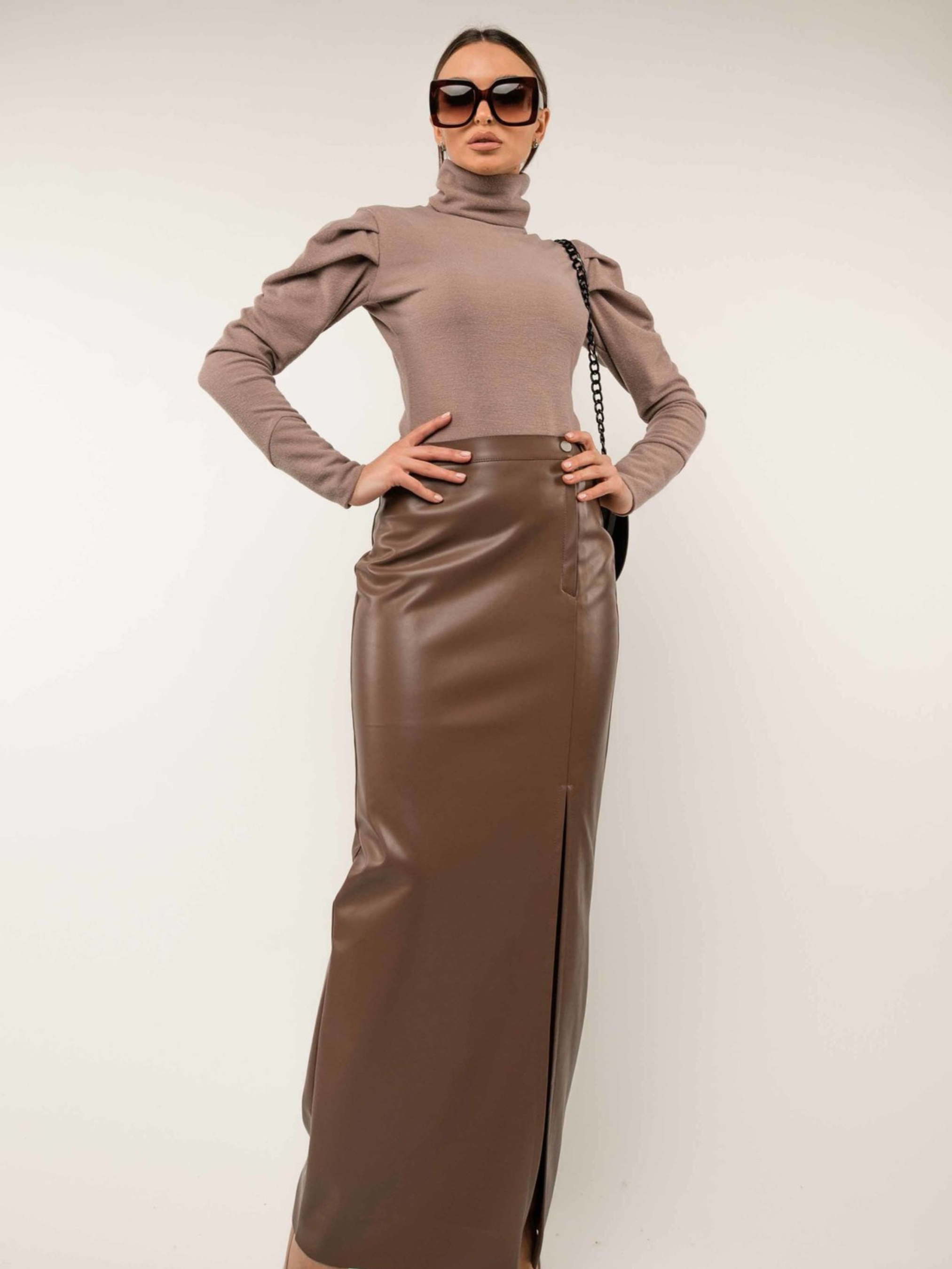 Стильна повсякденна спідниця прилеглого силуету елегантної максі довжини стане виразним елементом вашого гардеробу. По передньому полотнищу розташований зміщений до лівого бокового шва розріз, що додає образу пікантності та забезпечує свободу рухів. Застібка оброблена гульфіком, а практичний пояс доповнений шльовками для можливого використання ременя. Спинка спідниці має акуратний середній шов та чотири виточки біля талії, що забезпечують ідеальну посадку по фігурі. Виготовлена з якісної екошкіри на замшевій основі, ця спідниця поєднує стильний зовнішній вигляд, приємні тактильні відчуття та практичність у носінні. Її трендовий дизайн та універсальна довжина дозволять вам створювати чарівні образи для будь-якого сезону. Характеристики: Матеріал спідниці: Екошкіра на замшевій основі (34% віскоза, 56% поліестер, 10% бавовна) Крій: Прилеглий силует Довжина: Максі Пояс: Зі шльовками Деталі: Зміщений розріз до лівого бокового шва на передньому полотнищі, чотири виточки біля талії на спинці Застібка: Гульфік на передньому полотнищі Стиль: Стильний, повсякденний, трендовий, елегантний Властивості: Комфортна екошкіра, підкреслює фігуру, універсальна для різних сезонів