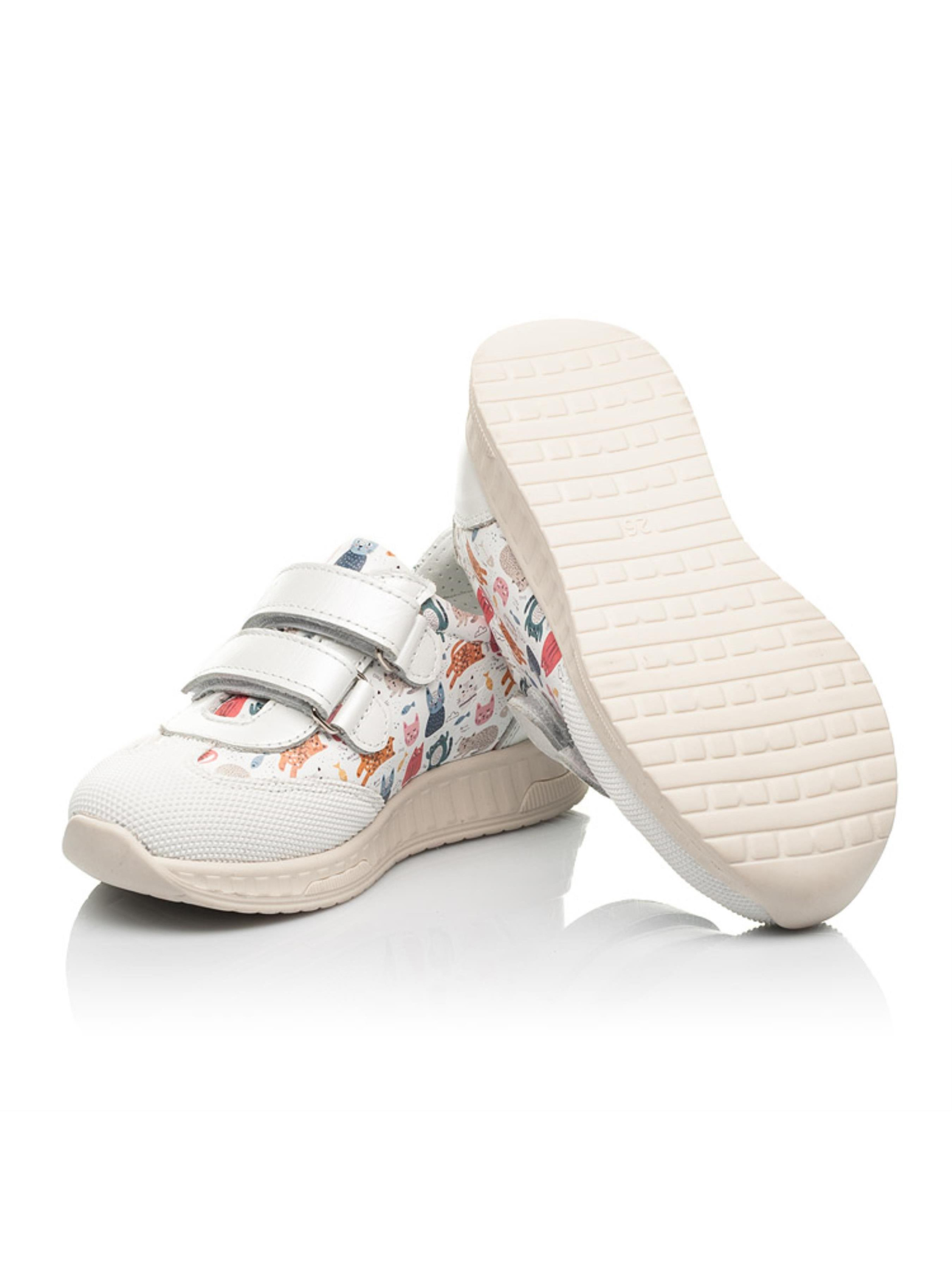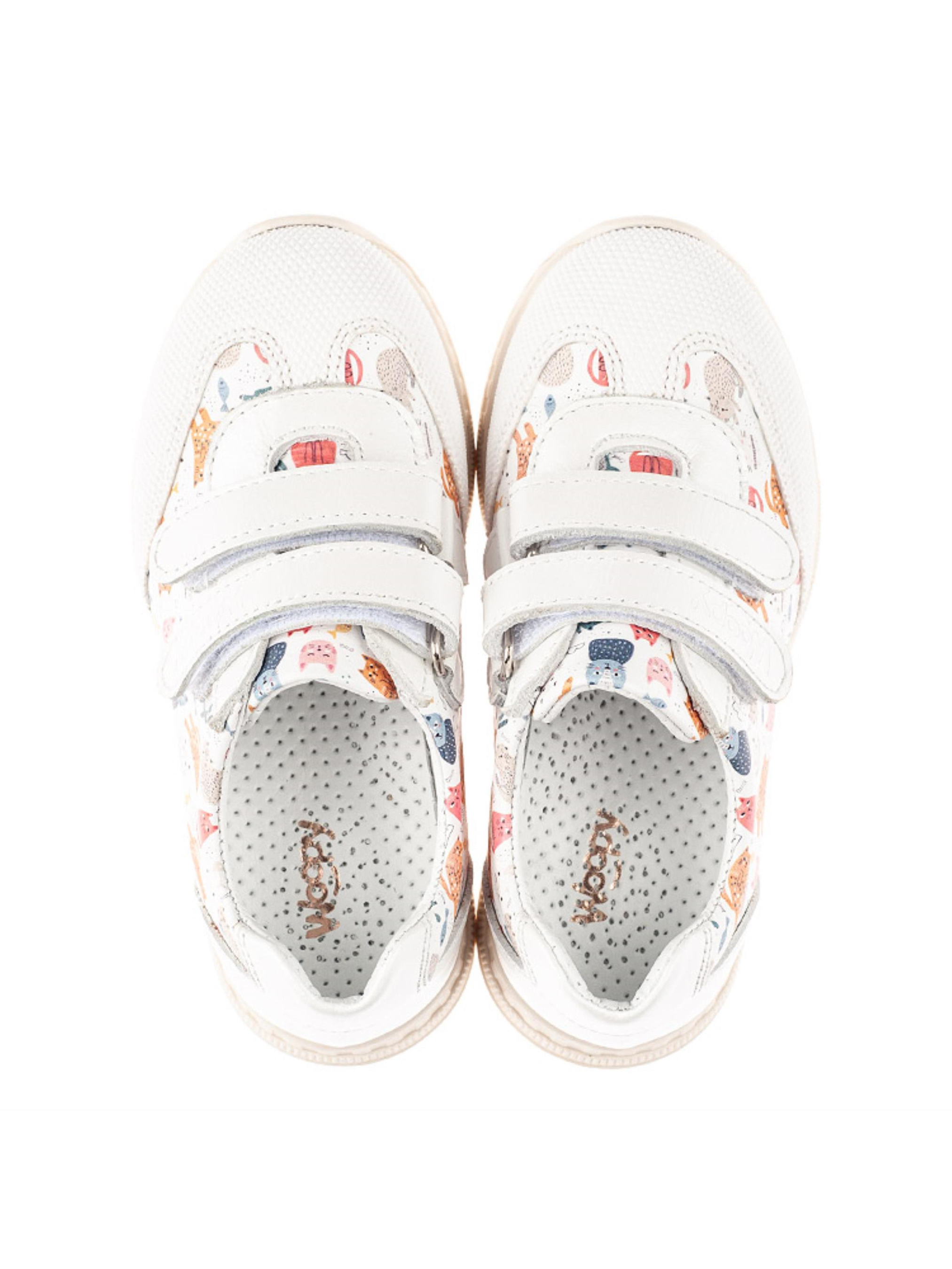 Нежные кроссовки для девочки в первую очередь поражают невероятным дизайном с изображением котиков. Детские кроссовки для девочки от бренда Woopy поразят Вашу девочку и комфортом. Детские кроссовки пошиты из натуральной кожи белого цвета, материал подкладки и стельки – натуральная гладкая кожа. Удобство и скорость обувания обеспечат застежки-липучки. Подошва в кроссовках отлита из качественной термопластичной резины, она легкая и гибкая. Детские кроссовки для девочки имеют жесткий задник, супинатор, комфортную анатомически правильную стельку. Смело можете выбирать такую модель кроссовок для своей активной девочки, ведь носочек защищен популярной вставкой "неубивайкой" от механических повреждений и царапин.