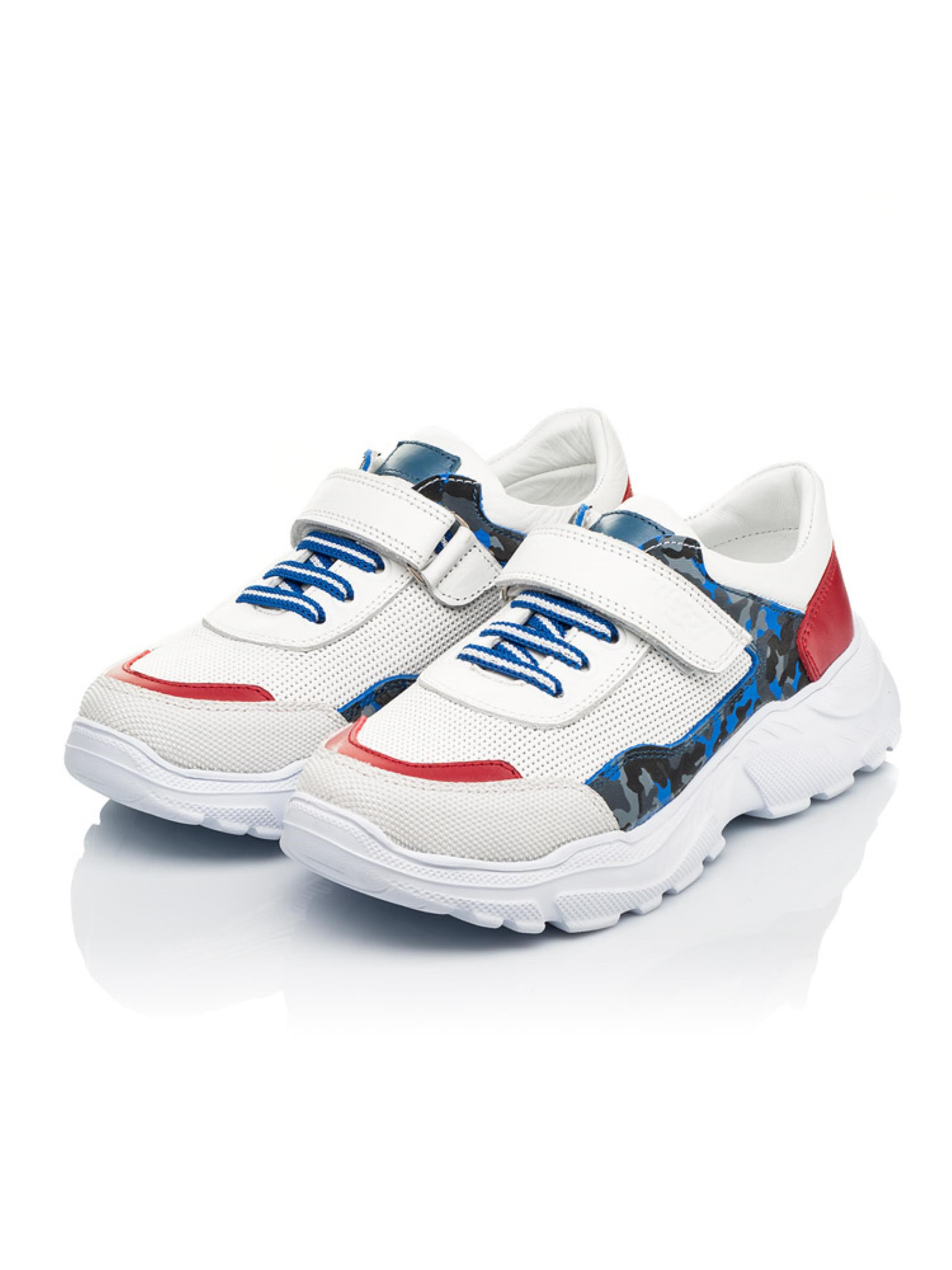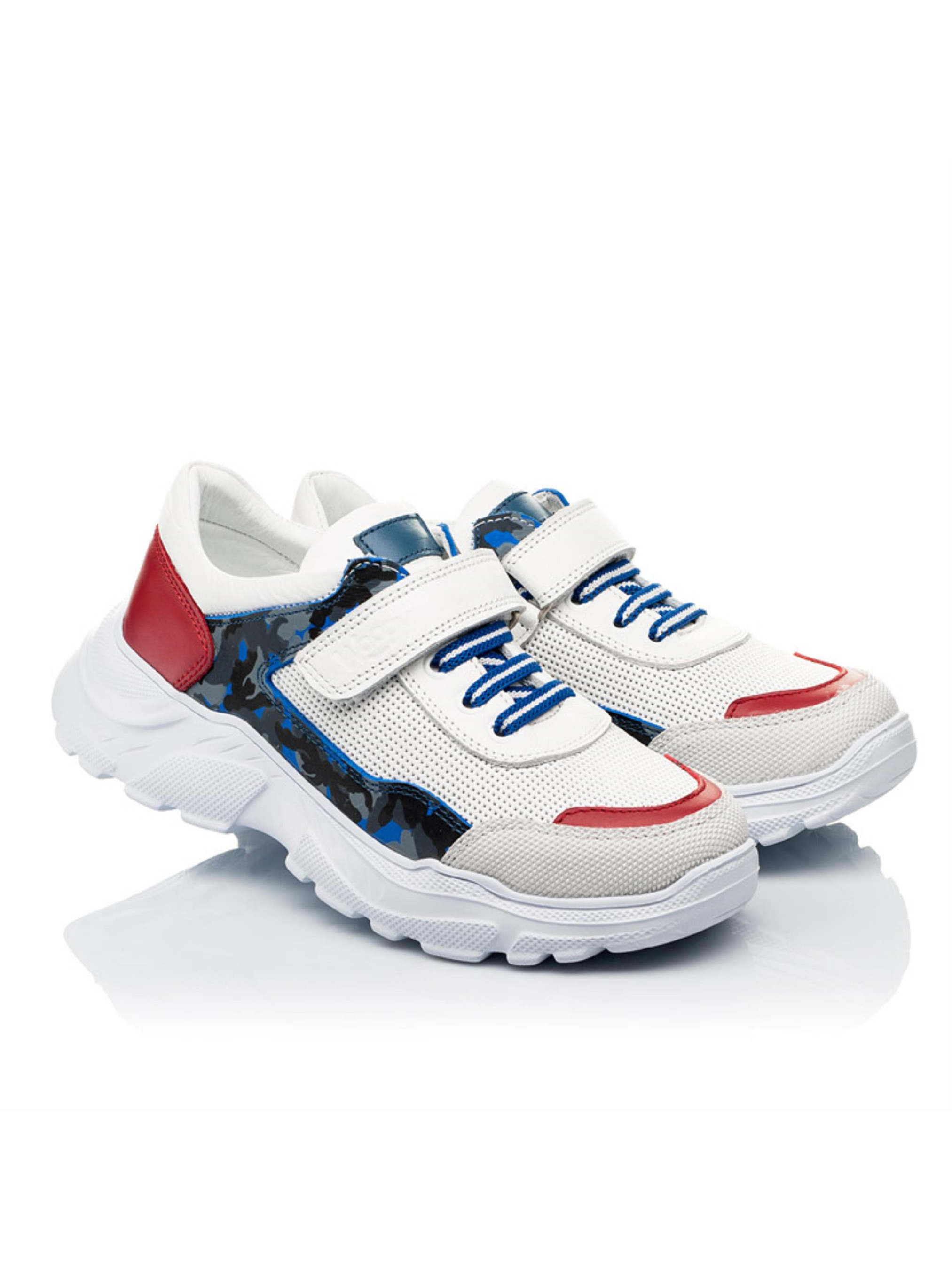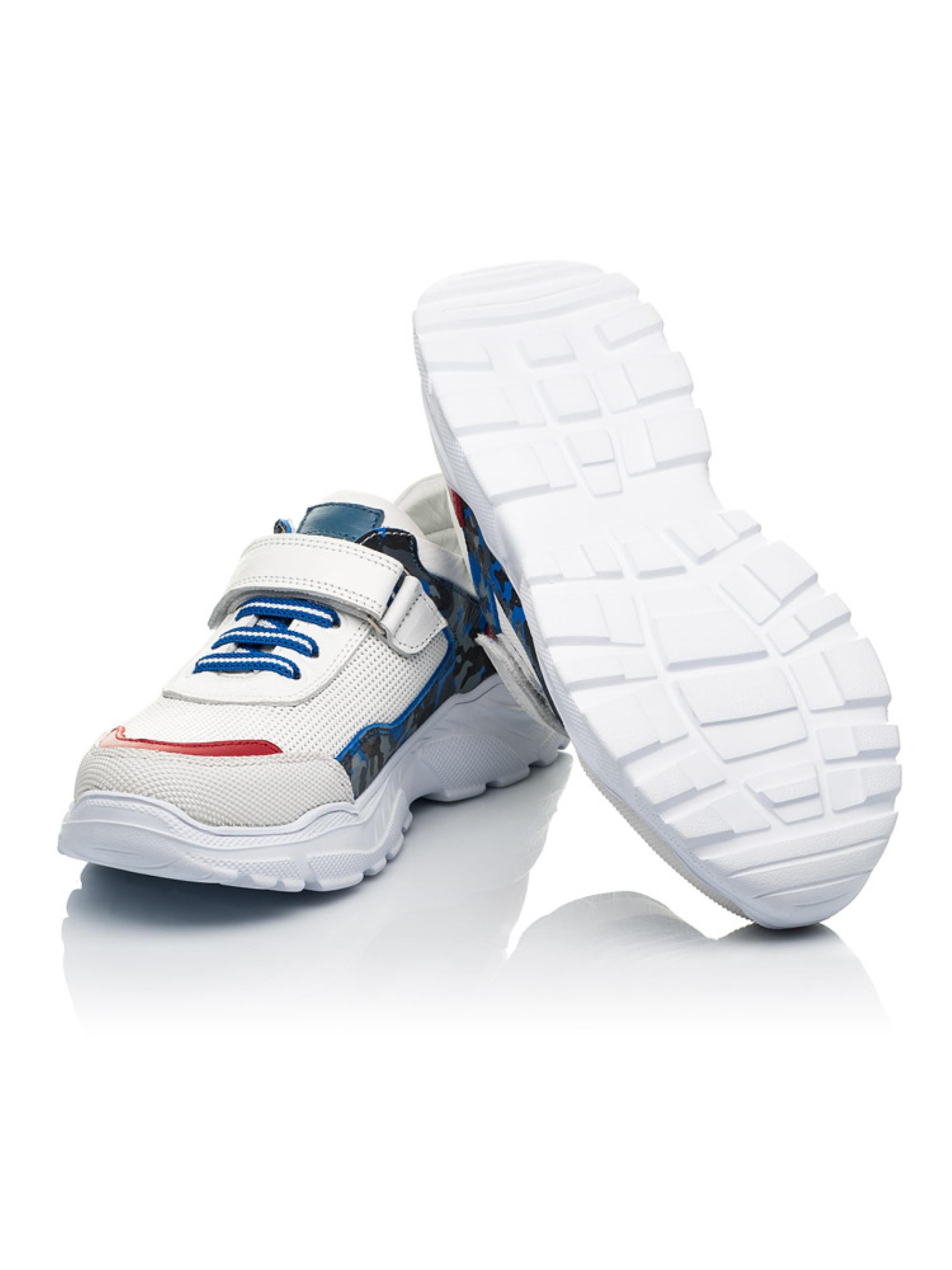 Оригинальная модель кроссовок для мальчика создана на основе контраста материалов и фактуры. В дизайне искусно сочетается натуральная кожа белого цвета с перфорацией в верхних слоях кожи в виде сеточки. Дизайн модели стильно дополнен вставками из натуральной кожи контрастного красного цвета и вставкой из натурального нубука серо-синего цвета. Детские кроссовки для мальчика имеют анатомически правильную стельку с супинатором под свод стопы и жесткий задник. В качестве застежки для ускорения процесса обувания предусмотрена надежная застежка-липучка, которая дополнена шнурком-резинкой. Подошва в кроссовках очень легкая, отлитая из качественного термоэластопласта. Носовая часть защищена современным искусственным материалом "неубивайкой".