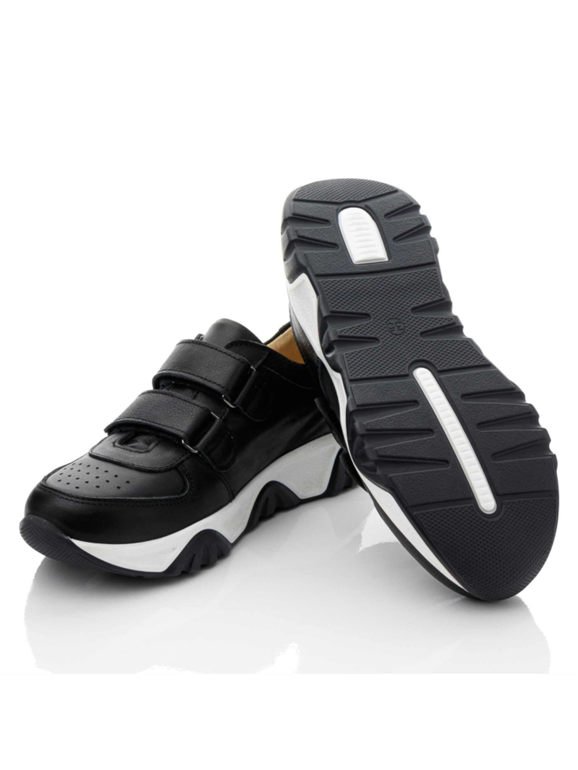 Трендовая подошва в таком исполнении уже покорила не одно сердце активных модников и не удивительно. Очень стильный дизайн модели кроссовок гармонично сочетается с комфортными элементами обуви и качеством материалов. Детские кроссовки для мальчика пошиты из натуральной кожи классического черного цвета и дополнены вставкой из нубука. Внутри кроссовки полностью кожаные, имеют комфортную анатомическую стельку с подушечкой под свод стопы, твердый задник. Для облегчения обувания в качестве застежки в этой модели используются надежные липучки.