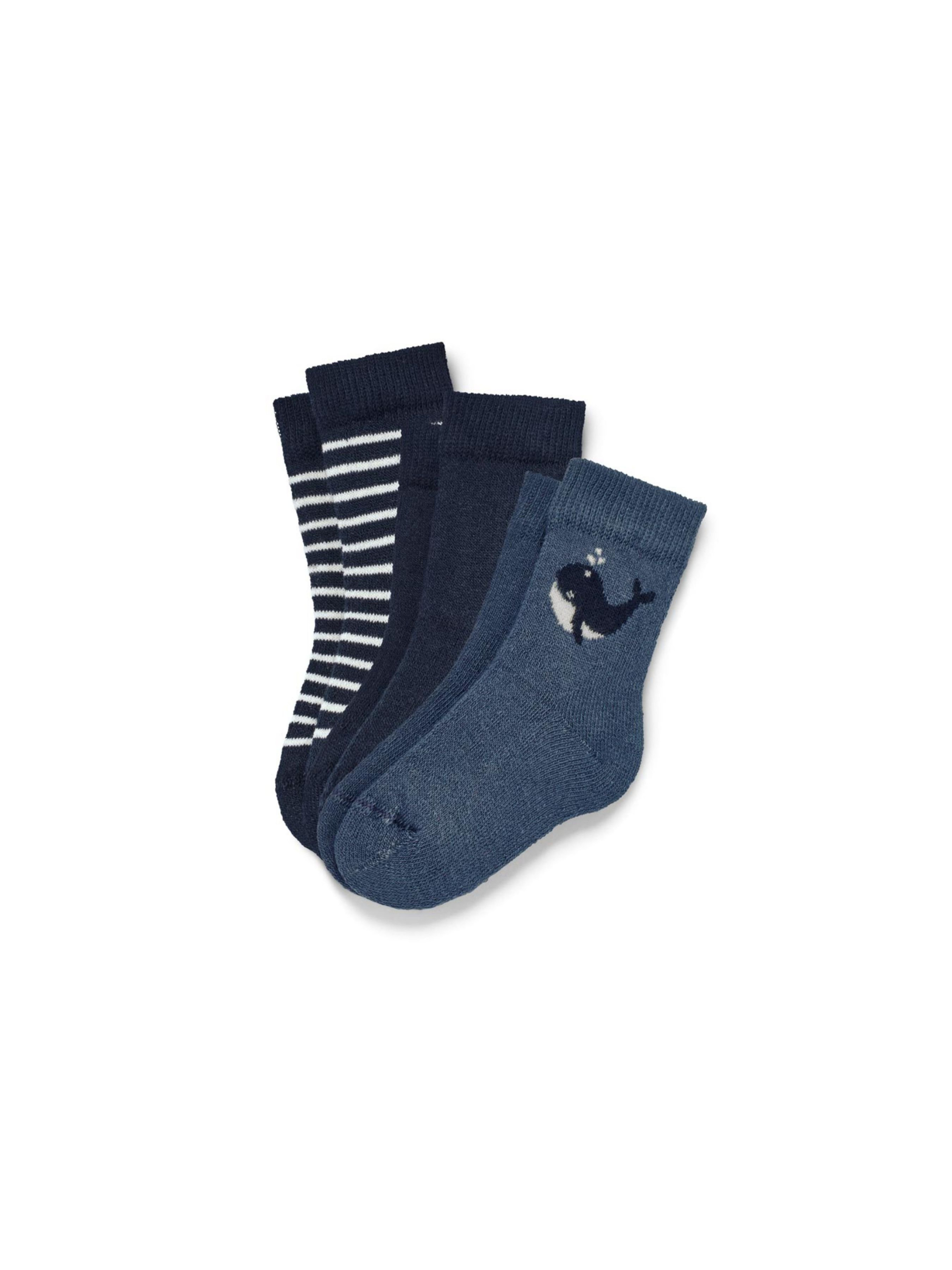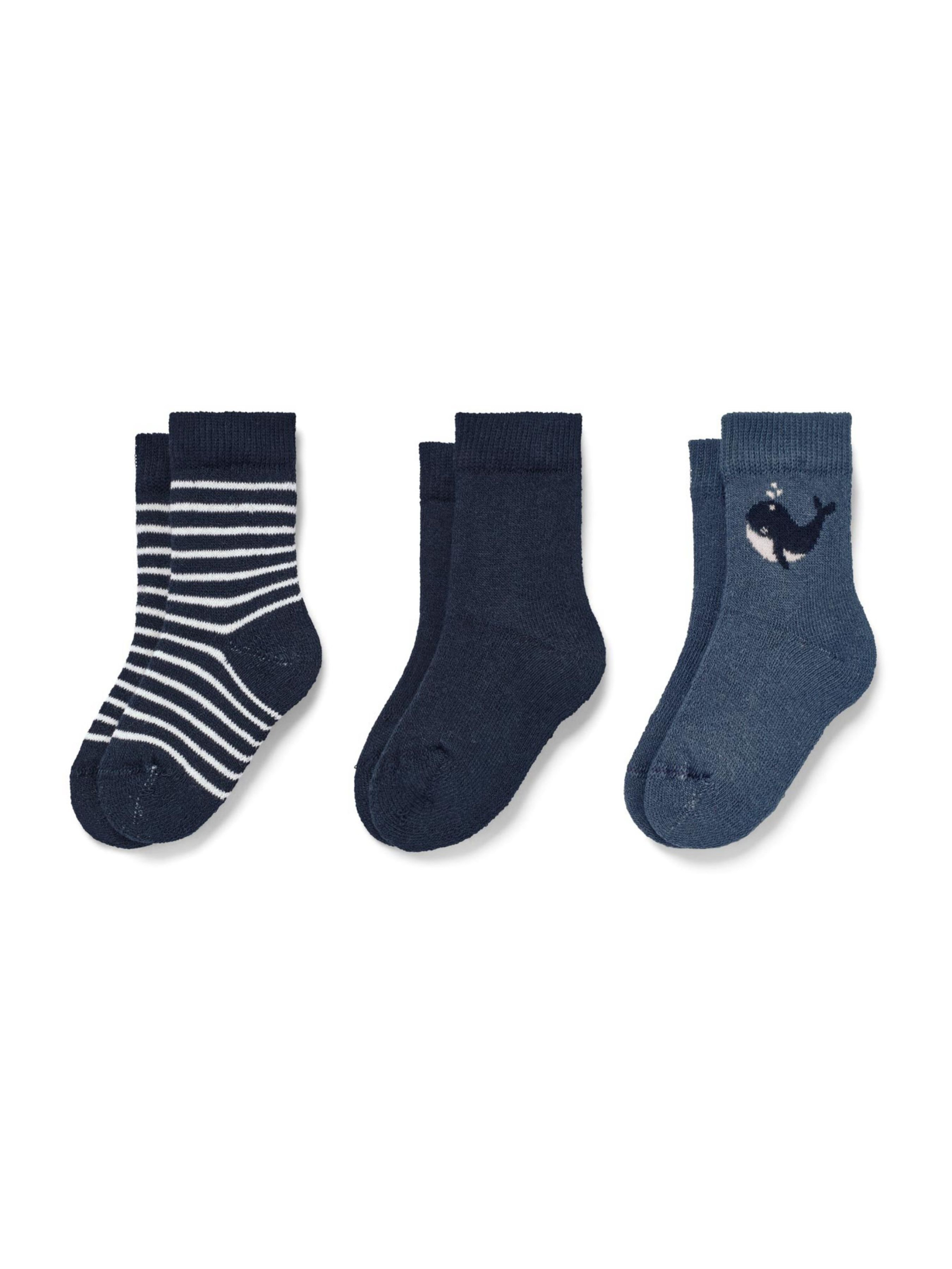 Набор теплых носков, 3 пары. Мягкий махровый интерьер. С эластаном: сохраняет форму, идеальная посадка, высокий комфорт при ношении. Усиленный носок и пятка. 3 разных дизайна с ребристыми манжетами. Сертифицирован GOTS. Состав: 85% хлопок (органический), 14% полиамид (переработанный), 1% эластан (LYCRA®).