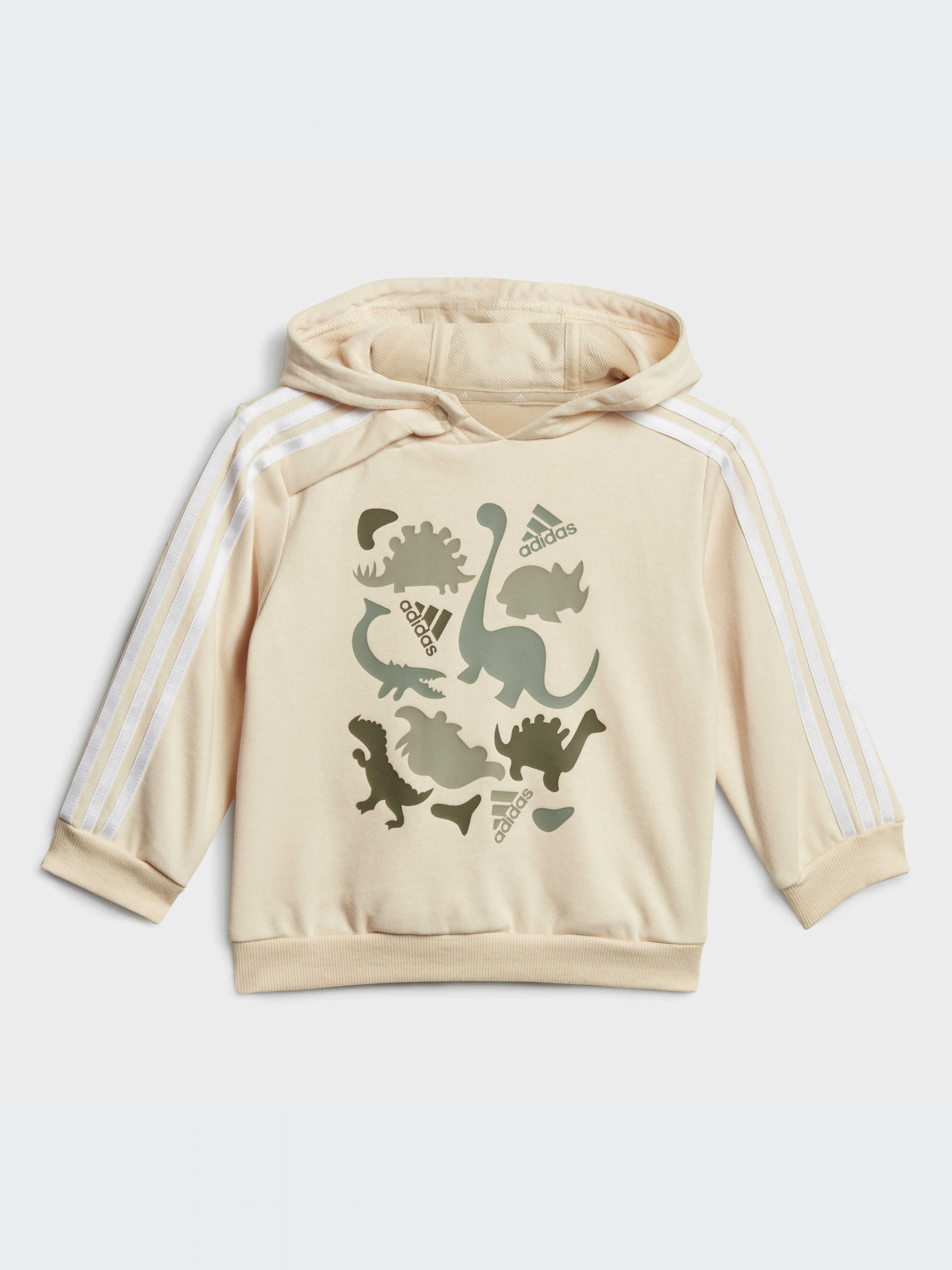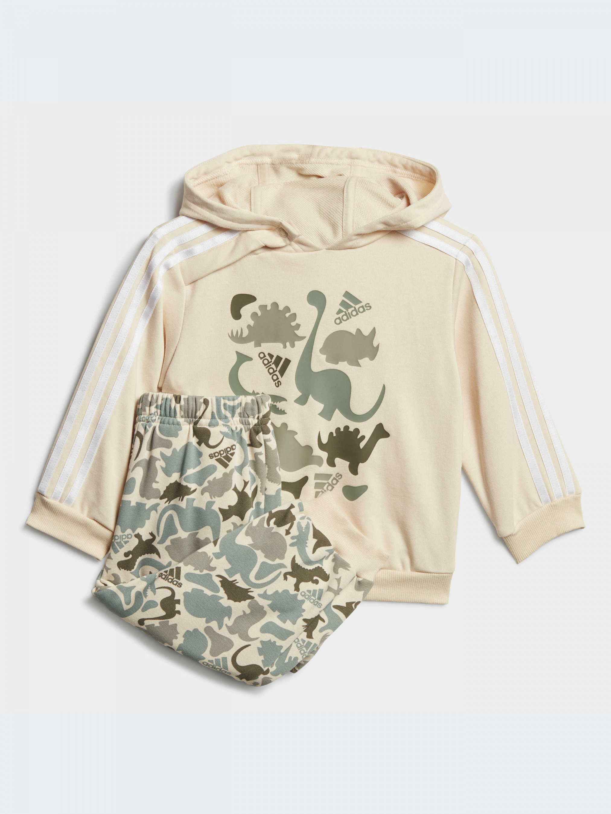 Классика и юрский период. Украшенный динозаврами, а также тремя полосками, этот комплект adidas для малышей создан для любителей спорта. И толстовка с капюшоном, и брюки на ощупь очень мягкие. Они имеют свободный крой, позволяющий малышам тянуться, наклоняться и извиваться, а брюки имеют эластичный пояс, который легко тянется и мягко прилегает к животику. Не менее 70% этой продукции представляет собой смесь переработанных и возобновляемых материалов. Наши хлопковые изделия поддерживают более устойчивое хлопковое сельское хозяйство.