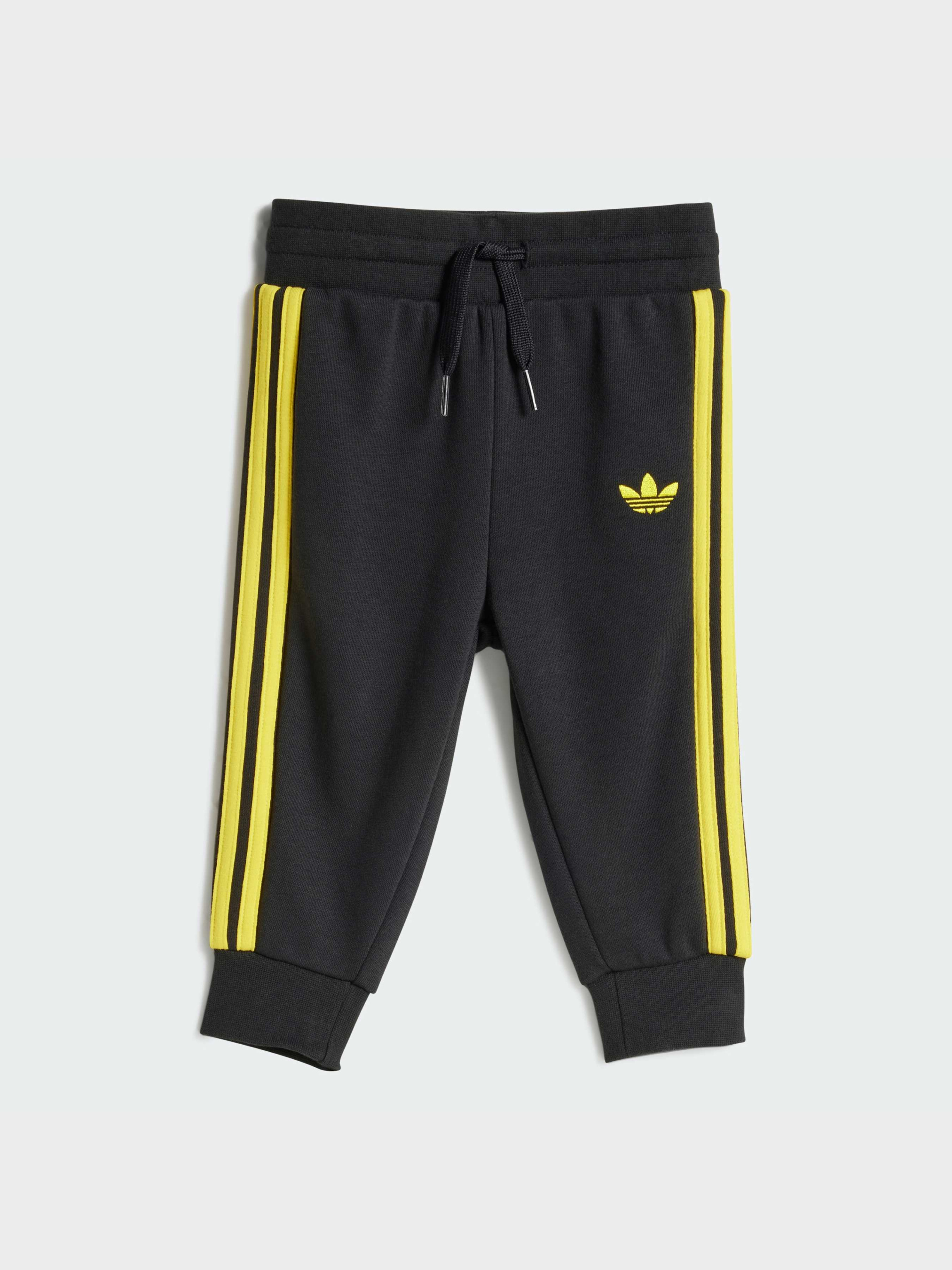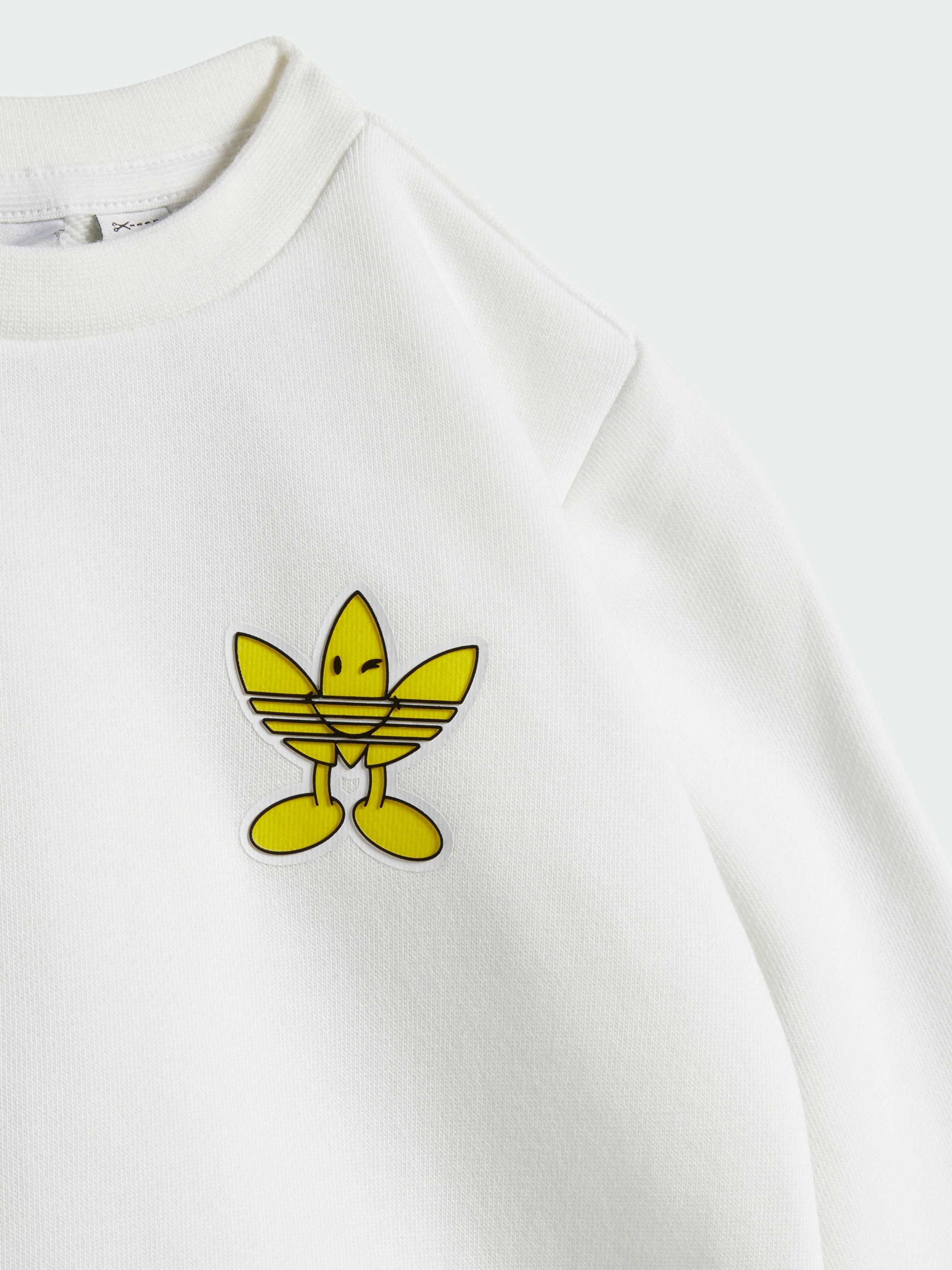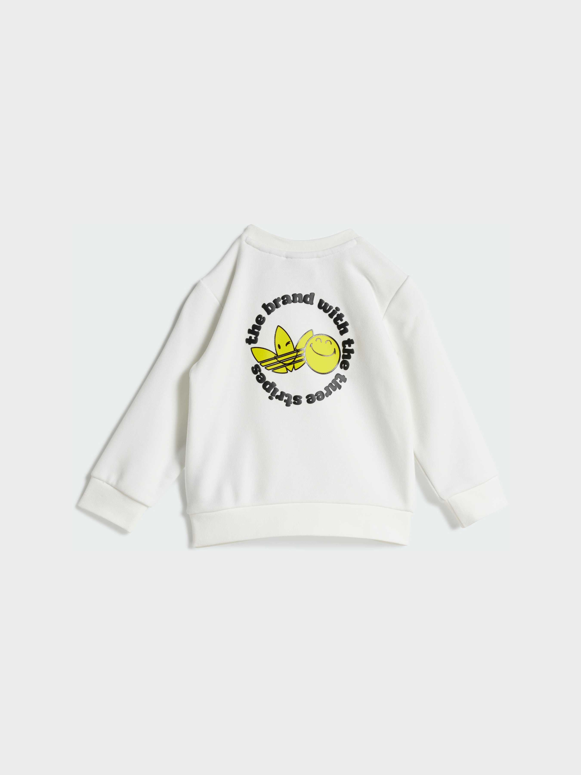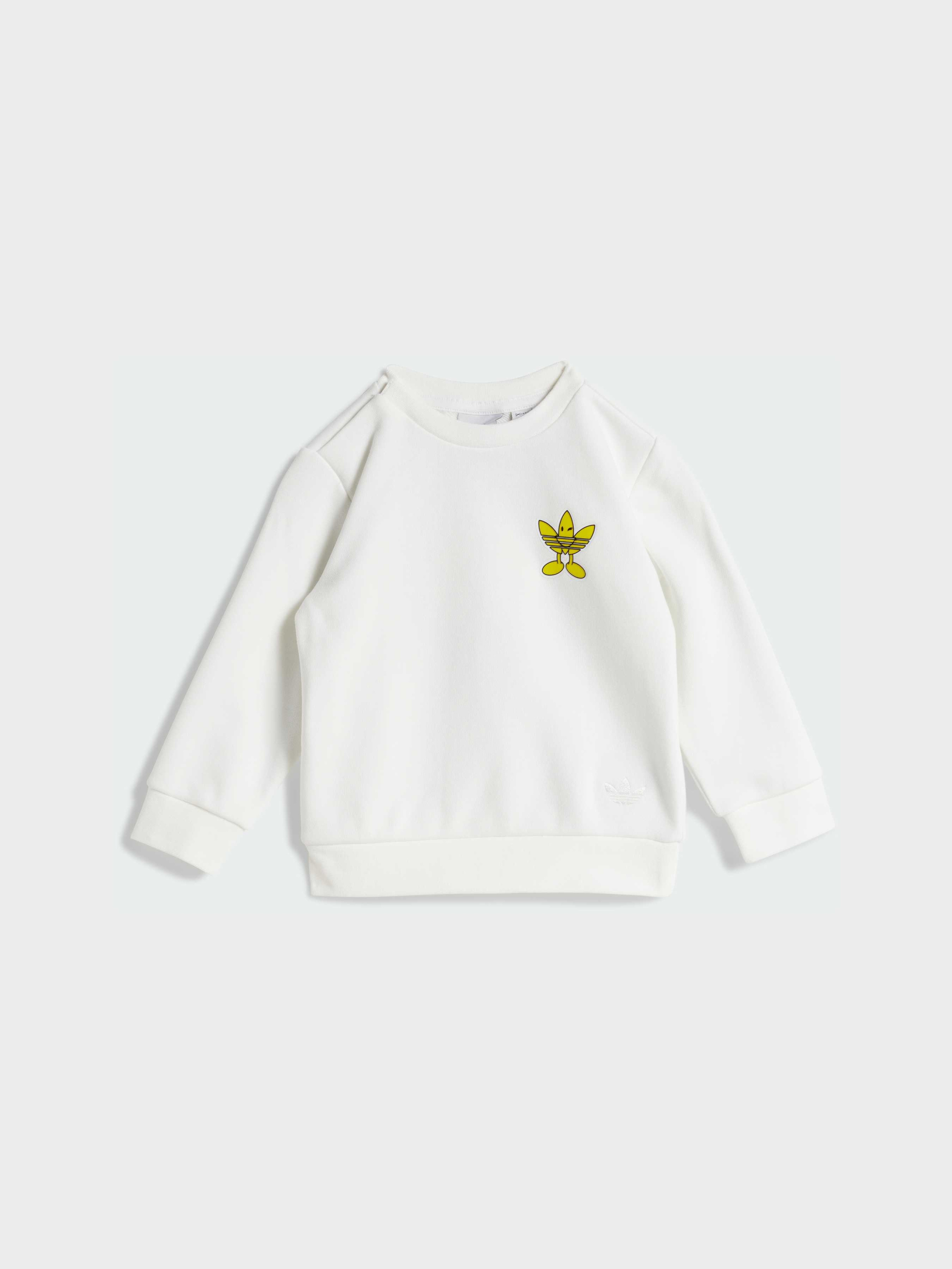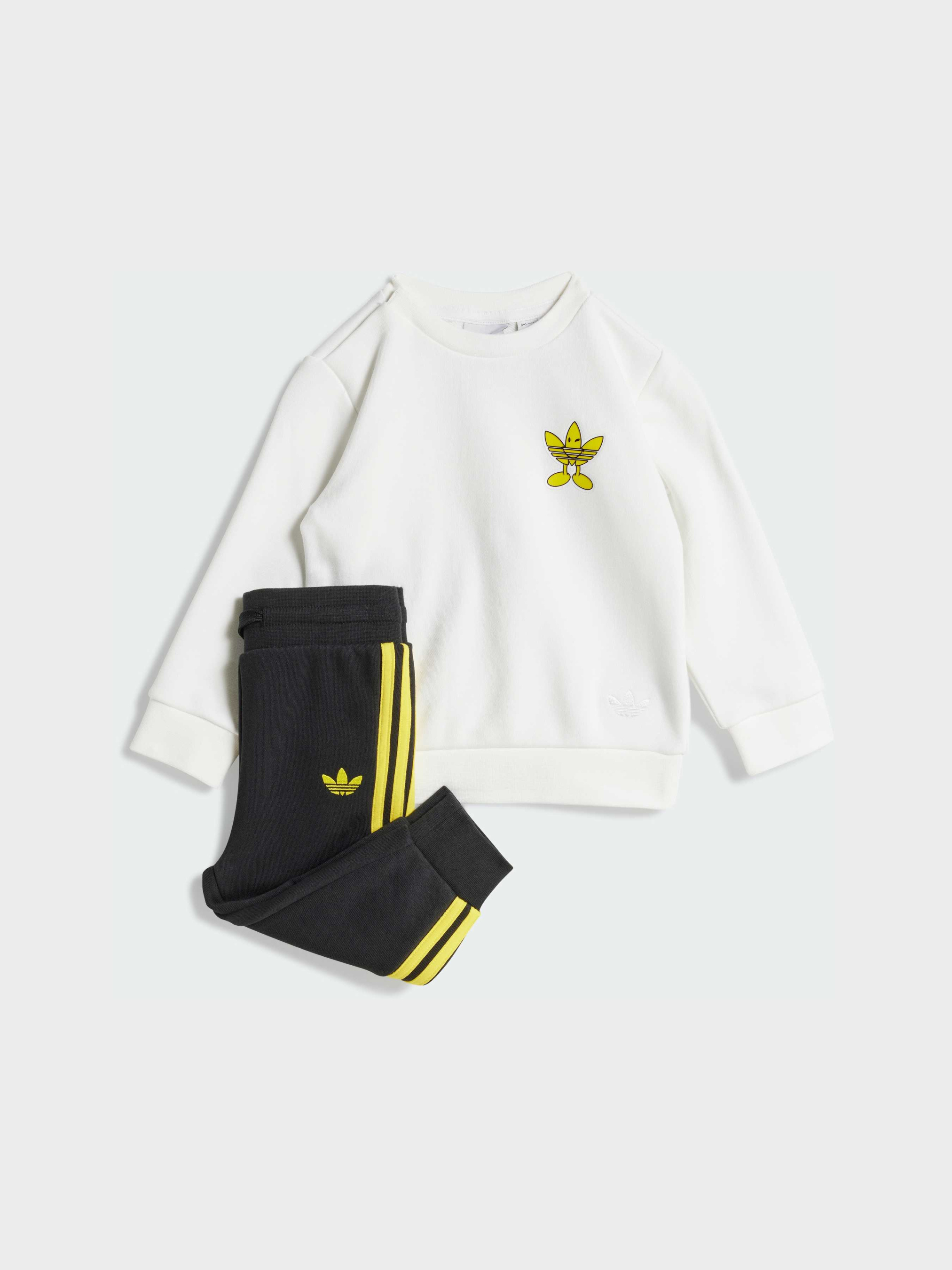 Характеристики 70% хлопок, 30% переработанный полиэстер Брюки: Эластичный пояс на завязках-шнурках Верх и брюки: Рифленые манжеты и подол Рифленый круглый ворот; застежка с кнопками на плече Свободный верх и брюки обычного кроя Описание Иконы объединились в этом комплекте для малышей - дизайнерской коллаборацией adidas Originals и Smiley World. Игривый, позитивный и милый комплект включает в себя свитшот свободного кроя с кнопками на плечах для удобства одевания. Брюки с эластичным рифленым поясом и манжетами надежно сидят, даже когда малыш ползает и движется. С этим очаровательным комплектом веселые приключения всегда в программе.