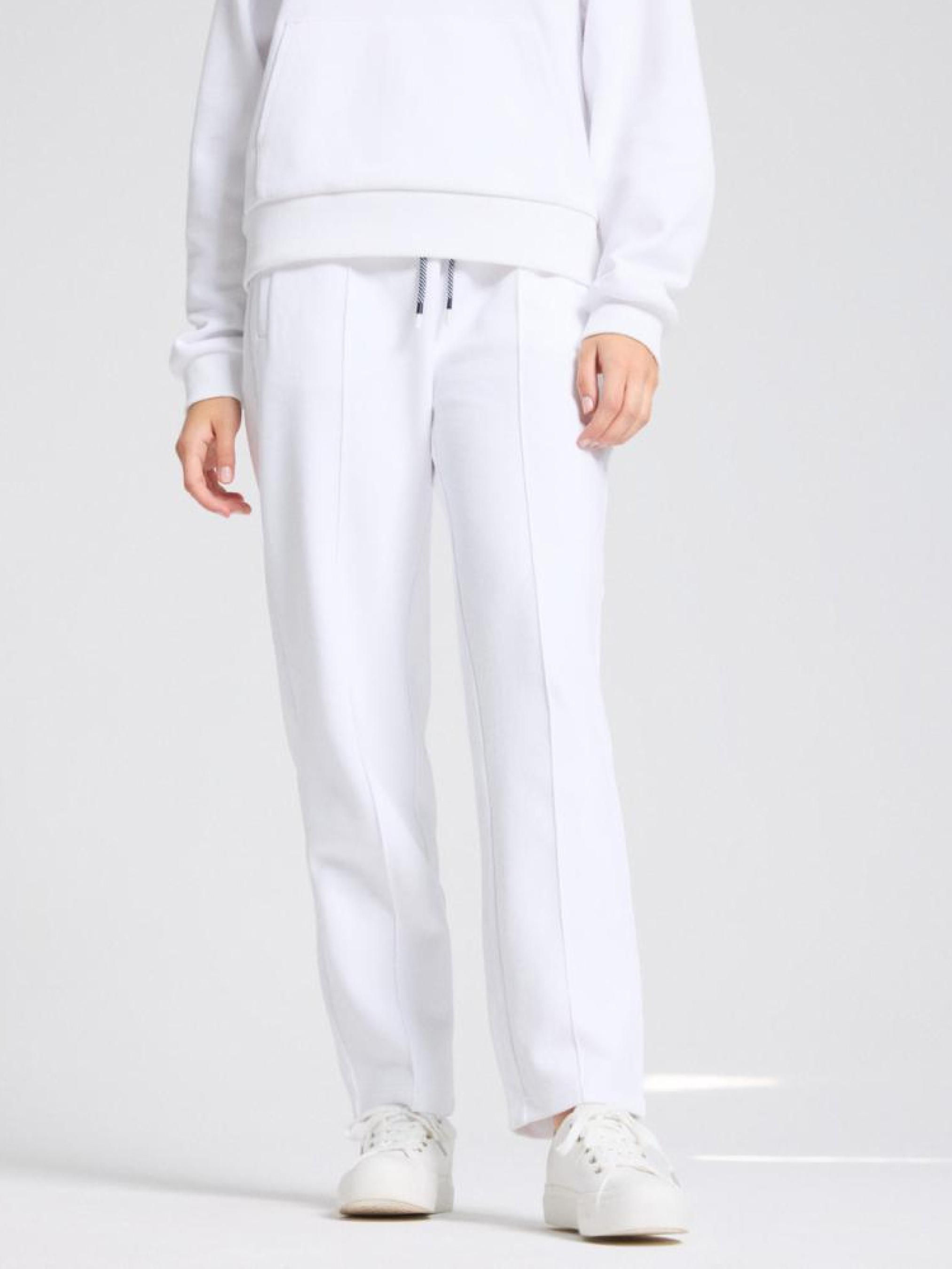 Спортивные штаны SELAS 10045056 Спортивные штаны с карманами и швами: - свободного кроя, - из ткани пике, - регулируемая талия на резинке и шнурке, - с карманами, - доступны в белом цвете. Сезон: осень/зима 2024 Состав: 86% хлопок 12% полиэстер 2% эластан Уход: - стирка при максимум 30 °С - не отбеливать - не сушить в сушильной машине - гладить максимум при темп. 150 °С - не химчистка Размер на модели - S Рост модели - 177 см