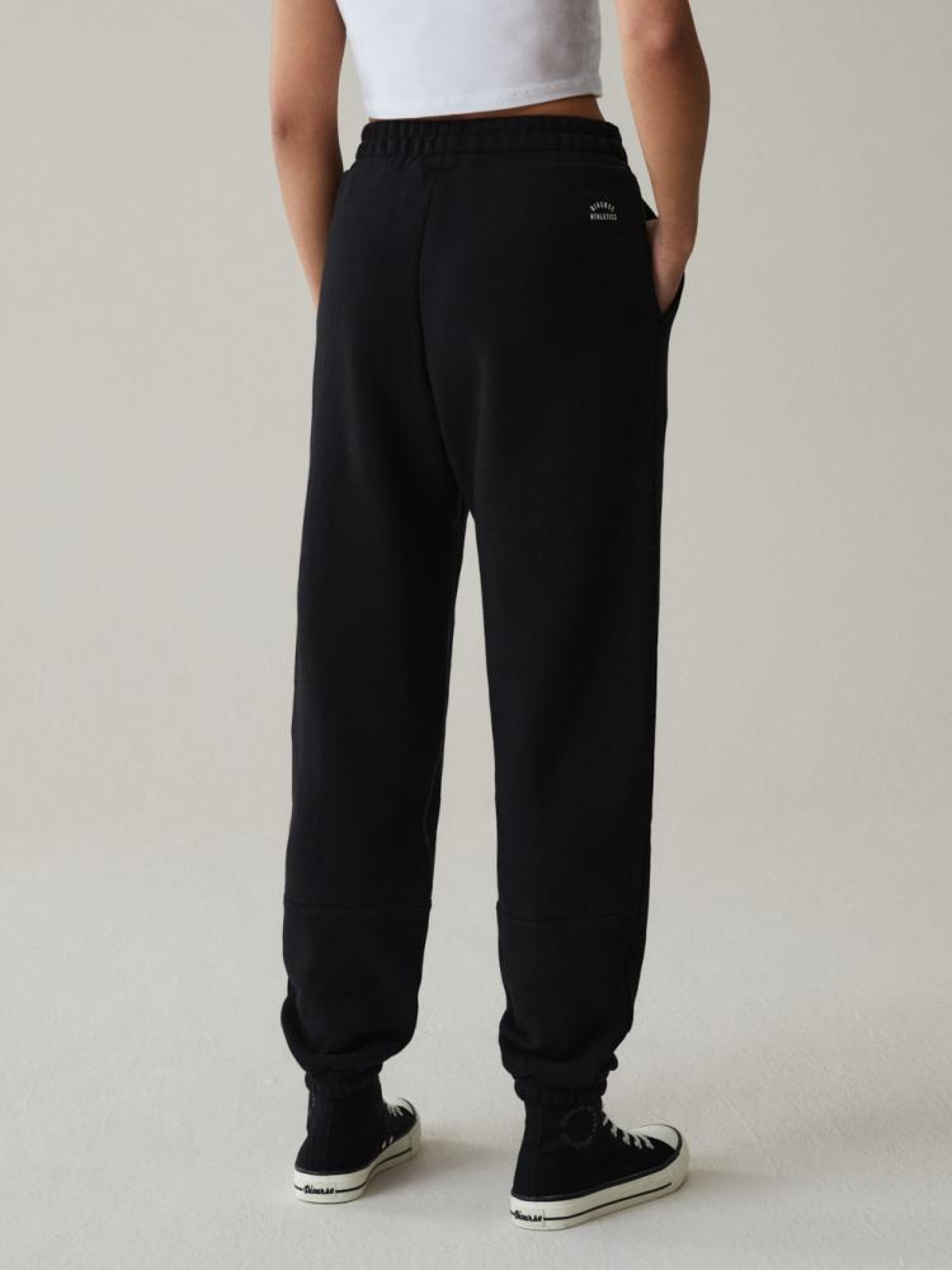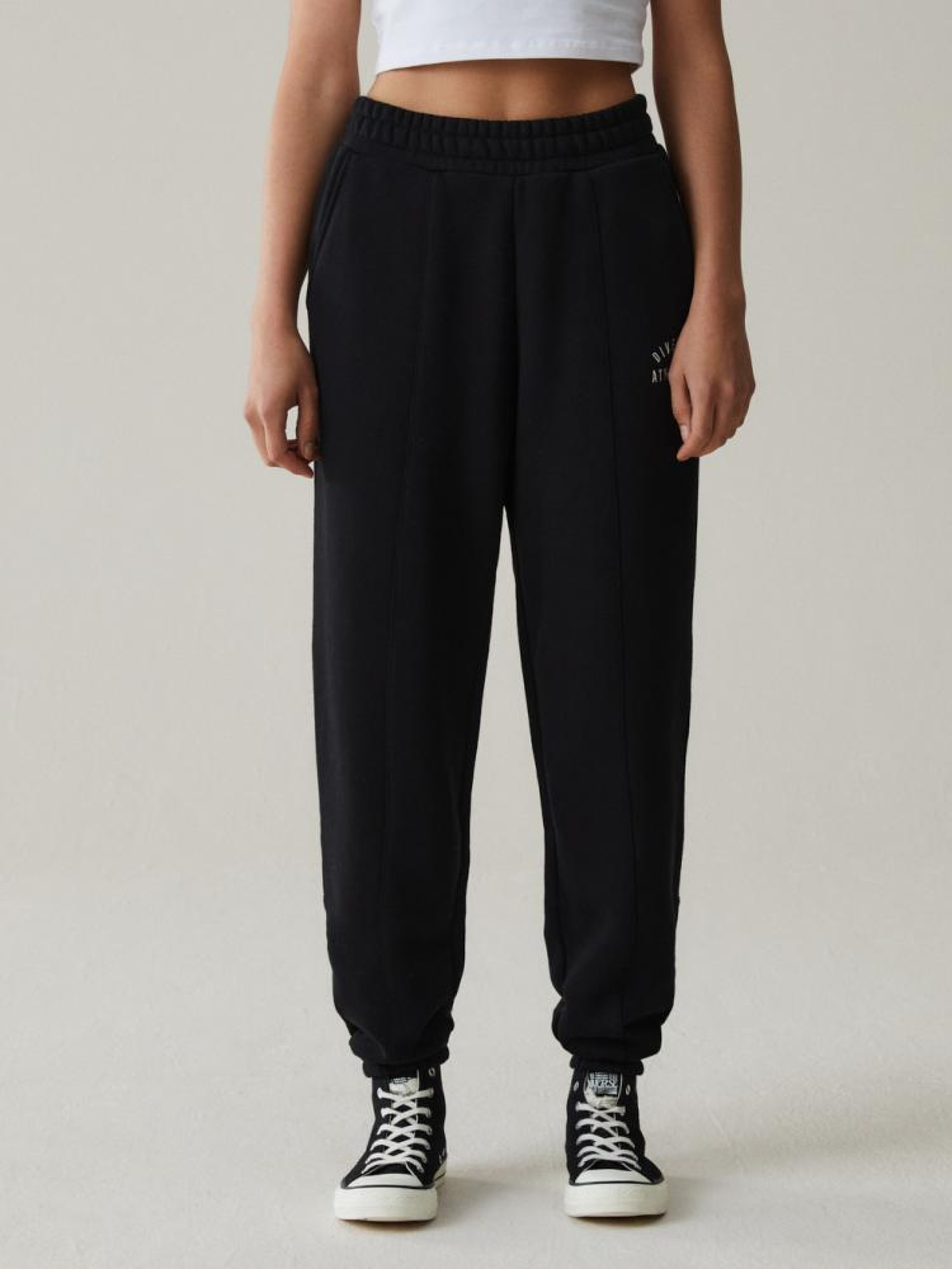 Спортивные штаны ATHDI 10043135 Классические женские спортивные штаны: - классического кроя, - с манжетами, - с логотипом на штанине, - из приятного трикотажа с хлопком, - доступны в черном цвете. Сезон: осень/зима Состав: 85% хлопок 15% полиэстер Уход: - стирка при максимум 30 °С - не отбеливать - не сушить в сушильной машине - гладить максимум при темп. 150 °С - не химчистка Размер на модели - S Рост модели - 172 см