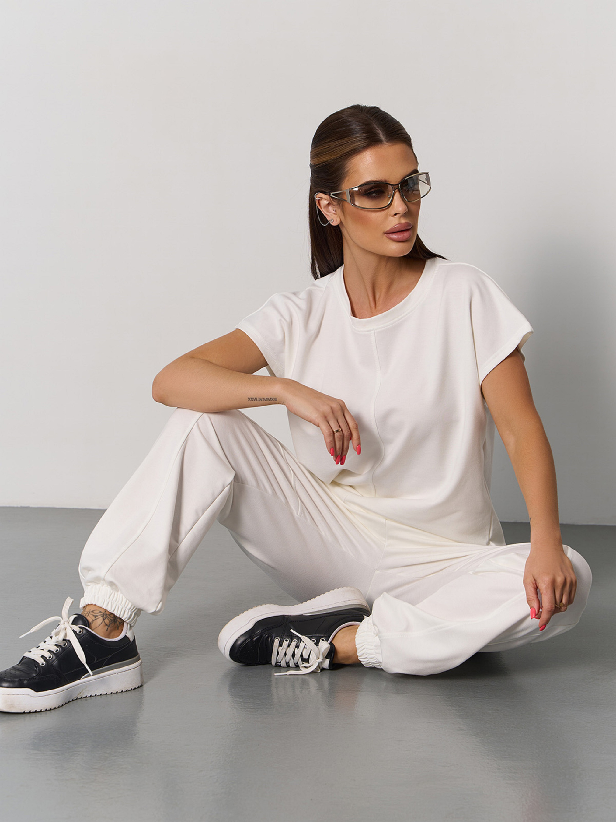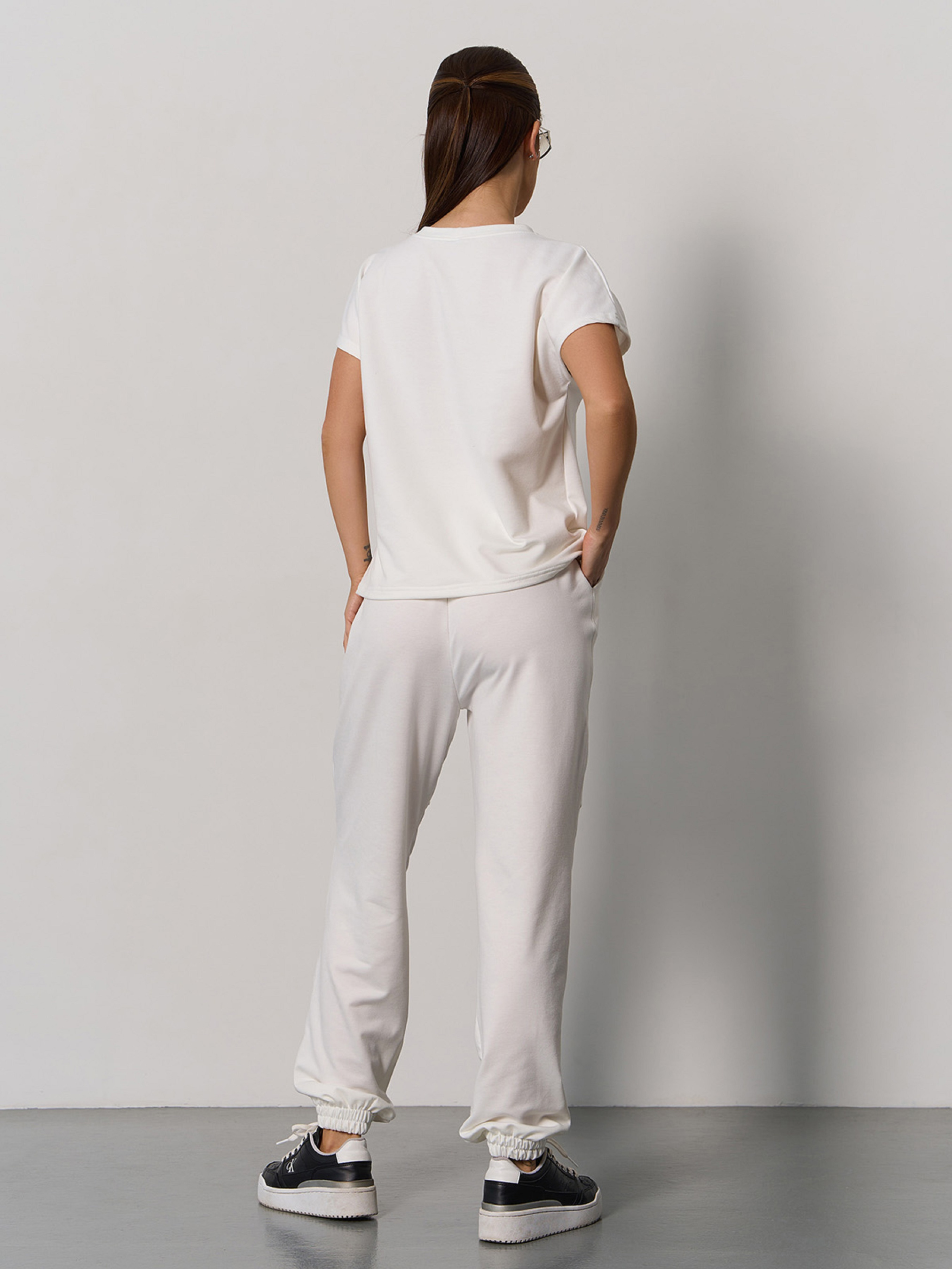 Молочный костюм с джоггерами, выполненный из трикотажной двухнити. Футболка-кимоно с короткими цельнокроенными рукавами и прямым свободным кроем. Брюки на резинке с эластичными манжетами и карманами. Изделие на шнуровке с декоративными швами. Полуобхват: Кофта: Грудь: S (51), M (53), L (55), XL (57), Длина изделия - 56, Брюки: Талия S (30-44), M (32-46), L (34-48), XL (36-50), Бедра S (54), M (56), L (58), XL (60), Длина изделия - 100, Длина по внутреннему шву - 70, Ткань: Высокой эластичности. Состав: 50% хлопок, 50% полиэстер