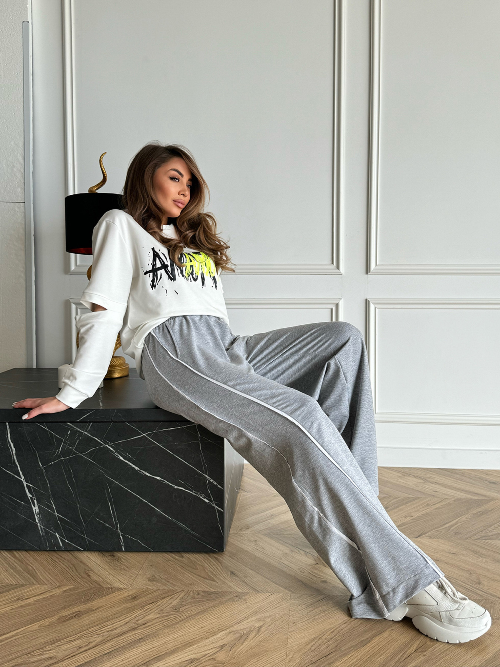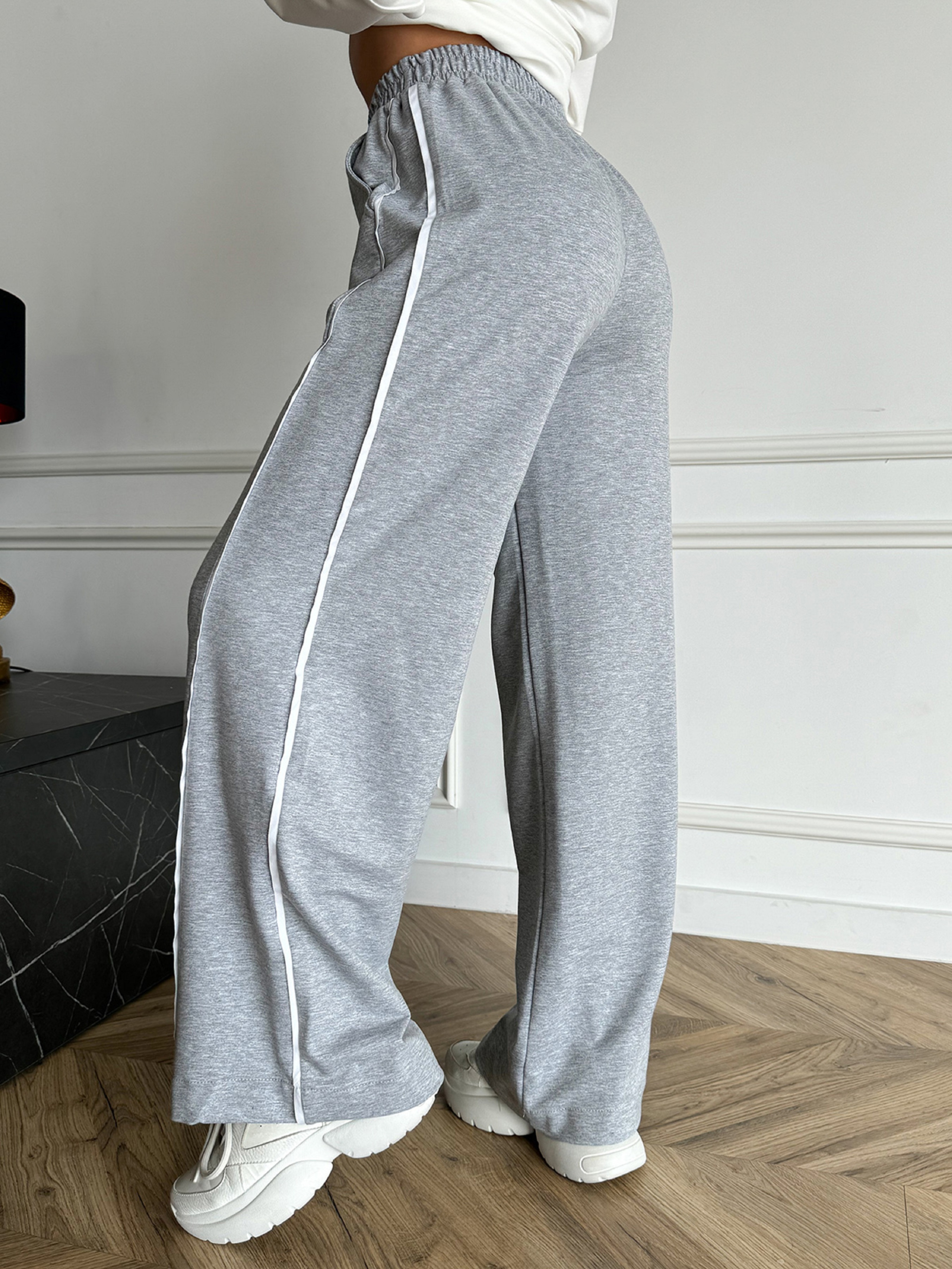 Высокие спортивные штаны прямого свободного кроя, выполненные из трикотажной двухнити серого цвета. Модель на резинке с боковыми белыми тесемками и карманами. Полуобхват: Талия: S (30-48), M (32-50), L (34-52), XL (36-54), XXL (38-55), 3XL (40-58), Бедра: S (52), M (54), L (56), XL (58), XXL (60),3XL (62), Длина изделия - 106, Длина по внутреннему шву -78, Ткань: Средней эластичности.