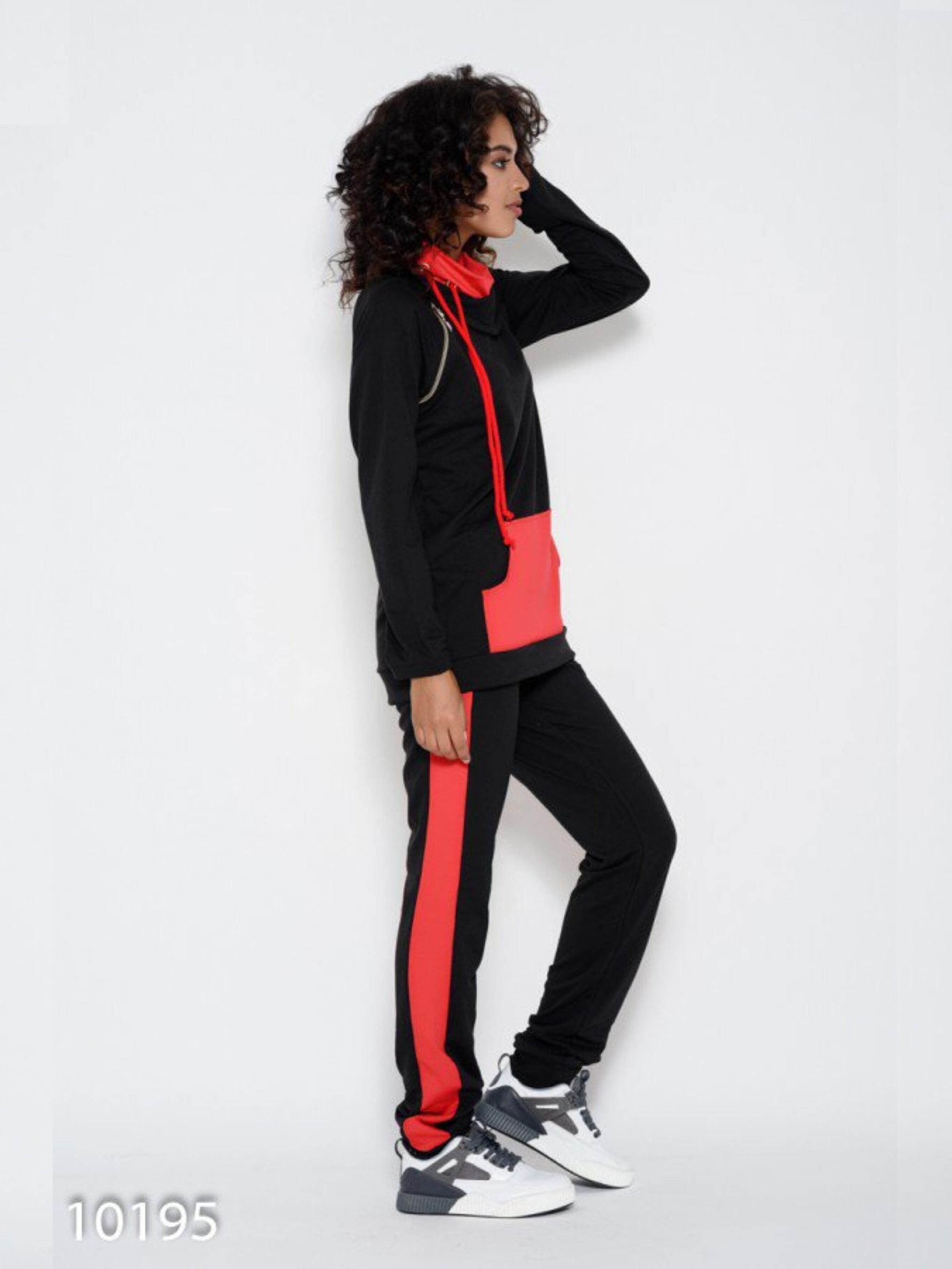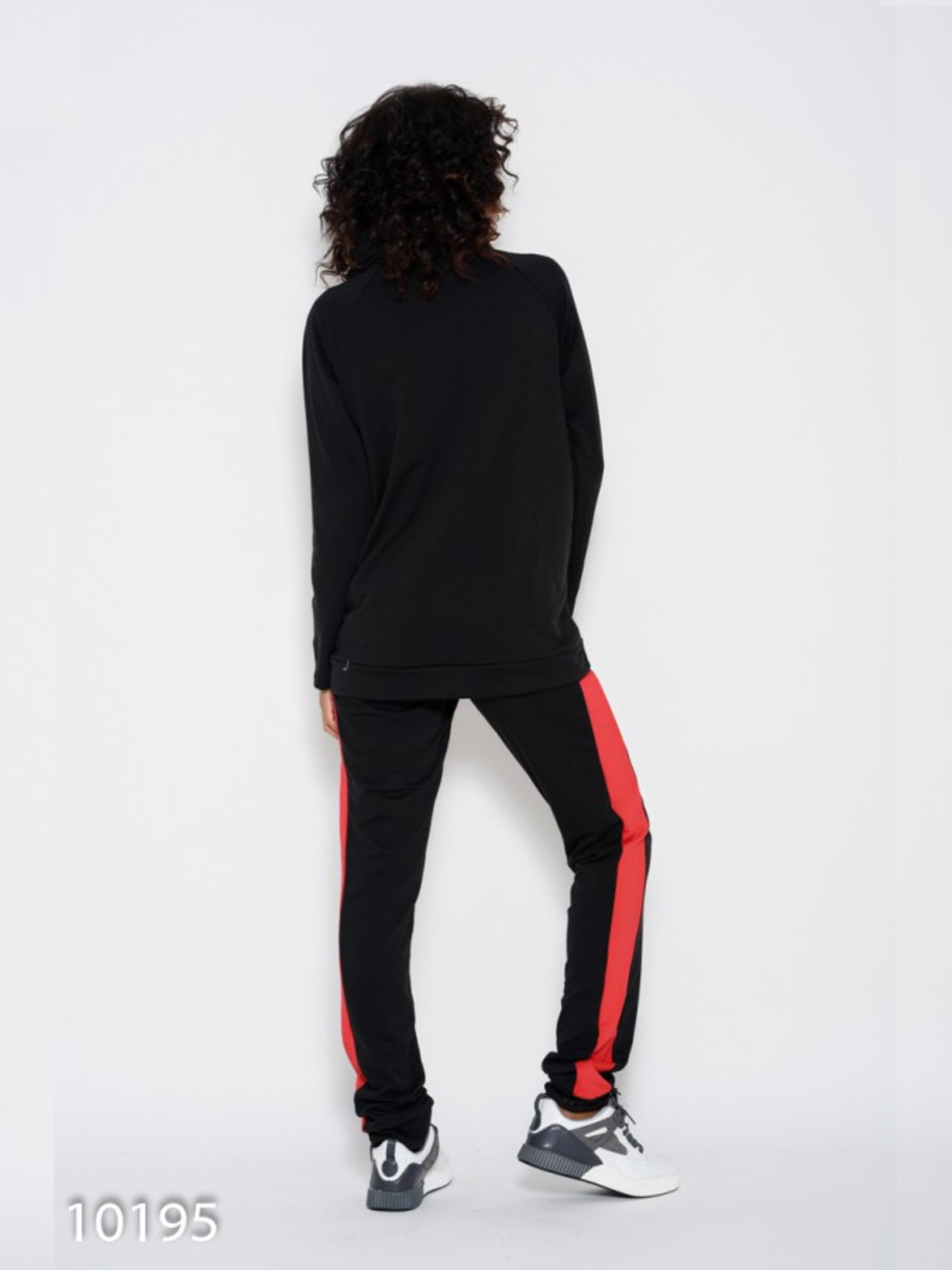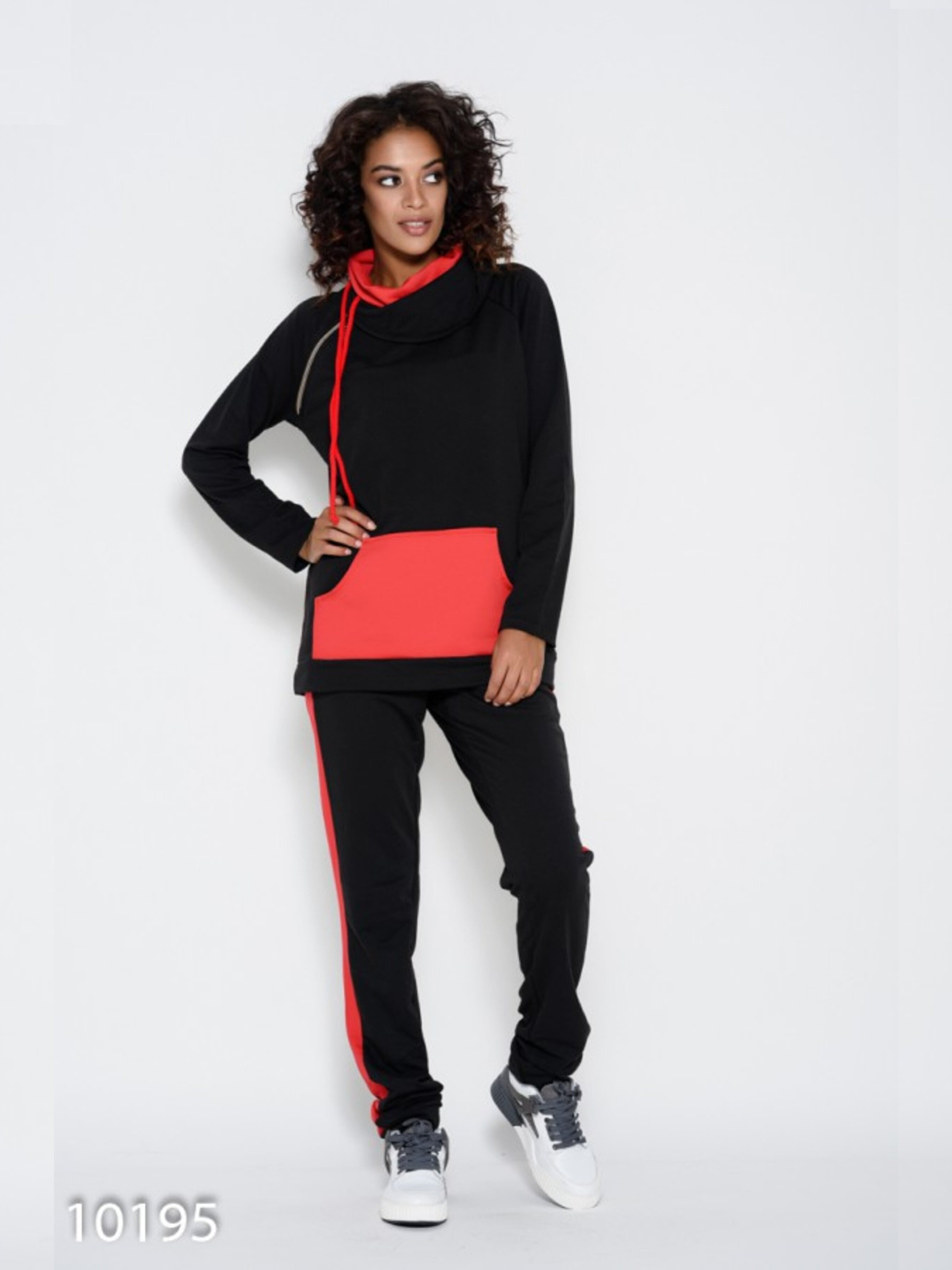 Черный брючный спортивный костюм из практичной двухнити с декором в виде красных вставок. Модель батника прямого свободного кроя с удобными рукавами модели реглан и декором в виде молнии по пройме одного рукава. Модель с вместительным карманом-кенгуру и черно-красным воротником-хомутом со шнуровкой. Брюки прямого свободного кроя на поясной резинке с красными вставками по бокам. Растяжимость: кофта- грудь: S (92), M (96), L (100), XL (104), длина изделия -66, длина рукав-52. Брюки: талия S (70-80), M (74-84), L (78-88), XL (82-92), бедра S (92), M (96), L (100), XL (104), внутренний шов-85. Ткань: Средней эластичности.