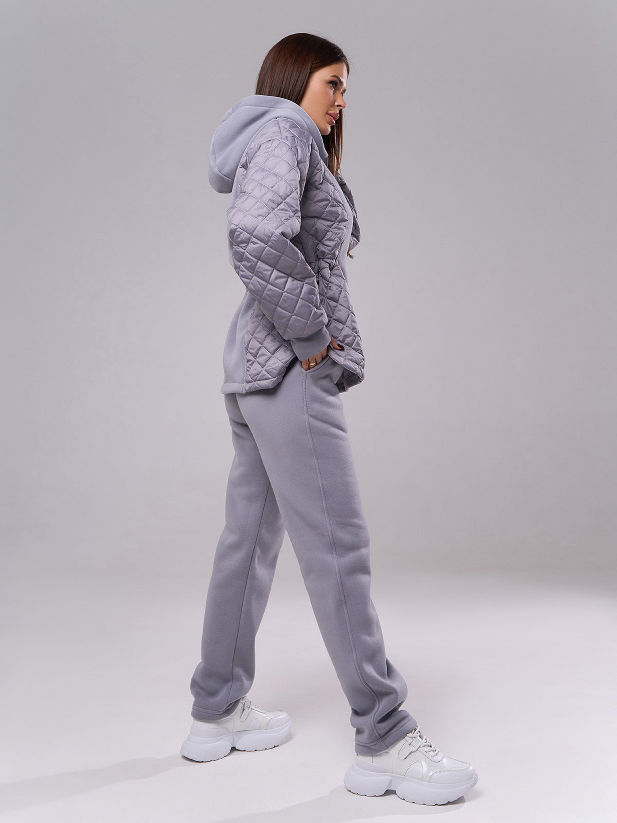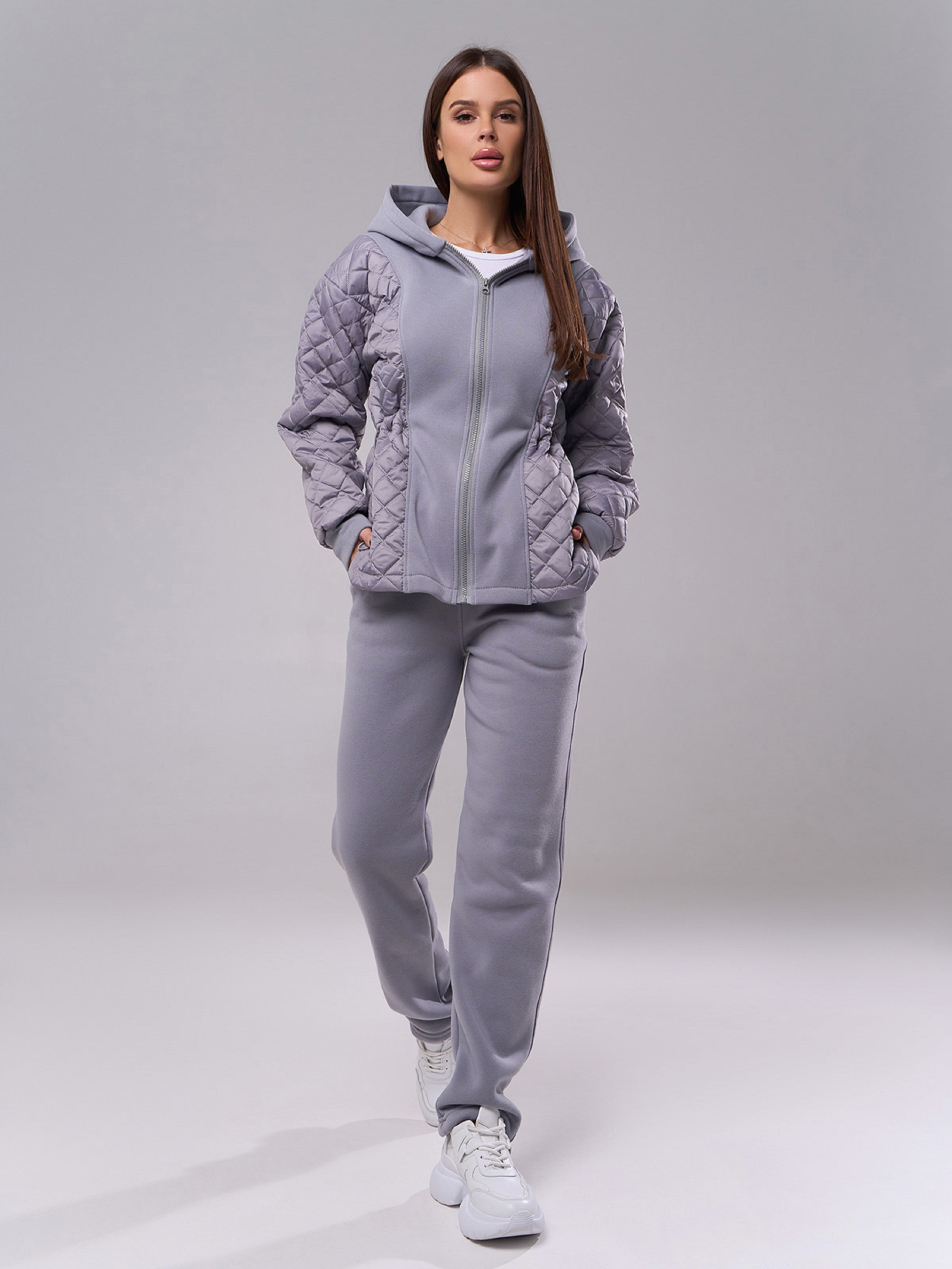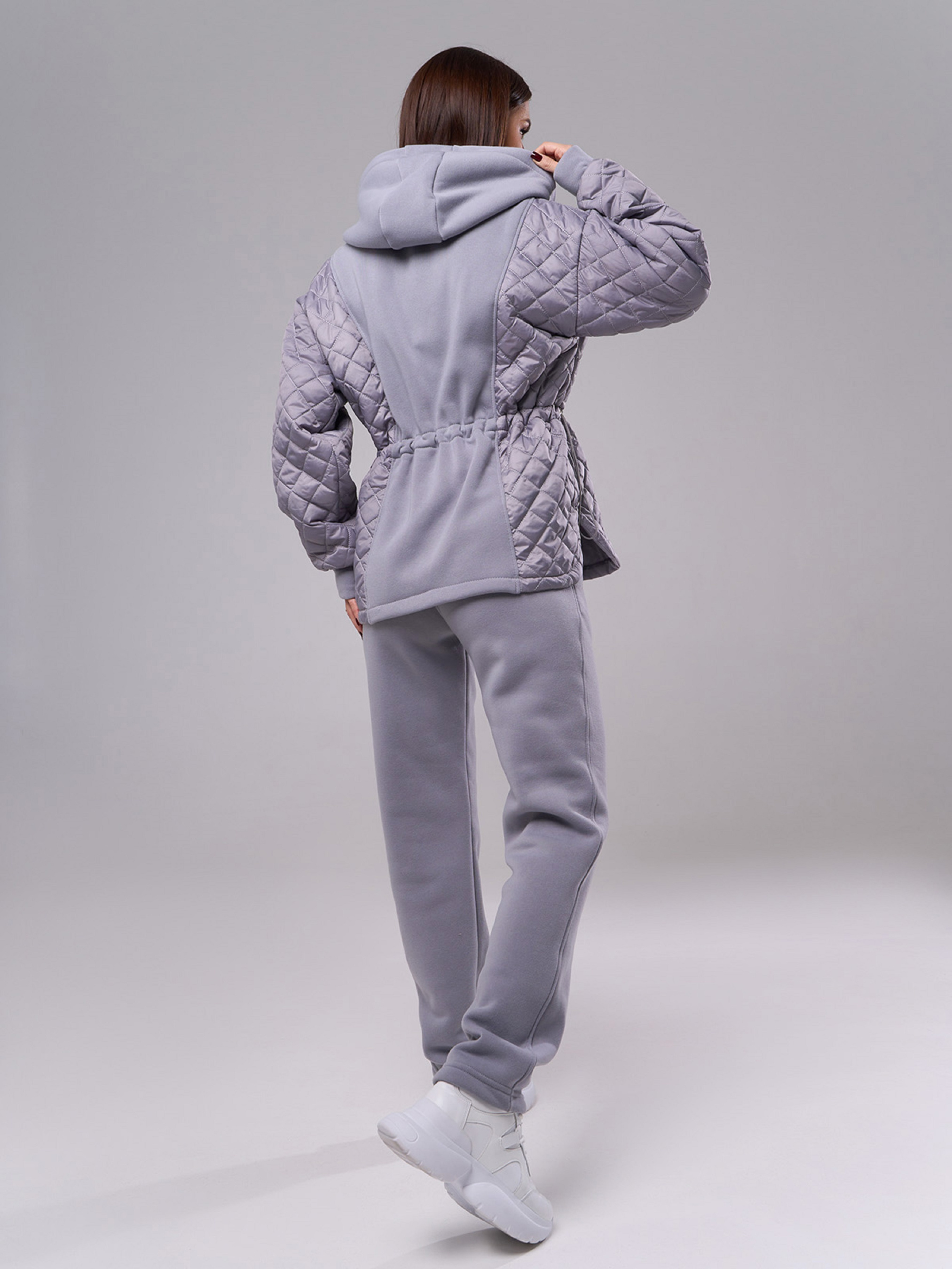 Комбинированные костюм из трикотажа на флисе и стеганой плащевки серого цвета. Модель на молнии с капюшоном и длинными рукавами на манжетах. Толстовка с кулиской и боковыми фигурными вырезами. Брюки зауженного к низу кроя с поясной резинкой и карманами. Полуобхват: Кофта: Грудь: S (53), M (55), L (57), XL (59), Длина изделия - 63, Рукав - 54, Брюки: Талия: S (30-38), M (32-40), L (34-42), XL (36-44), Бедра: S (50), M (52), L (54), XL (56), Длина изделия - 100, Длина по внутреннему шву - 75, Ткань: Средней эластичности.