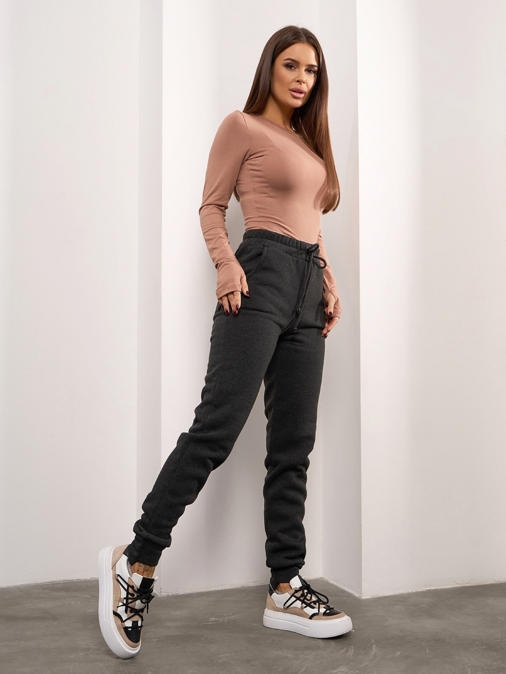 Утепленные штаны в спортивном стиле с асимметричными манжетами. Модель со шнуровкой и поясной резинкой оснащена тремя карманами. Изделие из трикотажа на флисе темно-серого цвета. Полуобхват: Талия: S (30-38), M (32-40), L (34-42), XL (36-44), Бедра: S (46), M (48), L (50), XL (52), Длина изделия - 102/104, Длина по внутреннему шву - 80, Ткань: Средней эластичности.