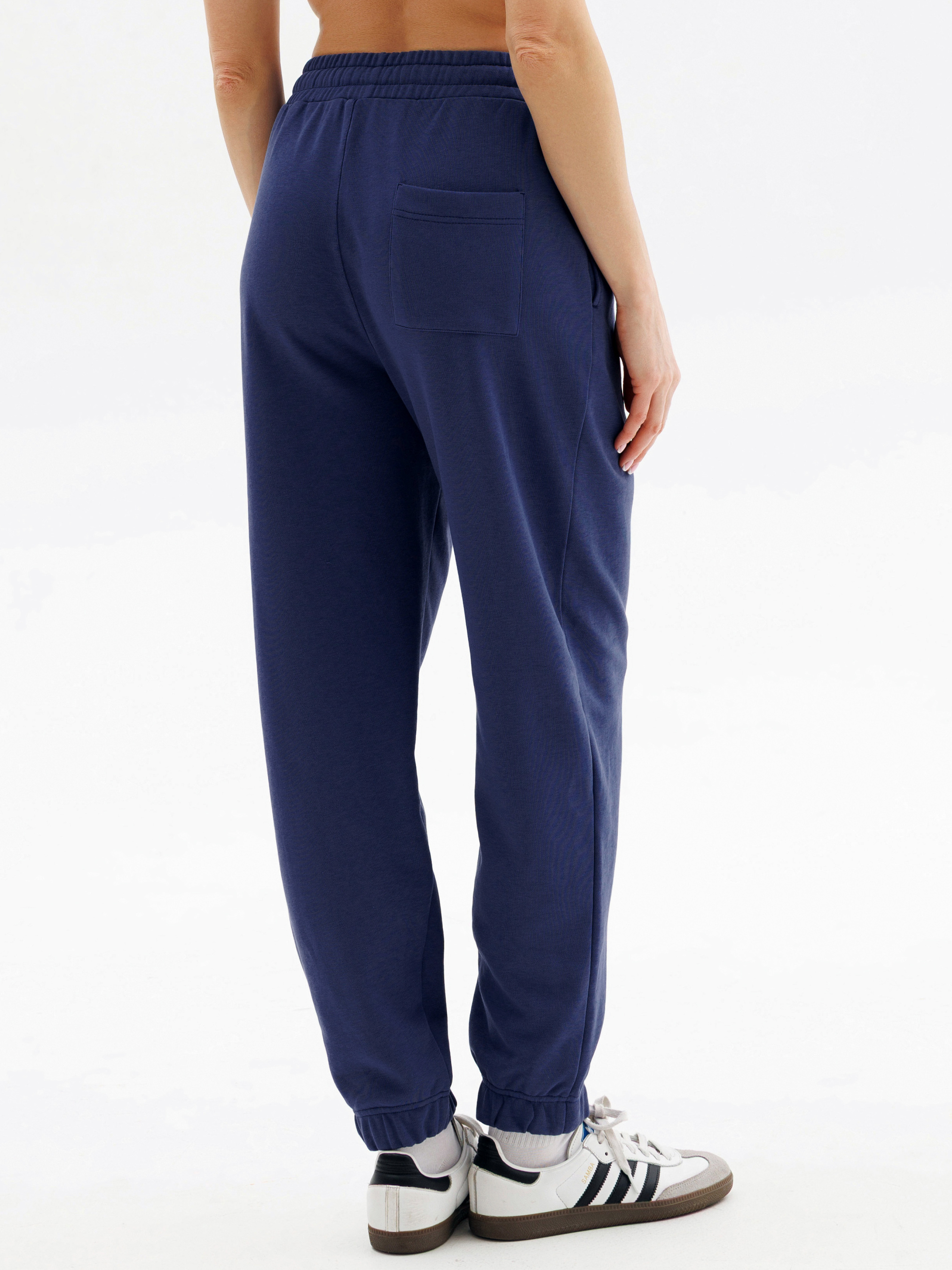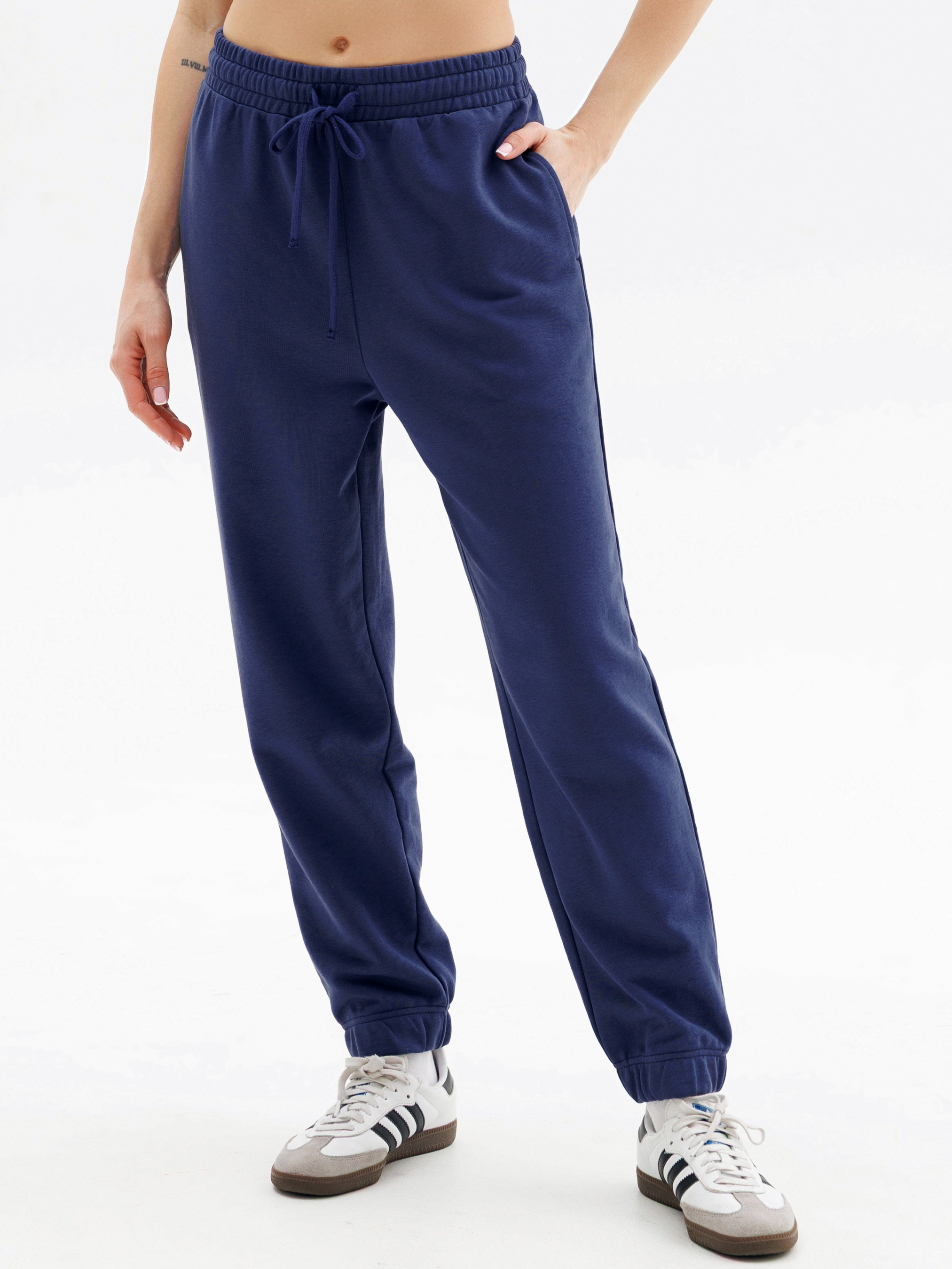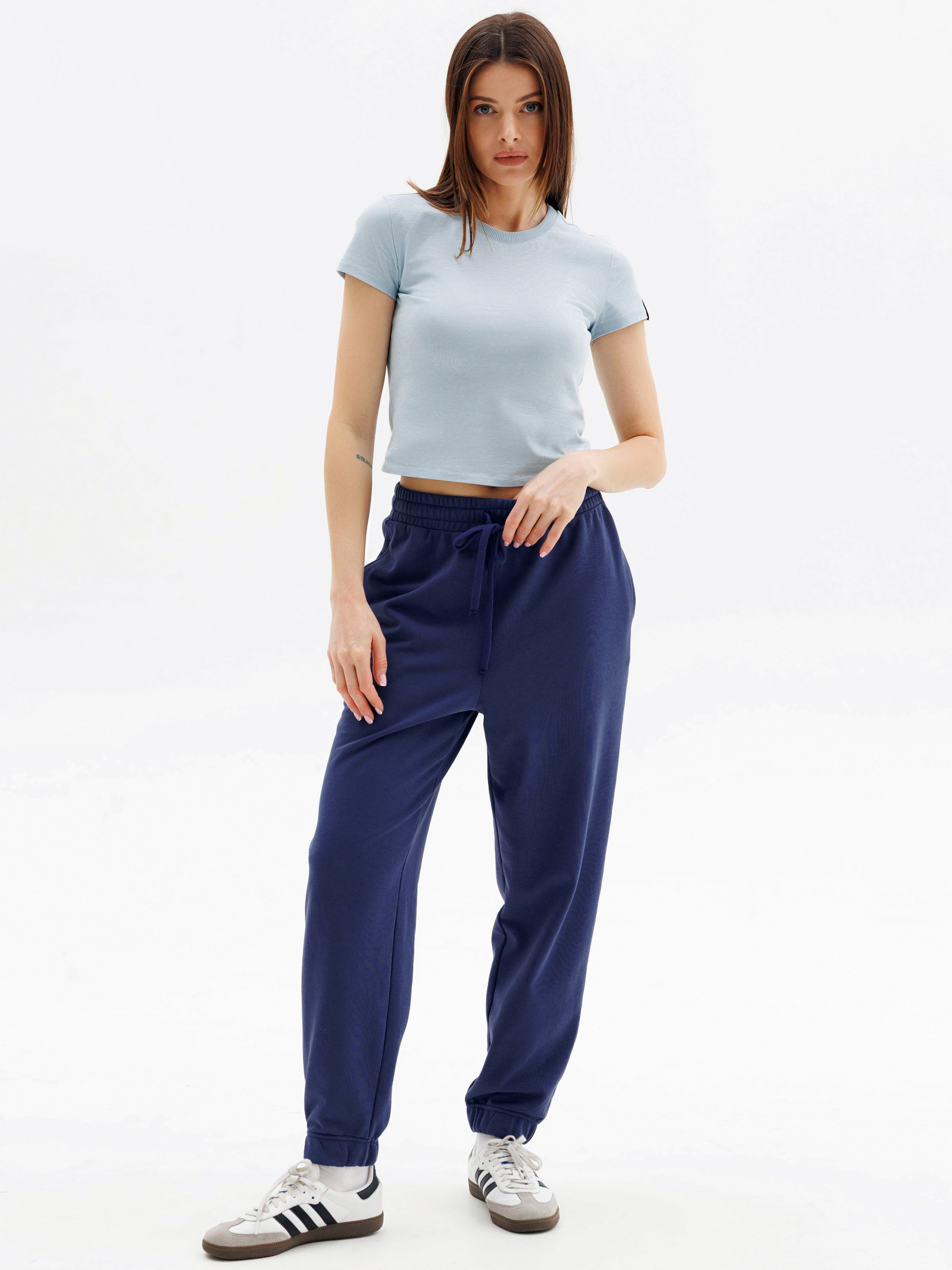 95% cotton, 5% elastane. Штани представлені у двох приємних відтінках: ніжно-блакитний і глибокий синій. Модель бере за ідею трендовий комфорт та практичність: вільний крій, зручна еластична резинка з фіксуючим шнурком на талії, манжети внизу штанин для додаткового комфорту та акуратна кишеня ззаду, що додає функціональності. Виготовлені з м'якої, приємної до тіла тканини, штани ідеально підійдуть для домашнього затишку, активного відпочинку, прогулянок містом або занять спортом. Стильна база для щоденного образу, яку легко поєднувати з футболками, майками чи джемперами.