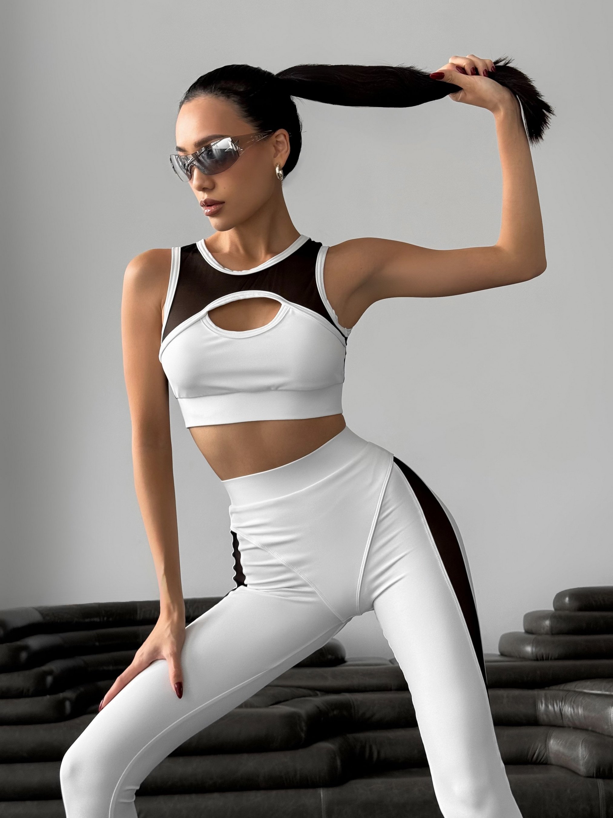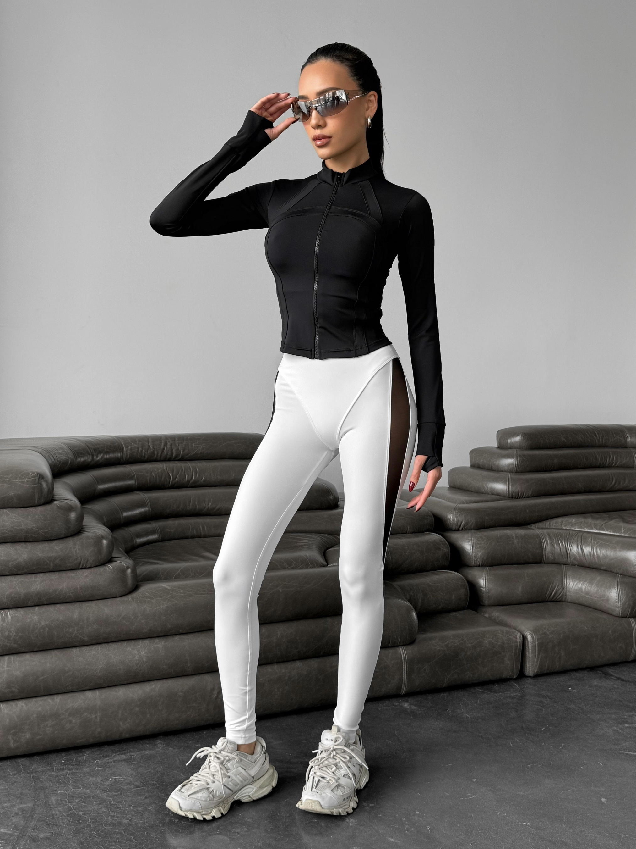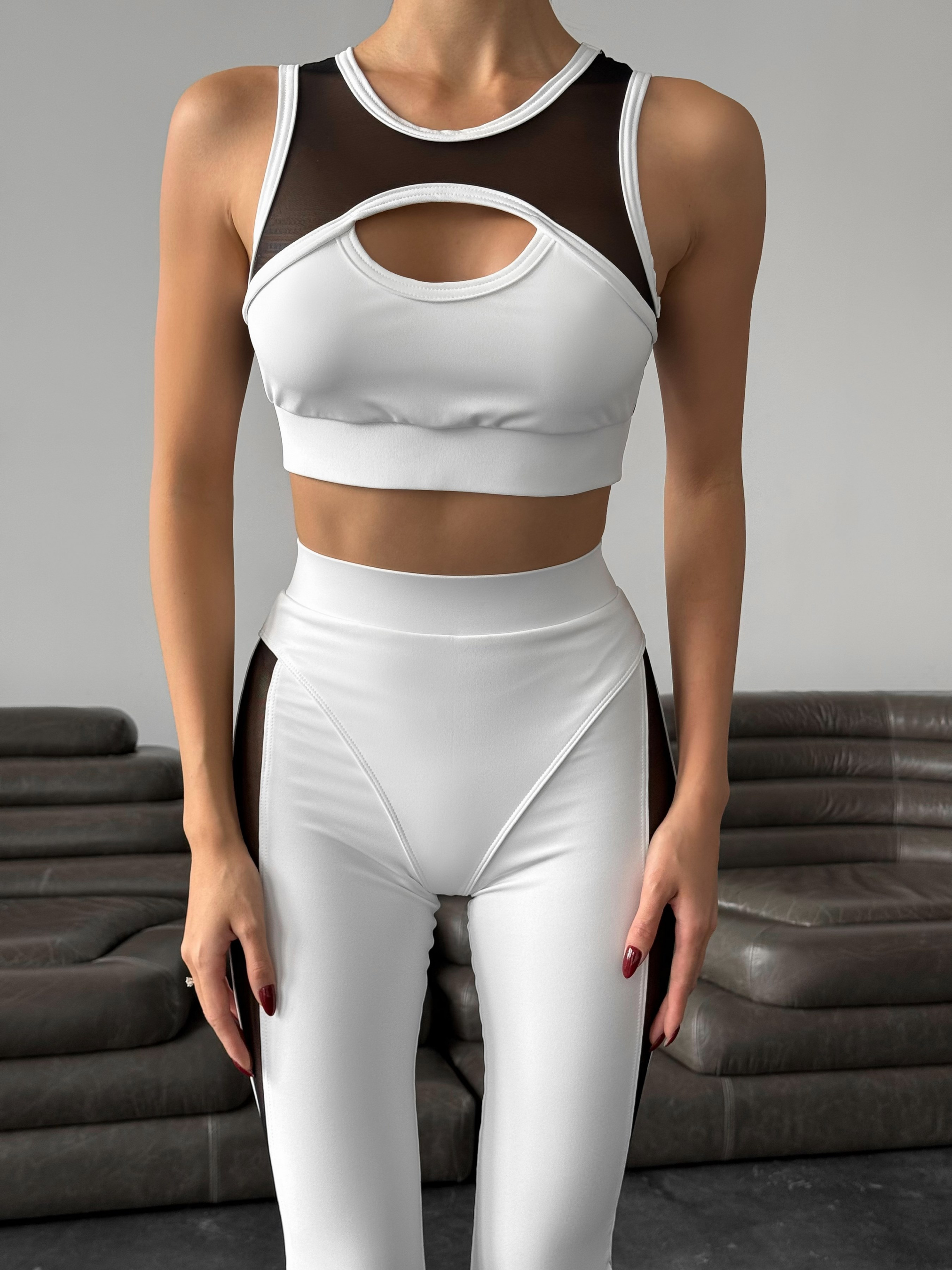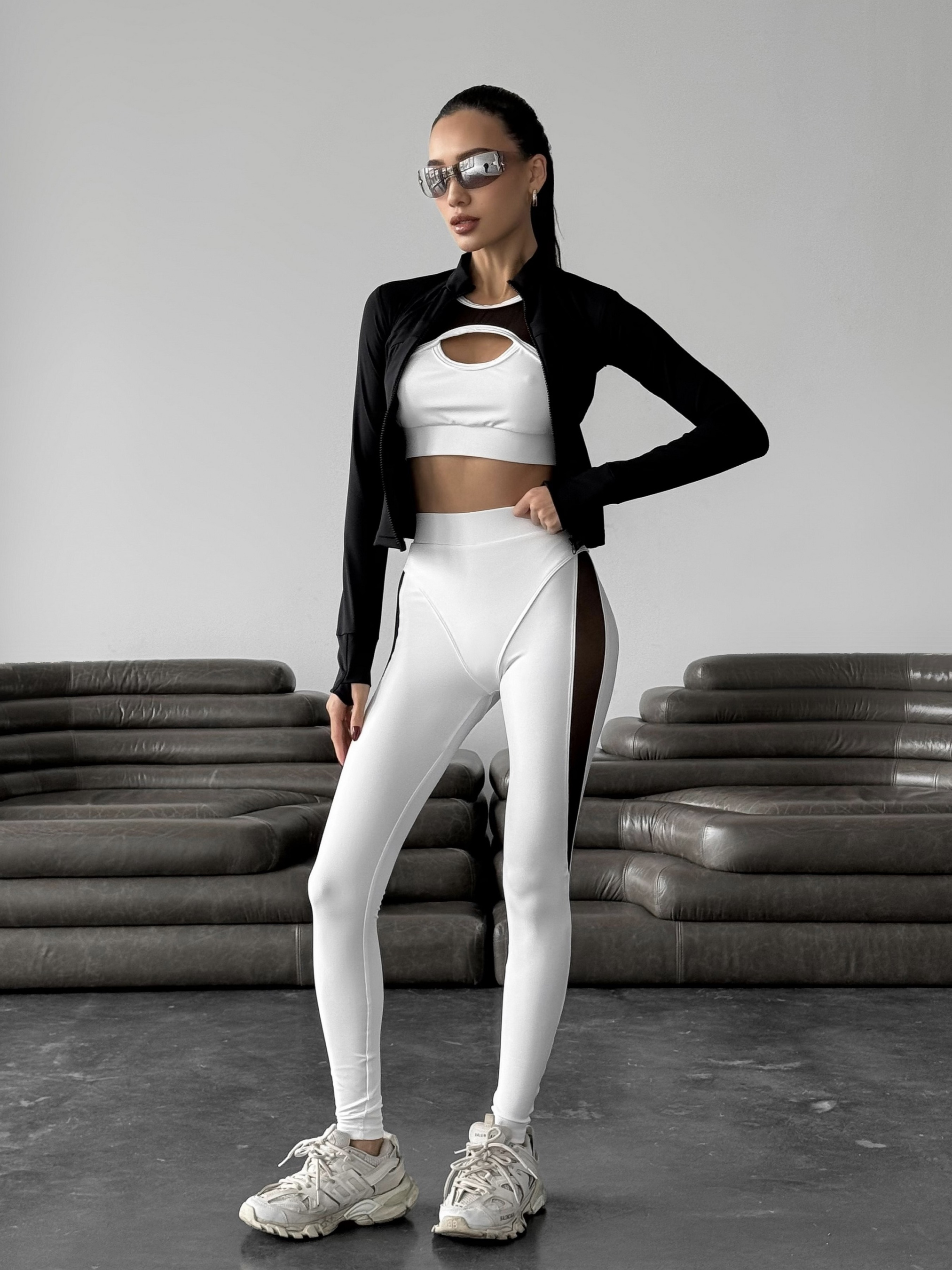 Женский спортивный комплект Nova Vega. В комплект входят лосины, топ и кофта. Идеально подойдёт для занятий в тренажерном зале, занятий йогой и фитнесом, а также для тренировок на открытом воздухе. Кофта с длинными рукавами и удобными вырезами под большой палец идеально сидит по фигуре и обеспечивает дополнительную защиту рук. Топ с глубоким декольте украшен стильными вставками из сетки (топ с карманами для чашек вкладышей, сами чашки в комплекте не идут). Лосины с сетчатыми вставками создают оригинальный дизайн и обеспечивают отличную вентиляцию, а декоративные трусики создают пуш-ап эффект. Комплект выполнен из высококачественного бифлекса, обеспечивающего отличную эластичность и комфорт во время тренировок.