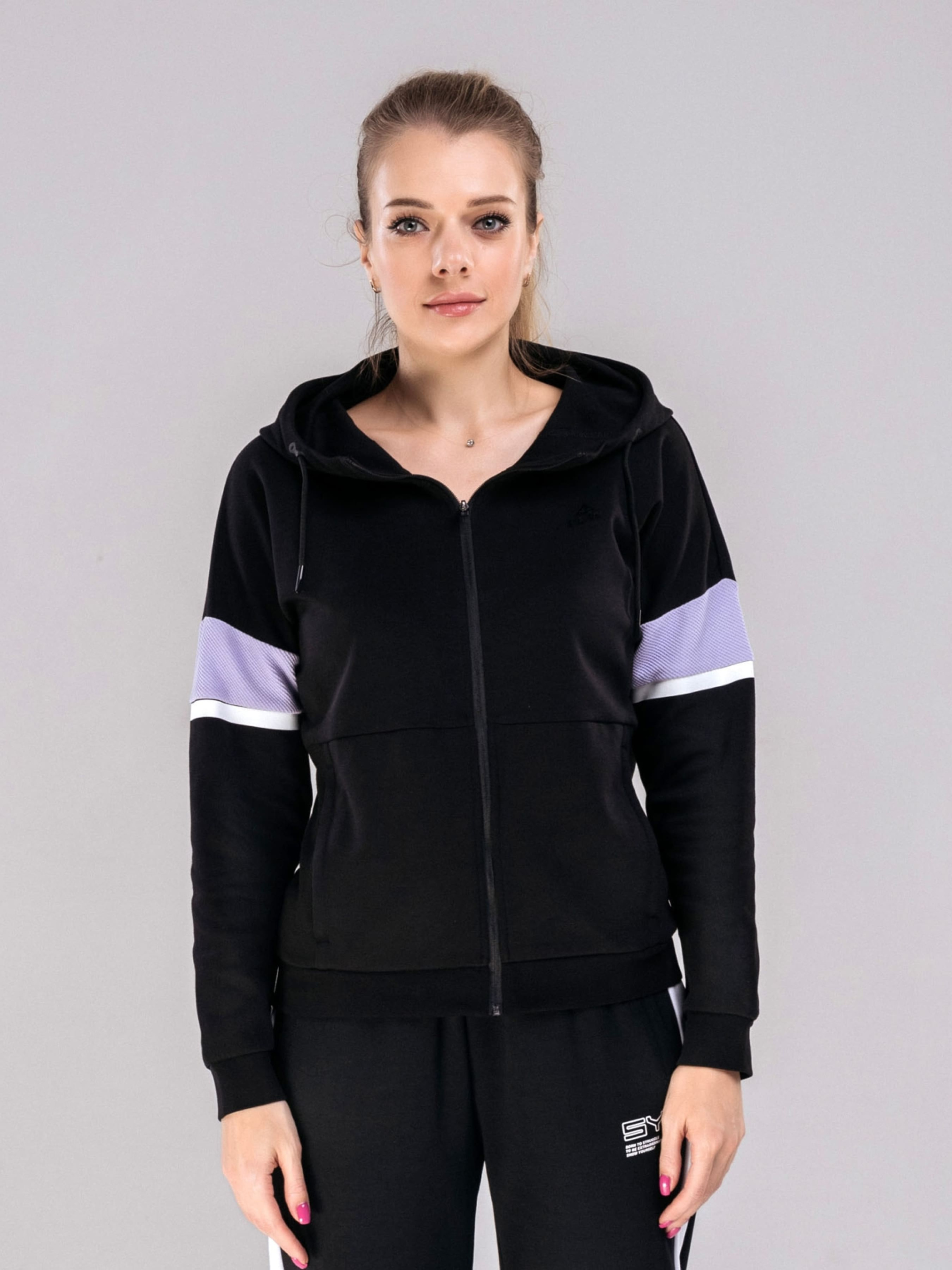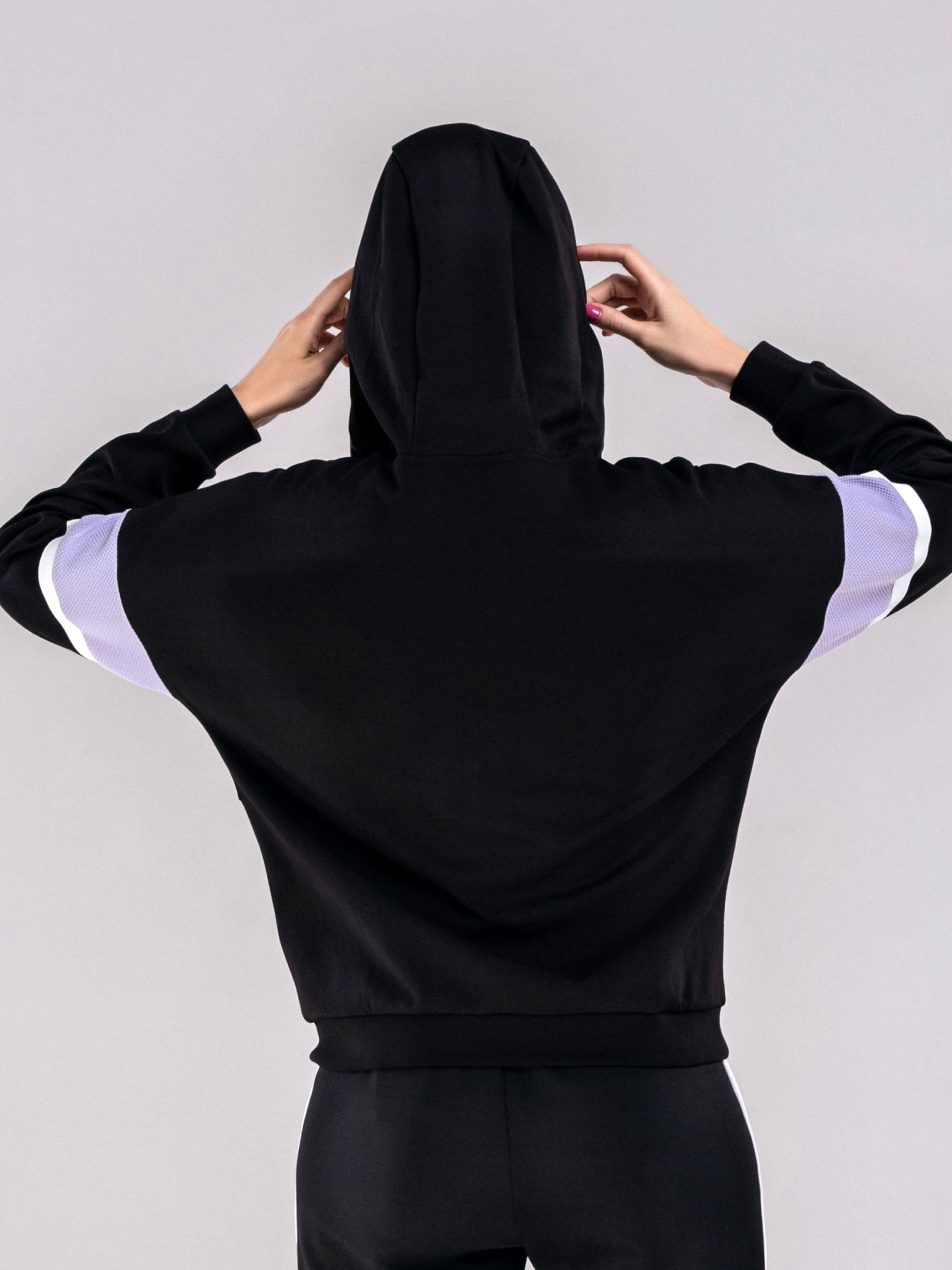 Женская толстовка черного цвета с элементами лавандового. - Натуральная ткань приятна для тела. - Капюшон декорирован тонкой резинкой для регулировки объема по овалу лица. - Толстовка с капюшоном, свободного асимметричного кроя, плечо изделия спущено. - Низ и рукава с широкой резинкой. - По всей длине изделия удобна молния. - Впереди есть два функциональных кармана на молнии. Материал: 69,1% хлопок 30,9% полиэстер