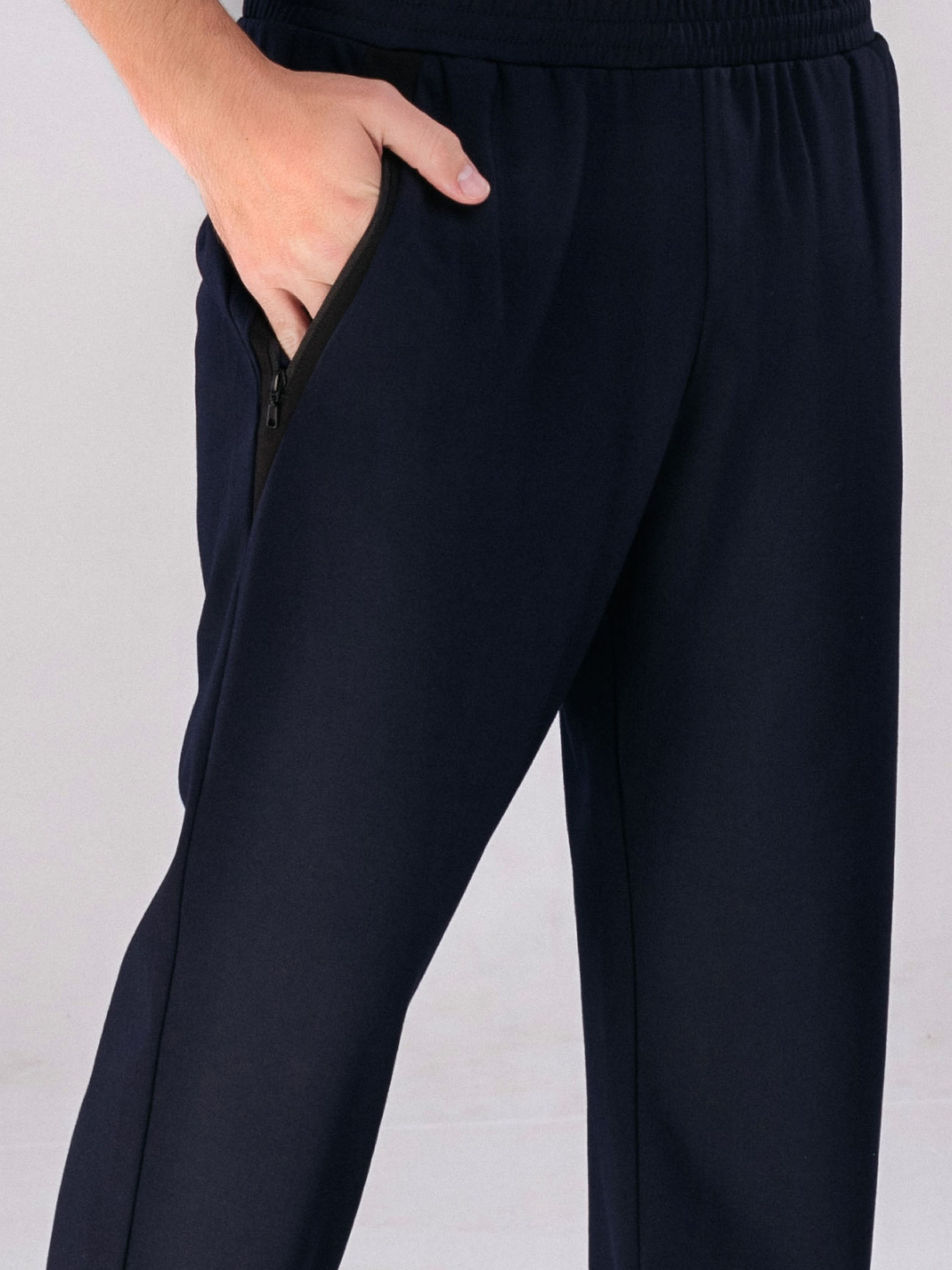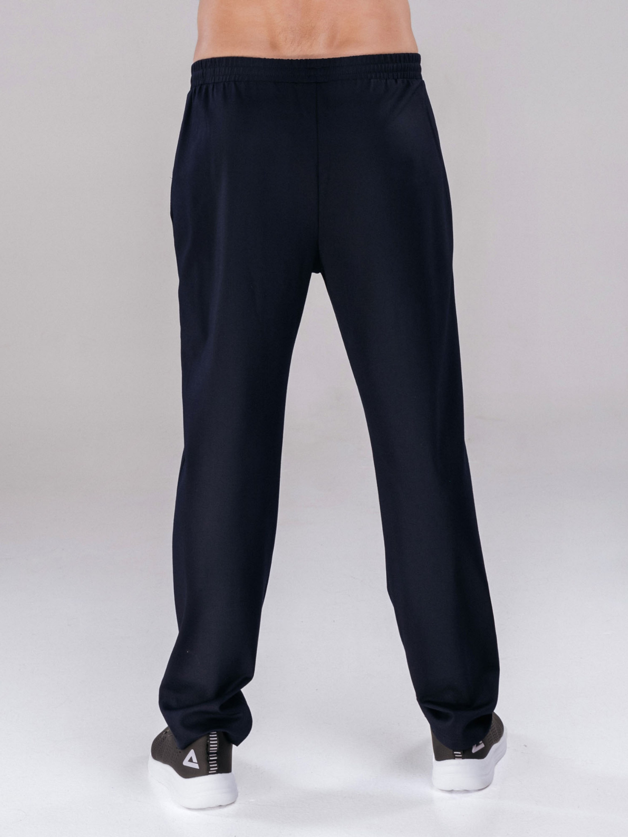 Штаны спортивные мужские, темно-синего цвета - Модель прямого кроя - Имеют боковые карманы на молнии. - Средняя посадка, пояс на резинке, дополнительно регулируемый специальной шнуровкой. - Выполнены из высококачественного синтетического материала. - Материал не подвержен деформациям, приятный к телу, хорошо пропускает воздух. - Подходят как для занятий спортом, так и для повседневного использования. Материал: 65.8%вискоза 29.9%полиамид 4.3%спандекс