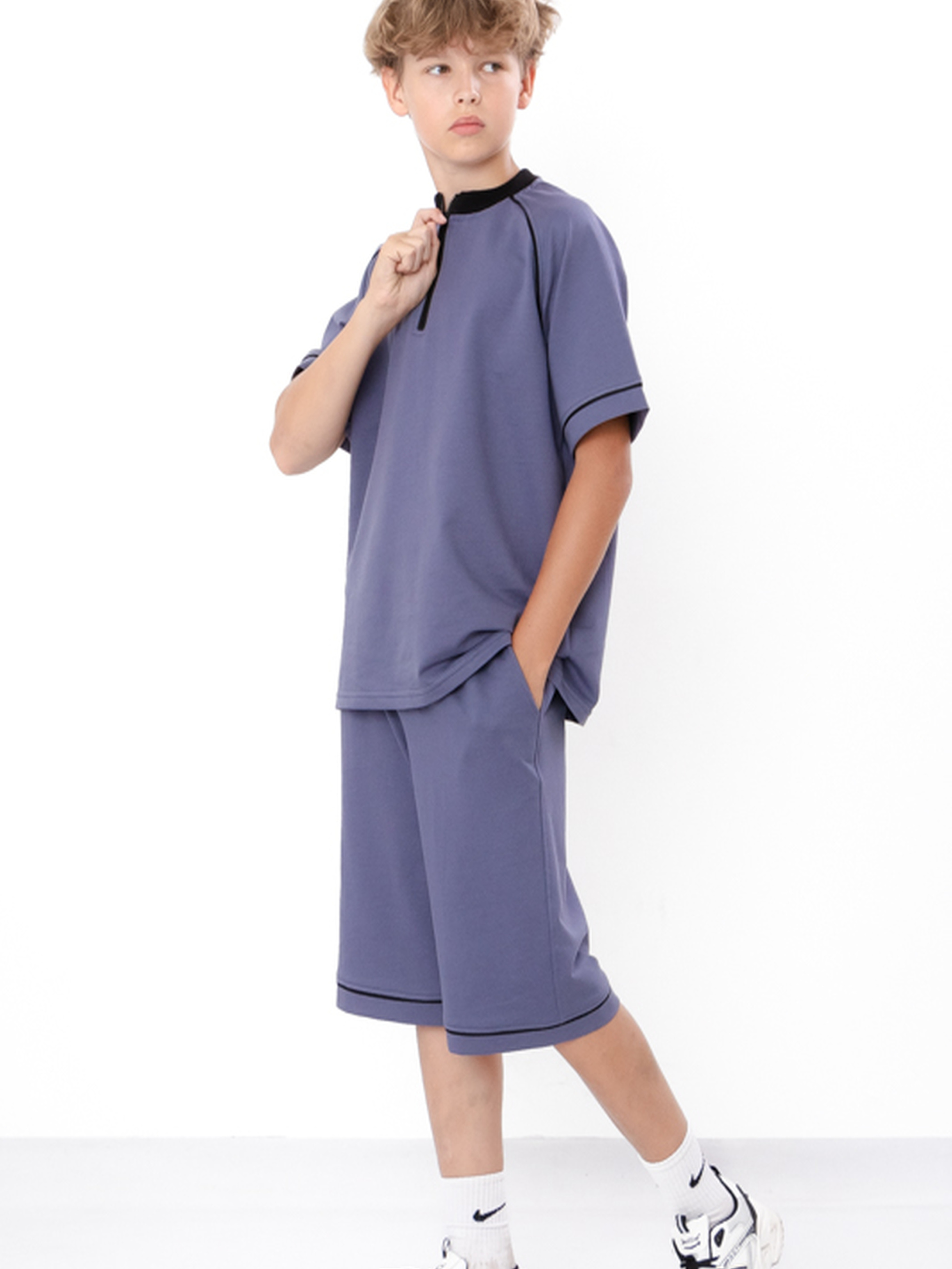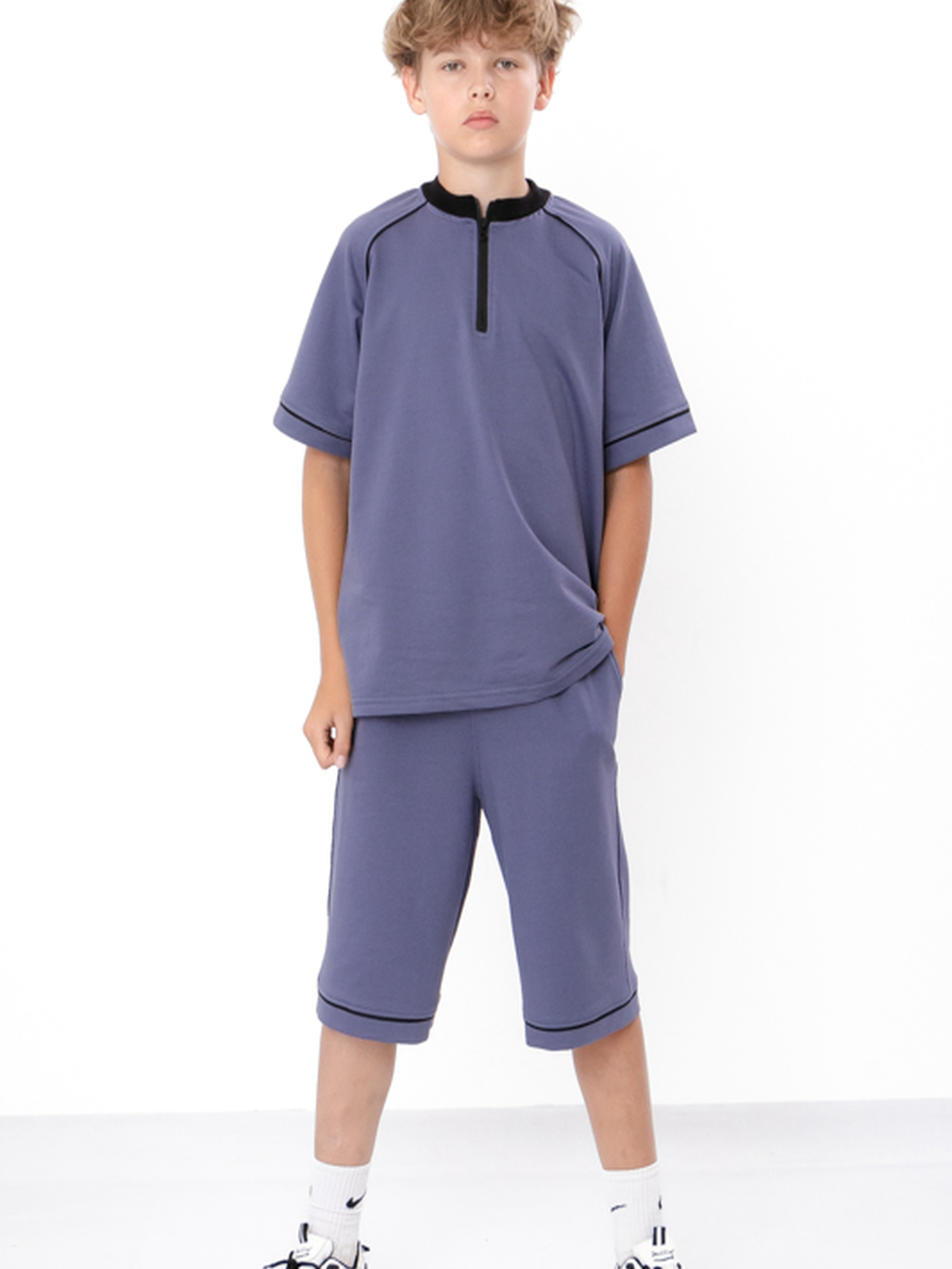 Полотно: двонитка однотонна Склад полотна: 80% бавовна, 20% поліестер Зріст: 140–170 см Підлітковий комплект для хлопчика (футболка + шорти) — стильне та комфортне рішення для щоденного носіння. Виготовлений із міцної двонитки, що зберігає форму та колір після прання. Футболка з коротким рукавом, стоячим коміром і блискавкою має вільний крій і сучасний спортивний стиль. Шорти до коліна з резинкою на поясі та боковими кишенями забезпечують зручність і свободу рухів. Ідеальний вибір для прогулянок, школи та активного відпочинку.