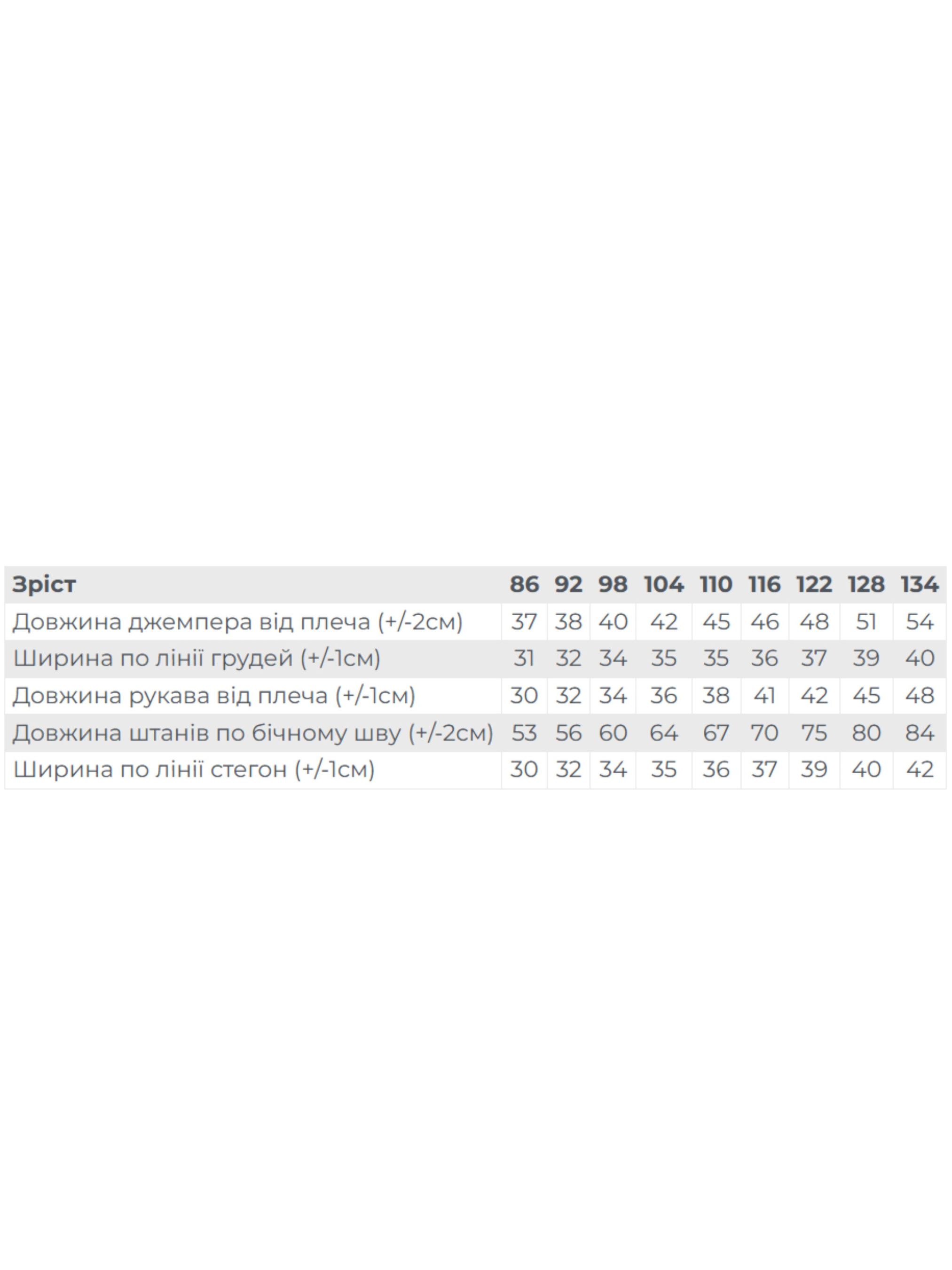 Полотно: двонитка однотонна Склад полотна: 80% бавовна, 20% поліестер Зріст: 86-134 Спортивний костюм для хлопчика виготовлений з якісної двониткової тканини. Комплект включає в себе стильну толстовку з капюшоном та зручні штани. Толстовка оснащена капюшоном і широкими еластичними манжетами на рукавах та по низу. Штани мають зручний пояс та два бокових кишені. Як толстовка, так і штани прикрашені сучасним принтом. Цей костюм ідеально підходить для щоденного носіння, занять спортом або активного відпочинку. Матеріал високої якості забезпечує довговічність, а правильний догляд дозволить носити костюм протягом кількох сезонів. Може трохи зменшитися після прання.