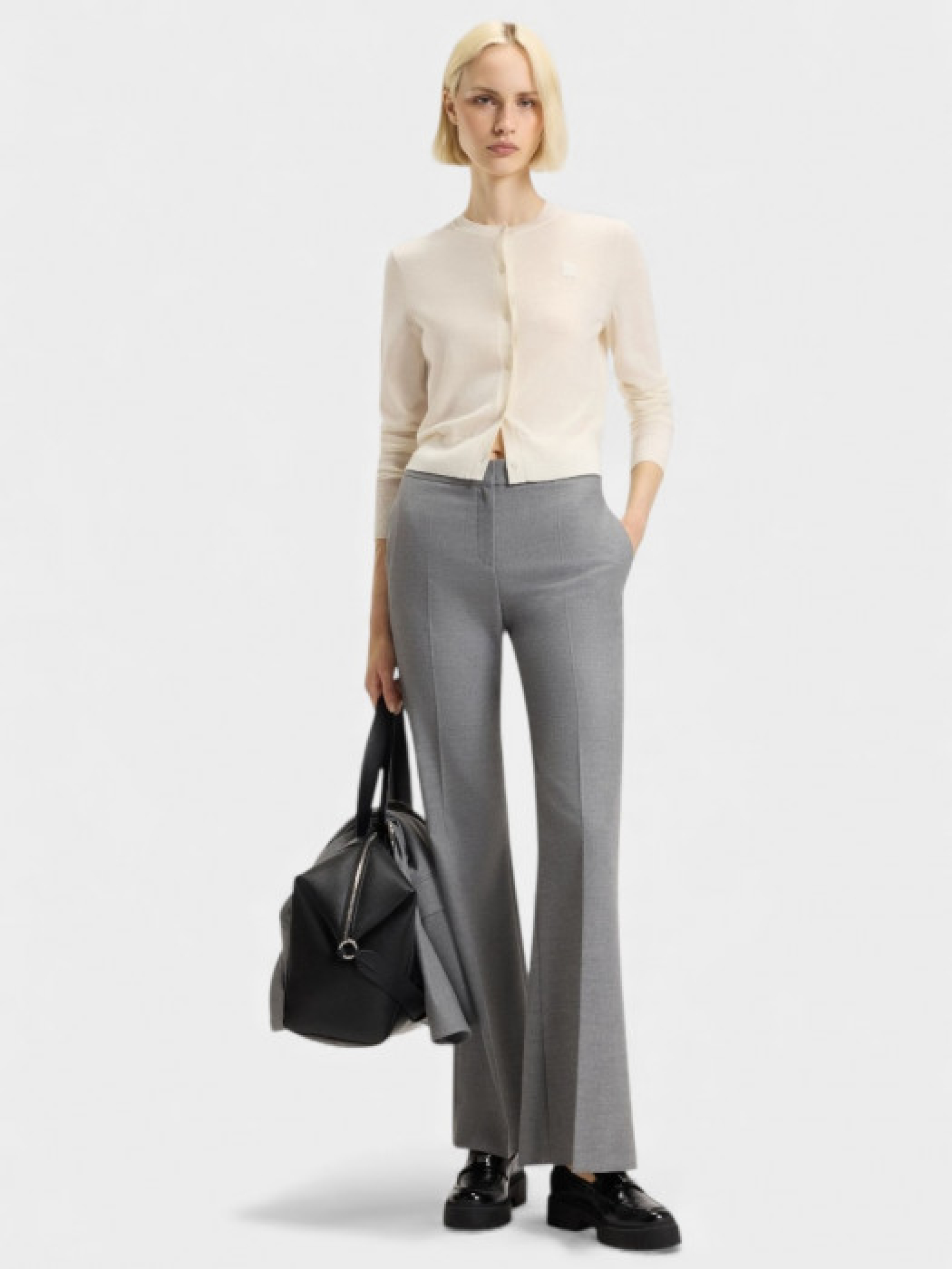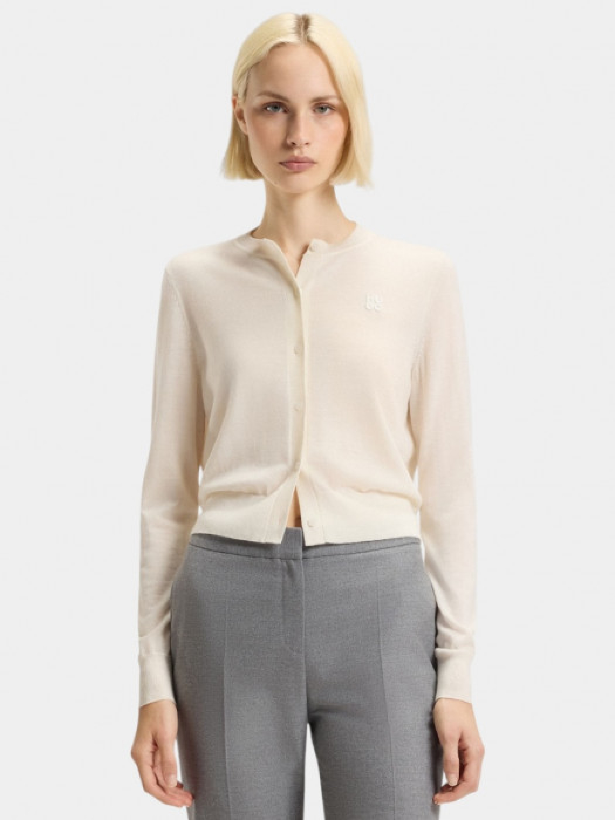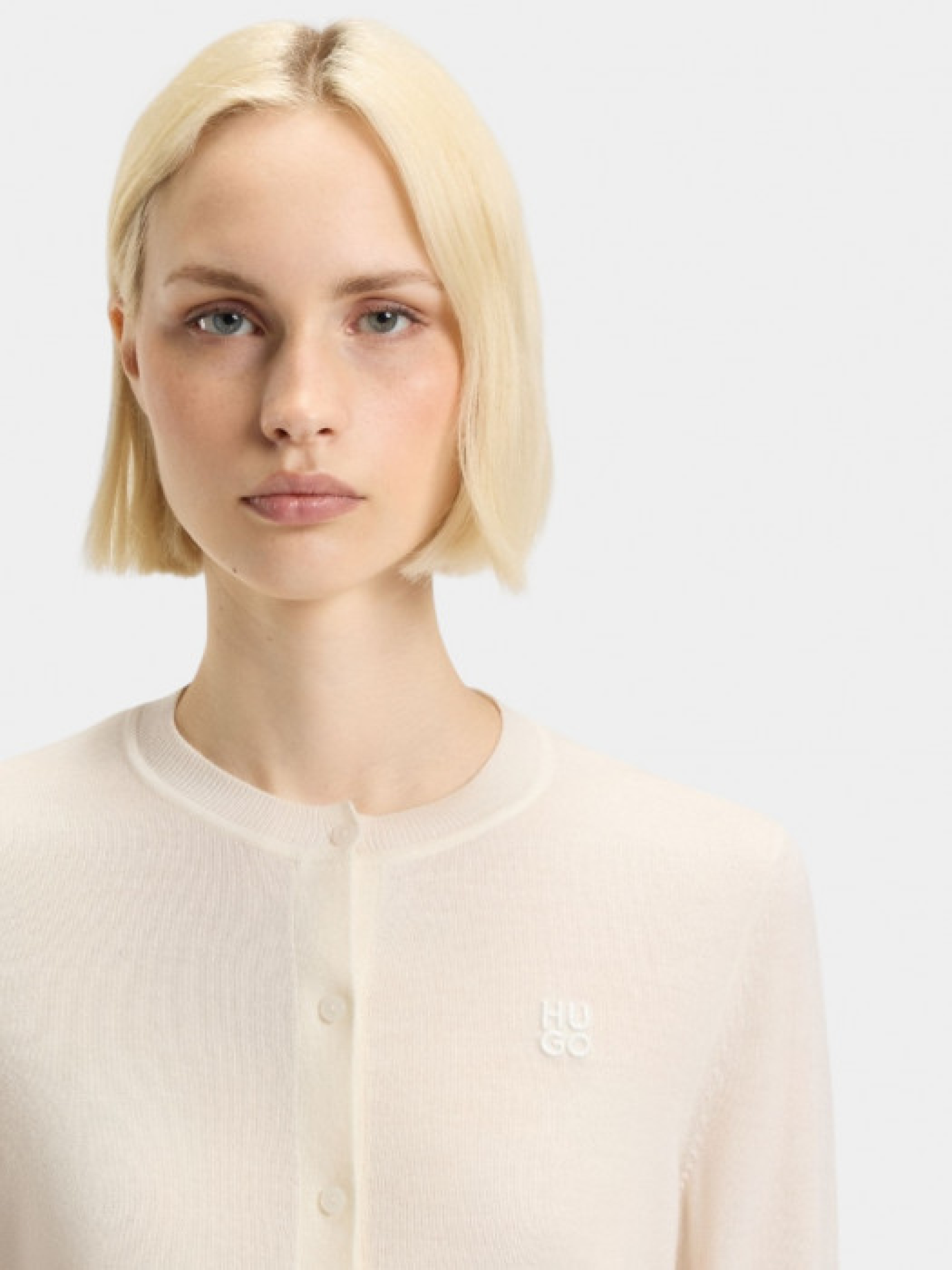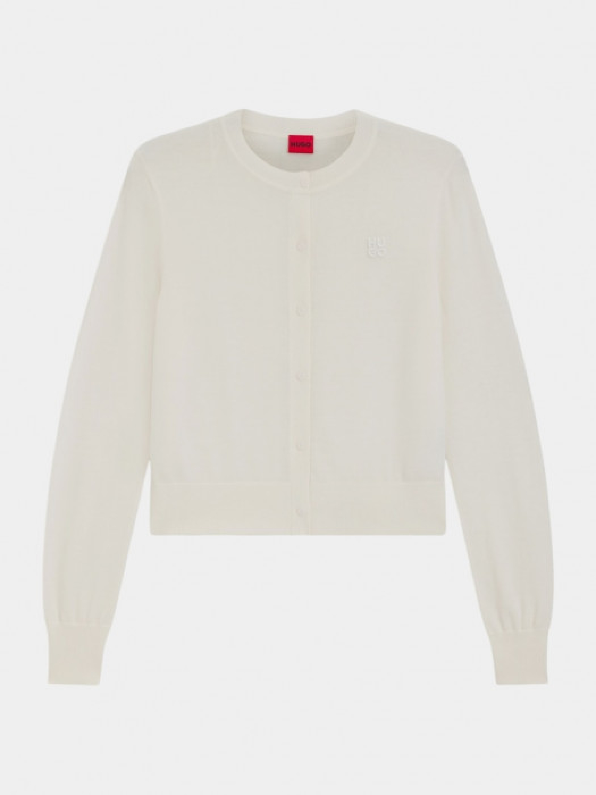 Кардиган HUGO Womenswear создан для комфортной ежедневной носки и легко сочетается с повседневными образами. Модель выполнена из шерсти мериноса, которая регулирует температуру тела, имеет круглый вырез, длинные рукава, застегивается на пуговицы и дополнена тональным вышитым логотипом. В составе по меньшей мере 60% лучших сырьевых материалов, в частности шерсть ответственного происхождения без применения мюлзинга и согласно стандартам «Пяти свобод» благосостояния животных. Длина по спине – 50 см. Рост модели: 180 см, параметры 83-61-91. На модели размер S.