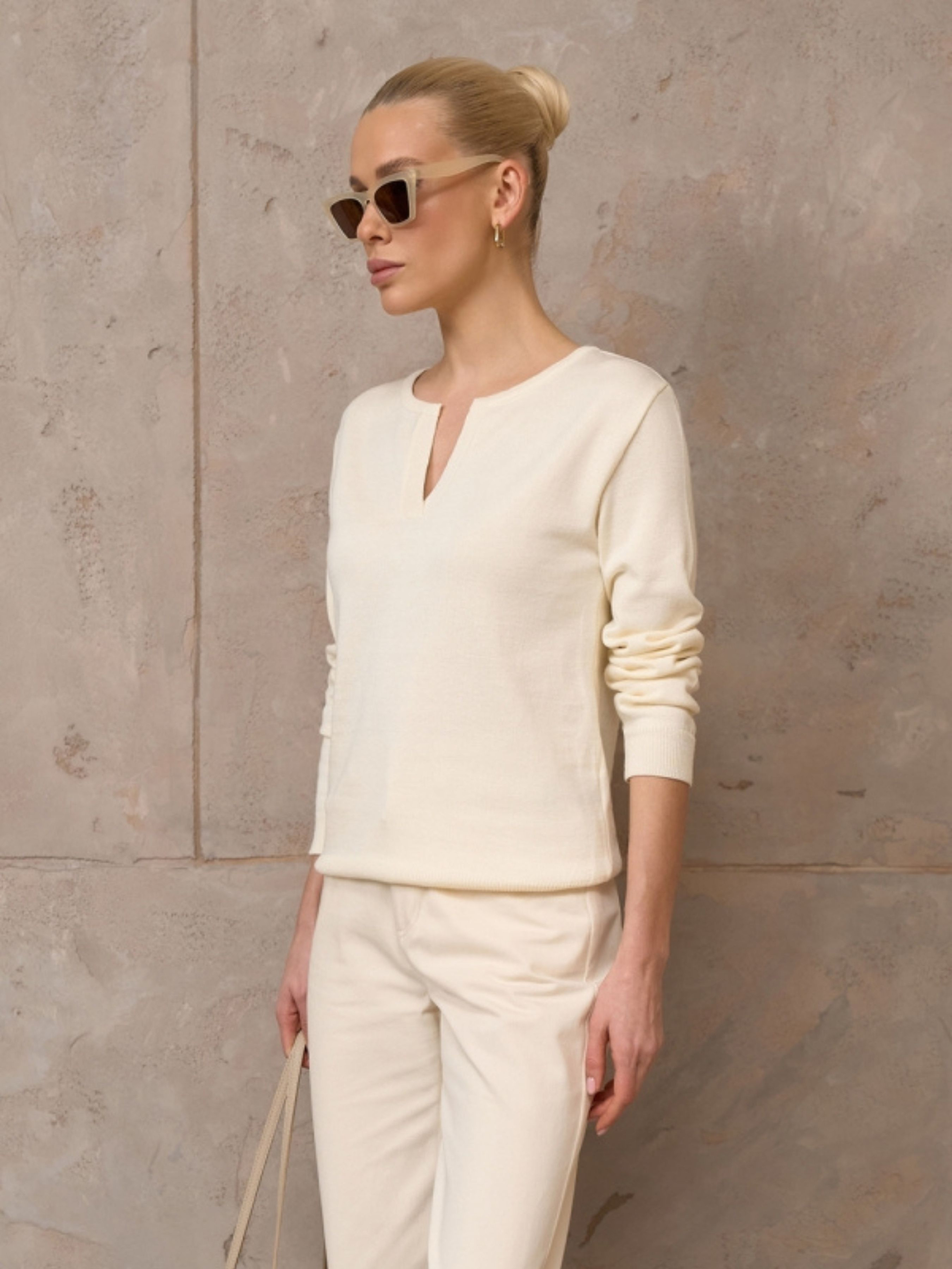 Жіночий базовий джемпер із бавовни з V-вирізом — це фундамент сучасного гардероба, де лаконічність зустрічається з бездоганним комфортом. Завдяки високому вмісту натуральної бавовни та акцентному вирізу, ця модель виглядає витончено та водночас дарує відчуття м'якості протягом усього дня. Це універсальне рішення, яке легко адаптується під будь-який настрій — від суворого офісного стилю до розслабленого образу для вихідного дня. Характеристики Матеріал: Високоякісна трикотажна пряжа. Склад: 80% бавовна, 20% віскоза (натуральна бавовна забезпечує повітропроникність, а віскоза додає виробу шовковистості та міцності). Тканина: М'який трикотаж (приємний до тіла, гіпоалергенний). Виріз: V-подібний (візуально подовжує лінію шиї та акцентує увагу на ключицях). Фасон: Прямий базовий крій (classic fit). Стиль: Базовий / Мінімалізм / Кежуал (casual). Сезон: Демісезон (осінь/весна), всесезонний варіант для приміщень. Чому цей джемпер стане вашим улюбленим? Витончений акцент: V-подібний виріз додає лаконічному джемперу жіночності та дозволяє створювати цікаві багатошарові образи, поєднуючи його з сорочками або топами. Природний комфорт: Високий вміст бавовни дозволяє шкірі «дихати», що робить джемпер ідеальним вибором для тривалого носіння в офісі чи на навчанні. Ідеальна посадка: Завдяки додаванню віскози, трикотаж дуже еластичний — він м'яко облягає фігуру, не сковуючи рухів і не втрачаючи форму з часом. Універсальність: Це справжній «чистий аркуш» для ваших аксесуарів — додайте масивний ланцюжок для вечірнього виходу або лаконічну підвіску для повсякденних справ. Легкість у догляді: Суміш бавовни та віскози менше схильна до появи ковтунців і добре зберігає колір навіть після багаторазового прання. Рекомендації з догляду Прання: Делікатне машинне або ручне прання при температурі не вище 30°C. Рекомендується прати у вивернутому стані. Засоби: Використовуйте м’які рідкі гелі для трикотажу. Уникайте агресивних засобів та відбілювачів. Сушіння: Сушіть виріб у розправленому вигляді на горизонтальній поверхні. Важливо: не сушіть на вішалці, щоб бавовняна нитка не розтягувалася під власною вагою. Прасування: Зазвичай джемпер майже не мнеться. За необхідності скористайтеся вертикальним відпарювачем або прасуйте з виворітного боку на низькій температурі.
