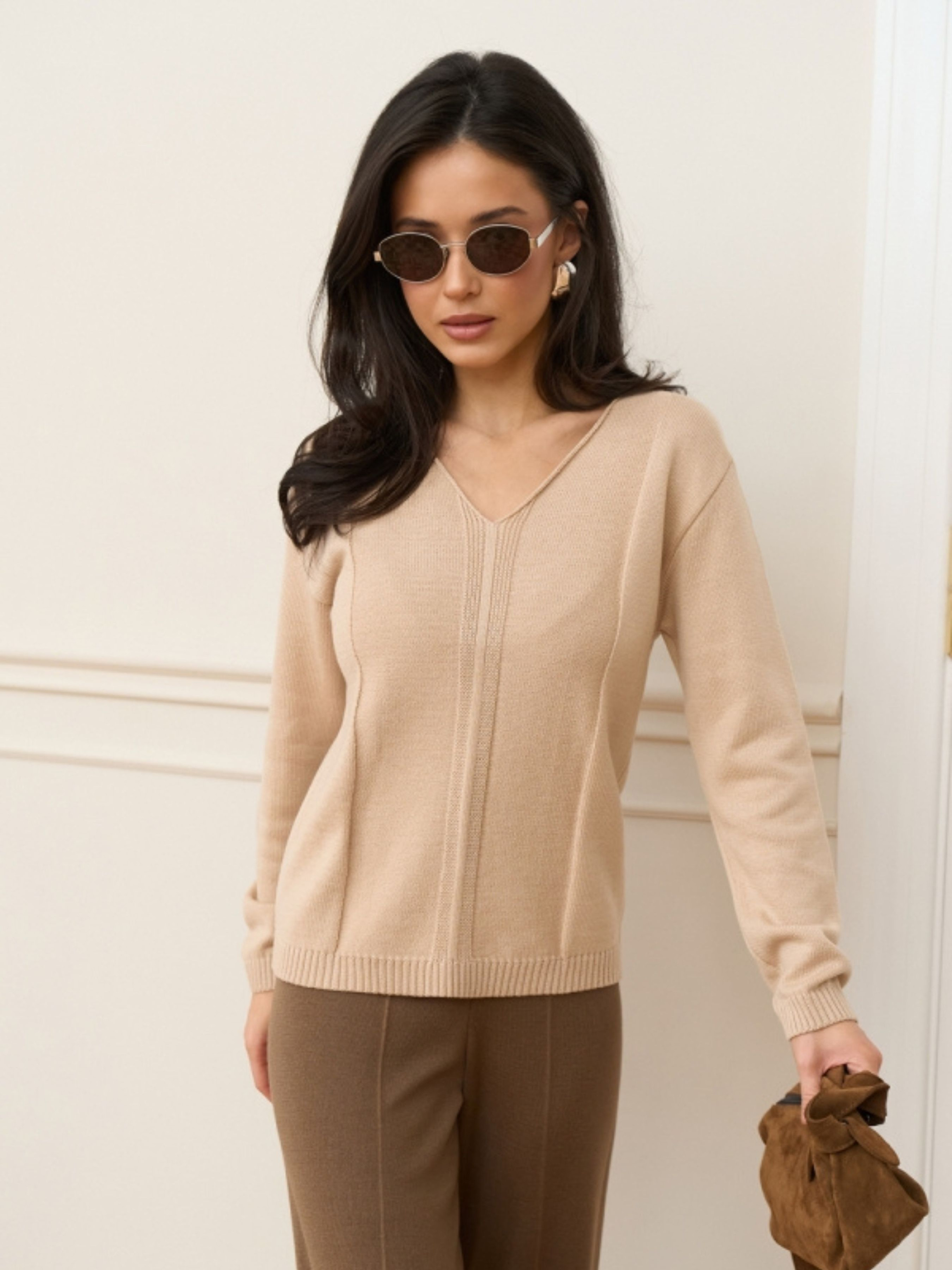 Жіночий джемпер із бавовняної пряжі — це базовий елемент гардероба, у якому бездоганно поєднуються класична елегантність та щоденний комфорт. Завдяки високому вмісту натуральної бавовни та лаконічному дизайну, ця модель стане вашим надійним супутником у створенні стильних образів для офісу, навчання чи прогулянок. Витончений V-подібний виріз та вільний силует додають образу жіночності, залишаючи простір для легкості та свободи рухів. Дизайнерські рішення та стилізація V-подібний виріз: Візуально подовжує лінію шиї та робить силует стрункішим. Це ідеальне рішення для поєднання з базовими топами або класичними сорочками з комірцем. Вертикальний візерунок: Тонке фактурне плетіння спереду та ззаду додає джемперу візуальної глибини та створює стильний вертикальний акцент, який робить фігуру витонченішою. Вільний силует (Relaxed fit): Забезпечує актуальну розслаблену посадку, яка легко комбінується як із вузькими джинсами-скіні, так і з широкими штанами-палаццо. Універсальність: Завдяки гладкій фактурі та стриманому декору, джемпер легко інтегрується у багатошарові образи під жакет або пальто. Характеристики: Склад: 80% Бавовна, 20% Віскоза. Фактура: Щільна гладка в’язка. Виріз: V-подібний. Силует: Вільний (Oversize-friendly). Особливості: Вертикальний візерунок спереду і ззаду. Сезон: Демісезон (весна/осінь). Країна виробник: Україна. Рекомендації з догляду: Бавовняна пряжа з віскозою потребує дбайливого догляду для збереження форми: Машинне прання в делікатному режимі при температурі не вище 30°C. Використовуйте м’які рідкі засоби для прання. Не відбілювати та не викручувати на високих обертах. Сушити у розправленому вигляді на горизонтальній поверхні. Прасувати з виворітного боку при низькій або середній температурі.