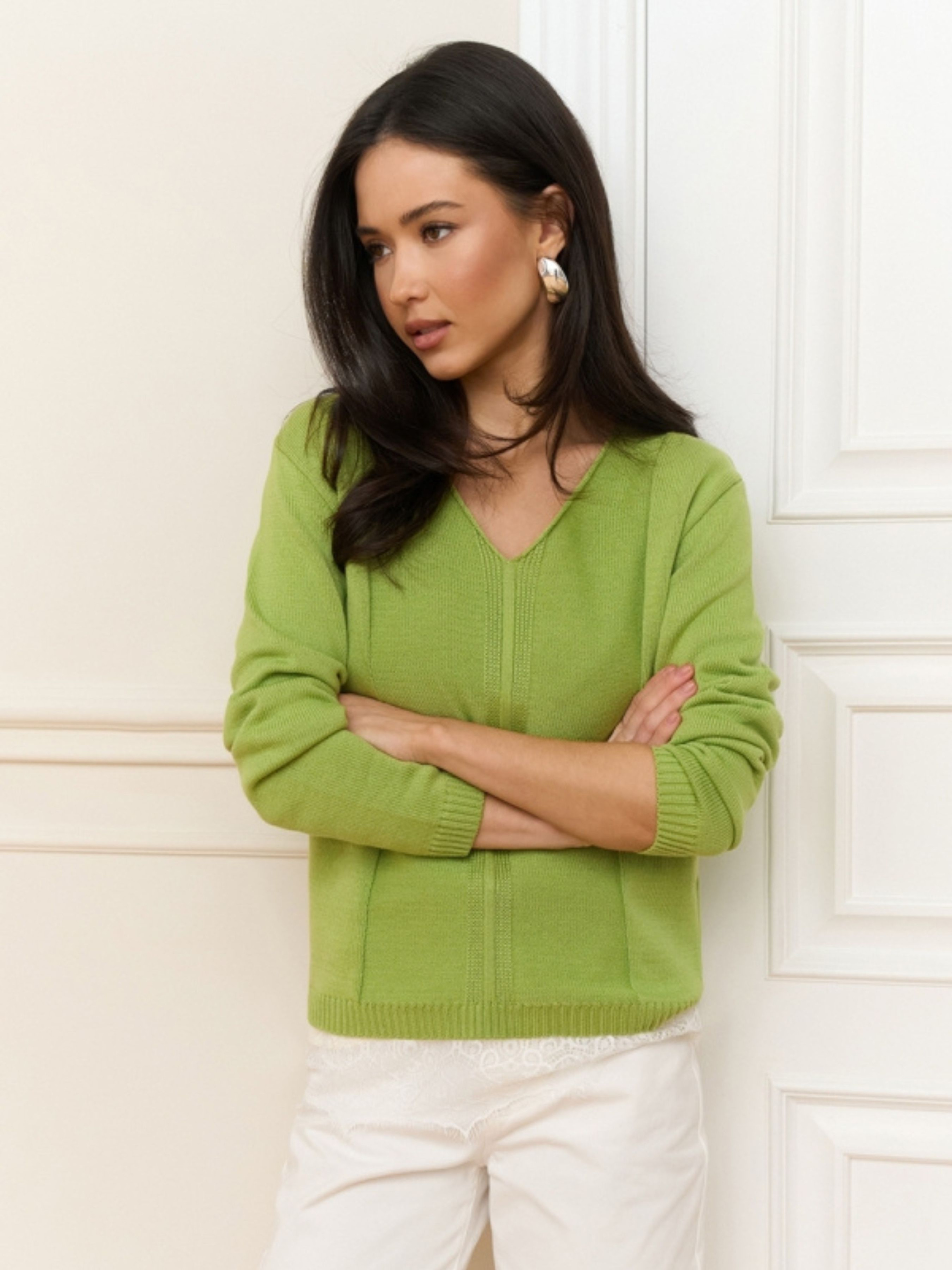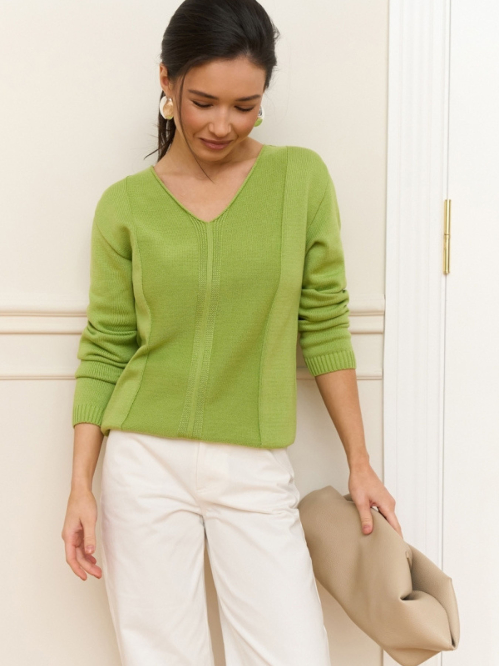 Жіночий джемпер із бавовняної пряжі — це базовий елемент гардероба, у якому бездоганно поєднуються класична елегантність та щоденний комфорт. Завдяки високому вмісту натуральної бавовни та лаконічному дизайну, ця модель стане вашим надійним супутником у створенні стильних образів для офісу, навчання чи прогулянок. Витончений V-подібний виріз та вільний силует додають образу жіночності, залишаючи простір для легкості та свободи рухів. Дизайнерські рішення та стилізація V-подібний виріз: Візуально подовжує лінію шиї та робить силует стрункішим. Це ідеальне рішення для поєднання з базовими топами або класичними сорочками з комірцем. Вертикальний візерунок: Тонке фактурне плетіння спереду та ззаду додає джемперу візуальної глибини та створює стильний вертикальний акцент, який робить фігуру витонченішою. Вільний силует (Relaxed fit): Забезпечує актуальну розслаблену посадку, яка легко комбінується як із вузькими джинсами-скіні, так і з широкими штанами-палаццо. Універсальність: Завдяки гладкій фактурі та стриманому декору, джемпер легко інтегрується у багатошарові образи під жакет або пальто. Характеристики: Склад: 80% Бавовна, 20% Віскоза. Фактура: Щільна гладка в’язка. Виріз: V-подібний. Силует: Вільний (Oversize-friendly). Особливості: Вертикальний візерунок спереду і ззаду. Сезон: Демісезон (весна/осінь). Країна виробник: Україна. Рекомендації з догляду: Бавовняна пряжа з віскозою потребує дбайливого догляду для збереження форми: Машинне прання в делікатному режимі при температурі не вище 30°C. Використовуйте м’які рідкі засоби для прання. Не відбілювати та не викручувати на високих обертах. Сушити у розправленому вигляді на горизонтальній поверхні. Прасувати з виворітного боку при низькій або середній температурі.
