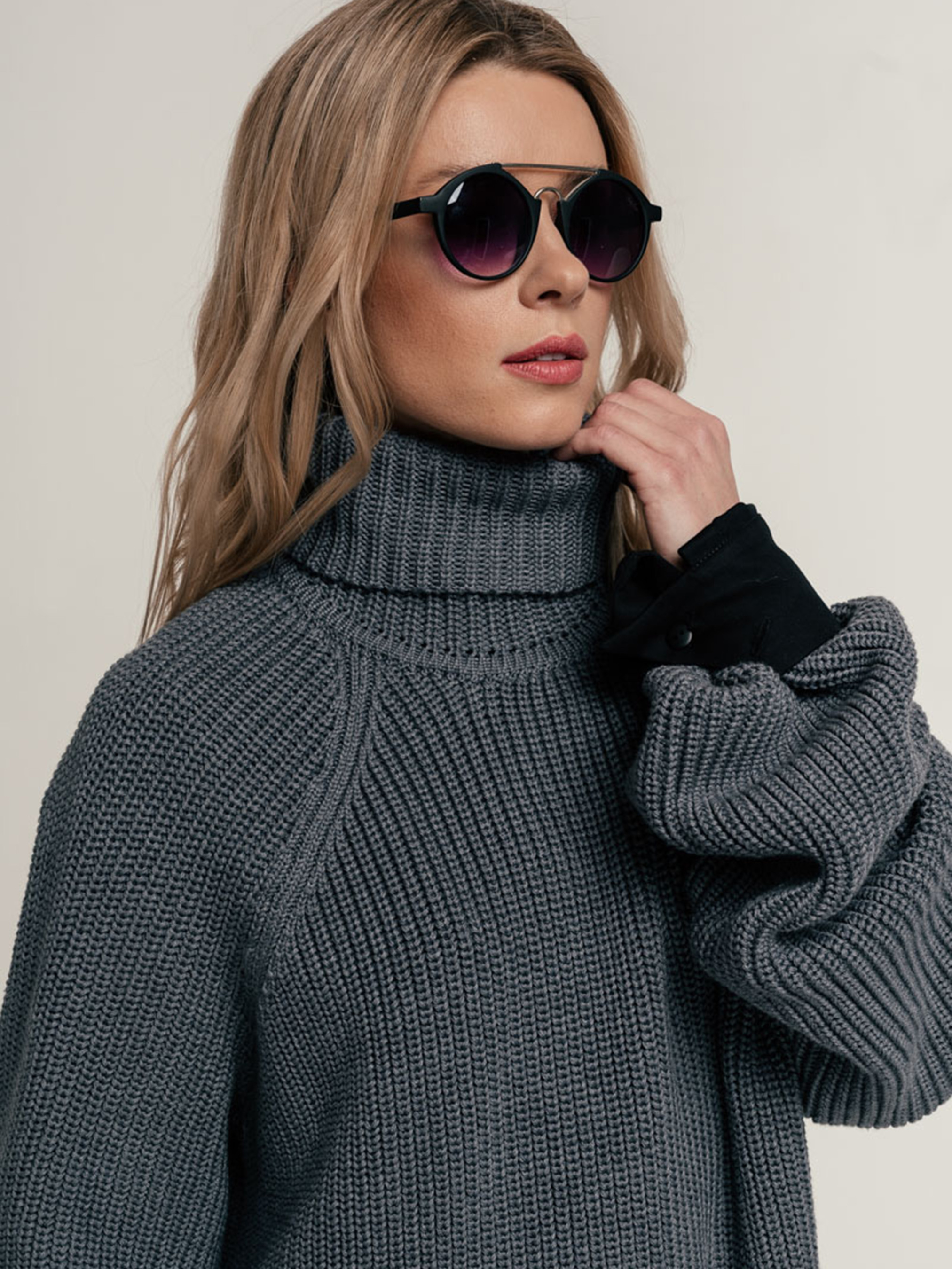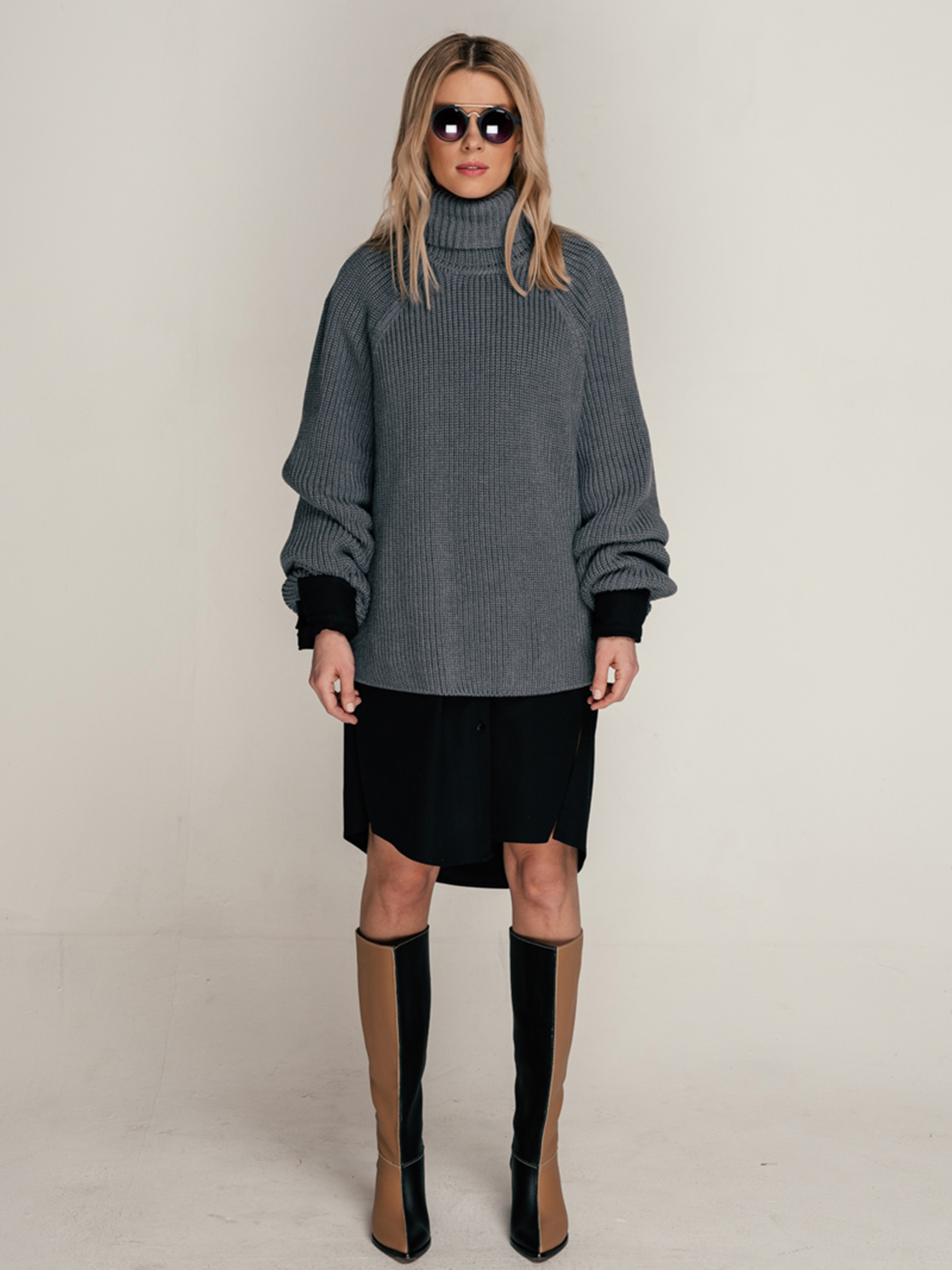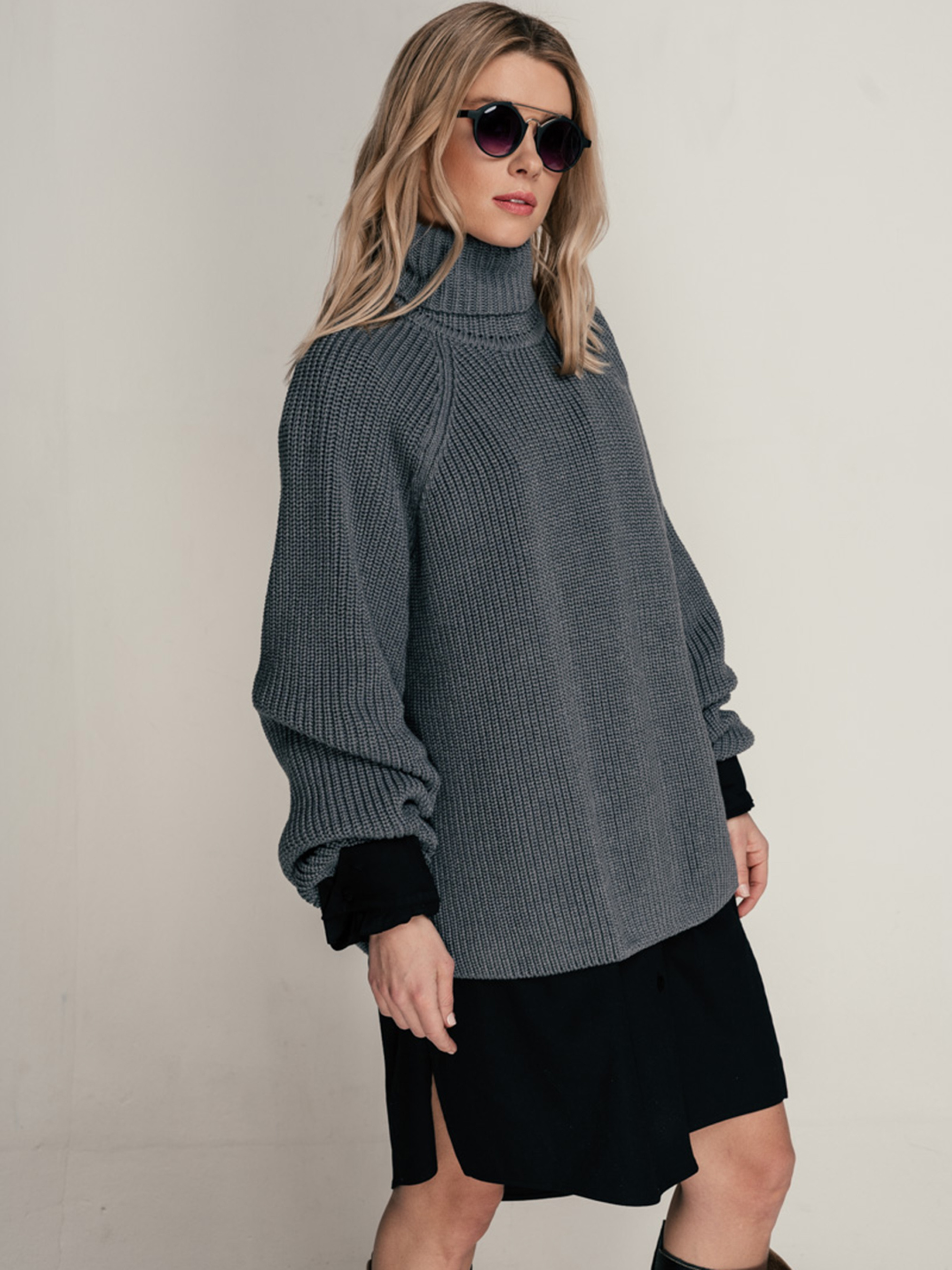 Свитер свободного кроя- оверсайз, крупной вязки с высоким воротником. Рукав реглан, ровный к низу и чуть удлиненный.