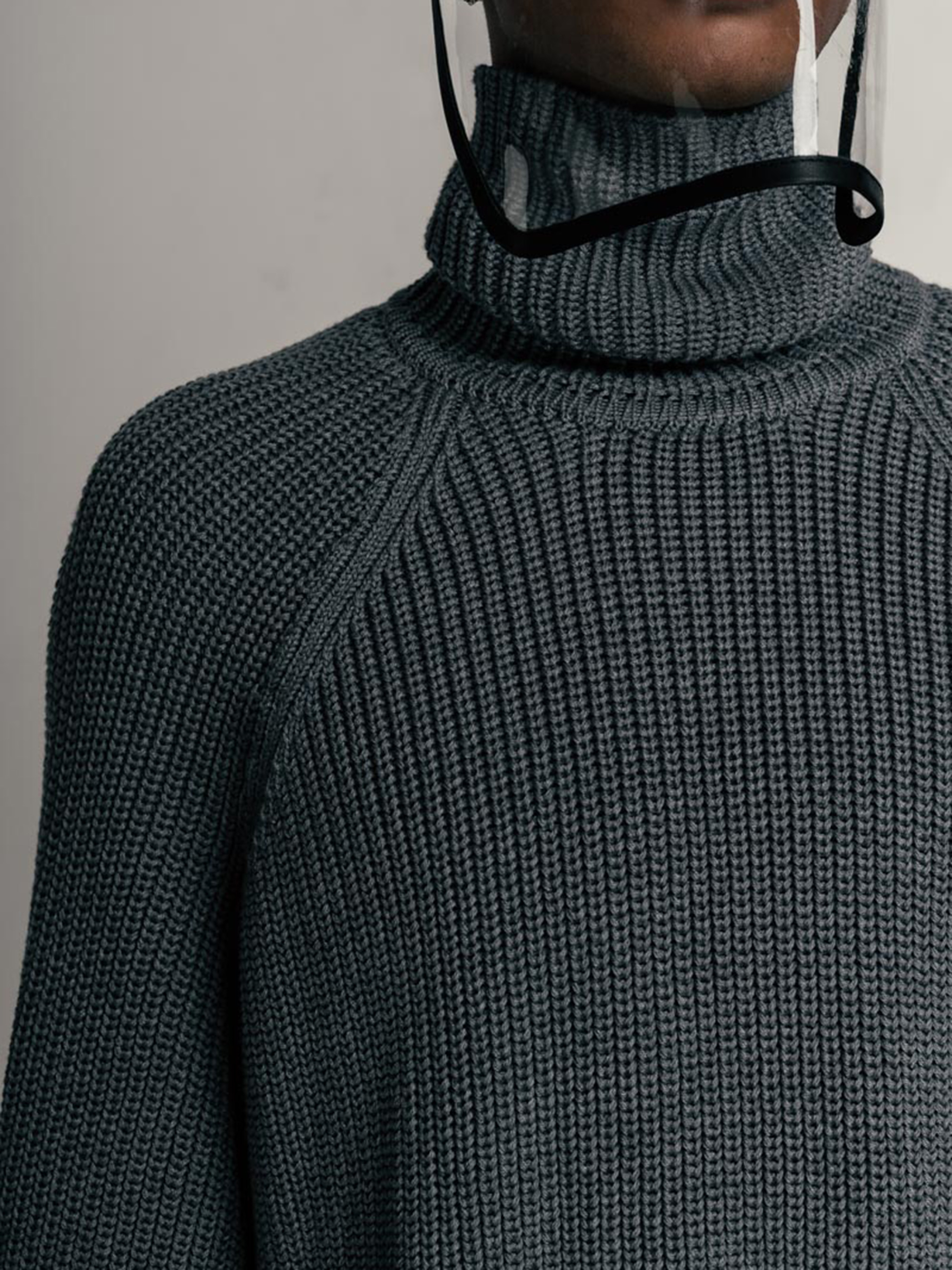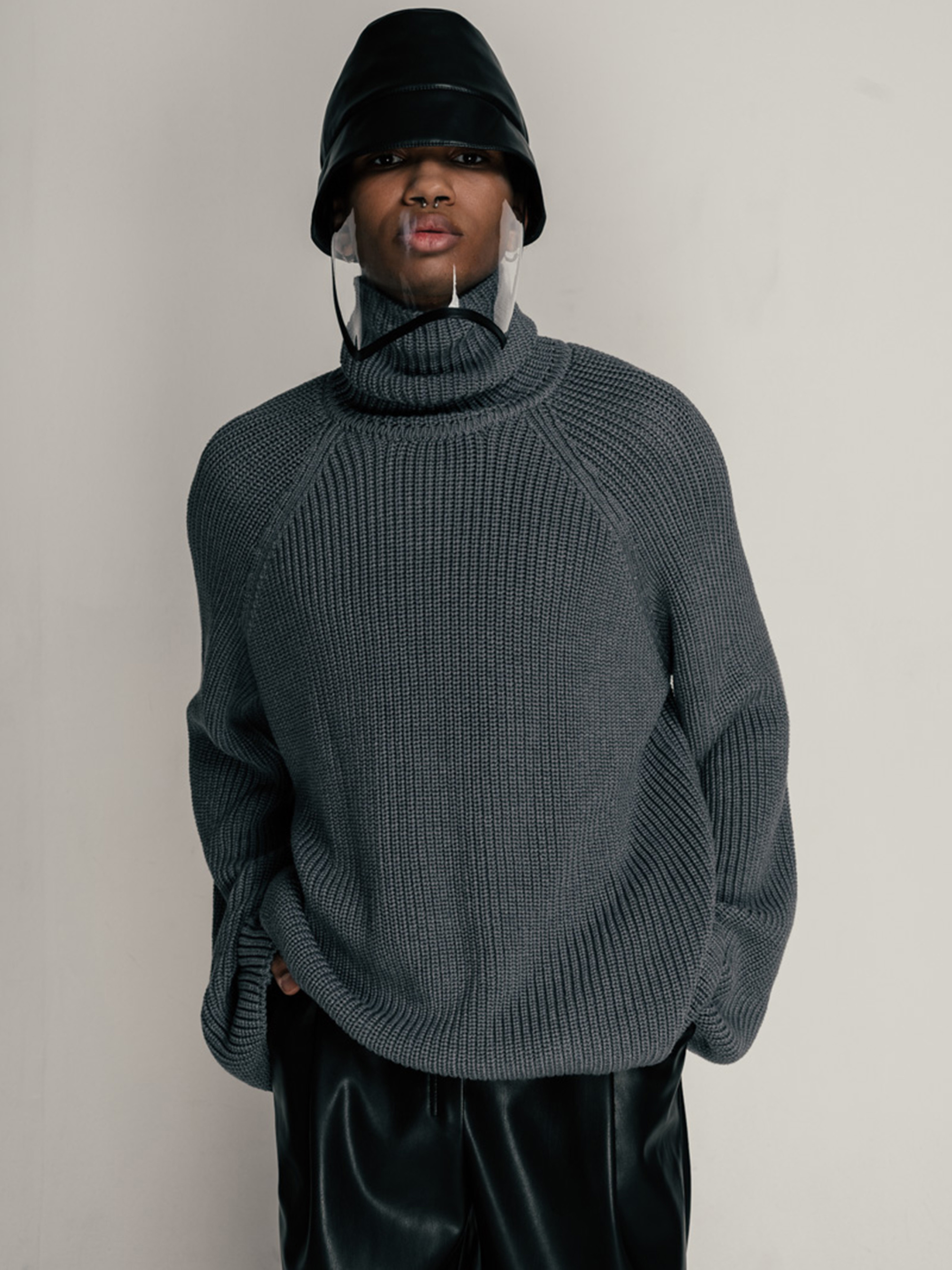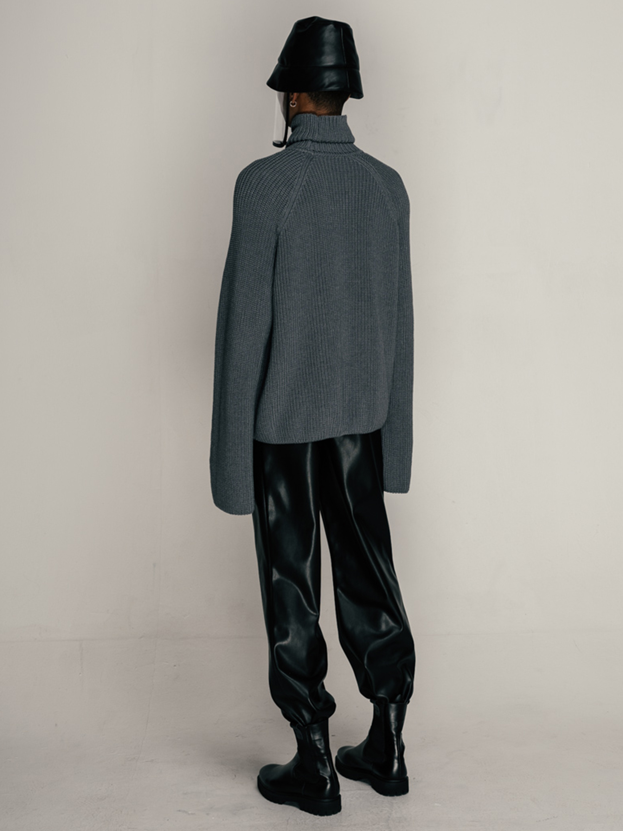 Свитер свободного кроя- оверсайз, крупной вязки с высоким воротником. Рукав реглан, ровный к низу и чуть удлиненный.