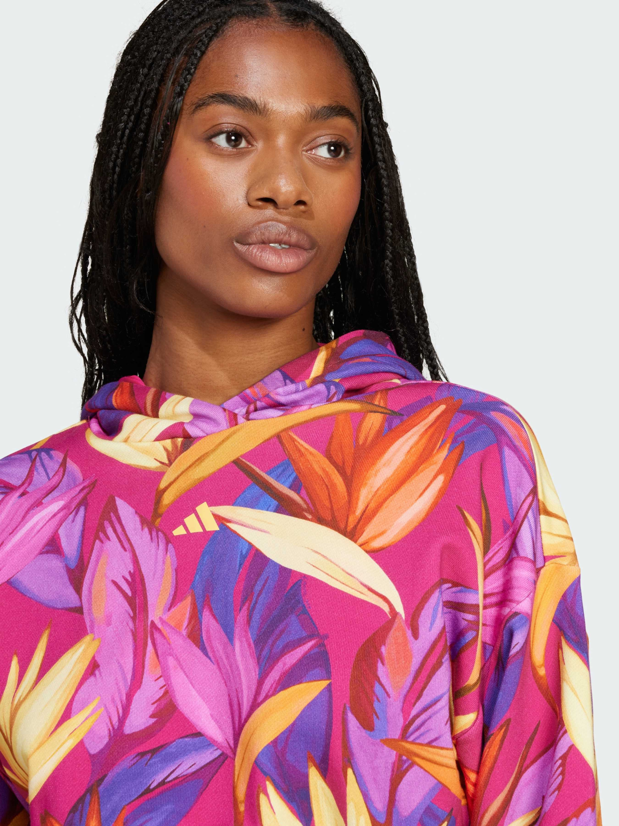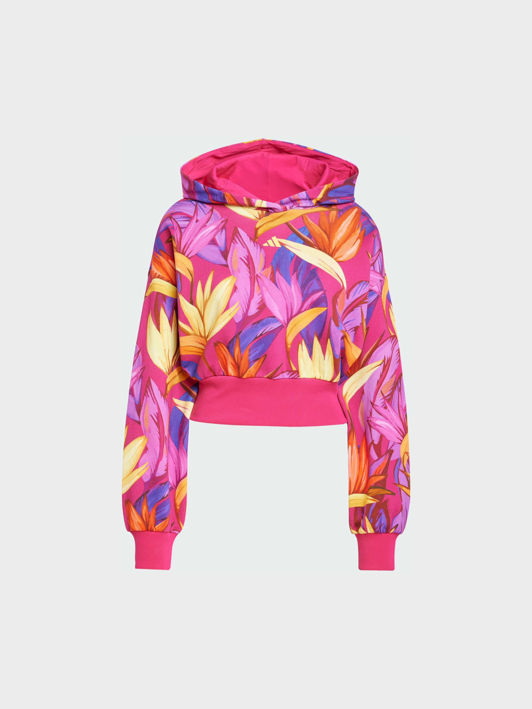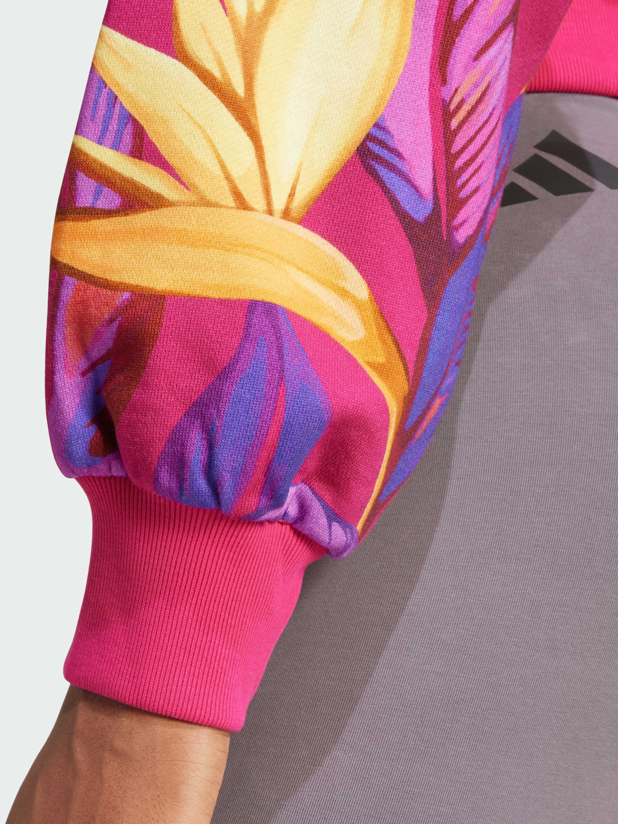 Характеристики 100% хлопок Заниженная линия плеч Рифленые манжеты и нижний край С капюшоном Стандартный крой Сплошной принт FARM Rio Описание Привнеси в свой стиль атмосферу тропиков с этим худи adidas. Созданное в сотрудничестве с FARM Rio, сочетает спортивный комфорт adidas и яркие бразильские мотивы с принтом, вдохновленным пустынным оазисом. Мягкая и эластичная ткань обеспечивает комфорт, а классический крой со спущенными плечами дарит свободу движений. Это худи станет отличным выбором как для активных дней, так и для уютного времяпрепровождения с друзьями, наполняя твое настроение энергией тропиков и яркими красками. Идет размер в размер. Мы рекомендуем заказать модель твоего обычного размера.