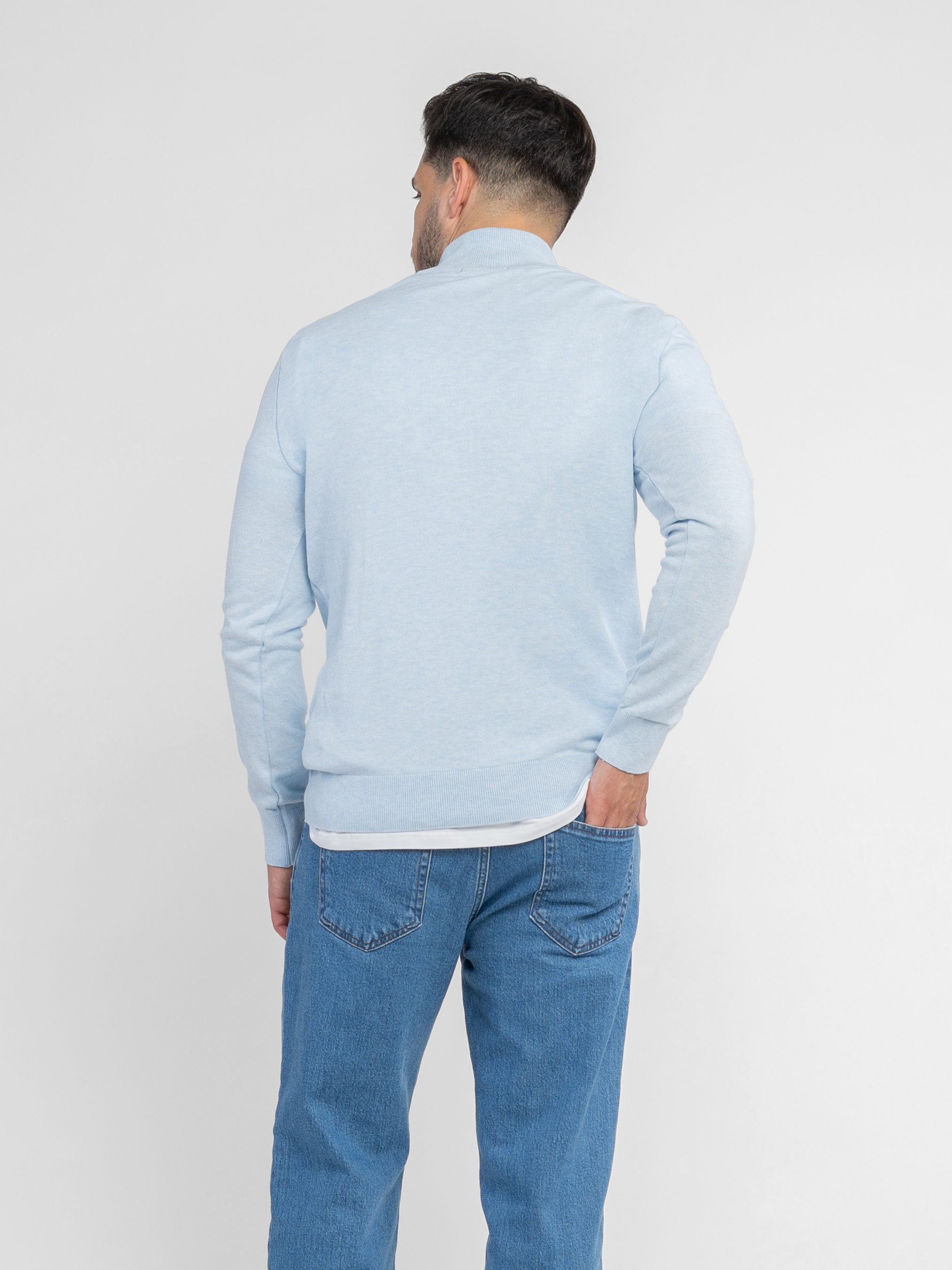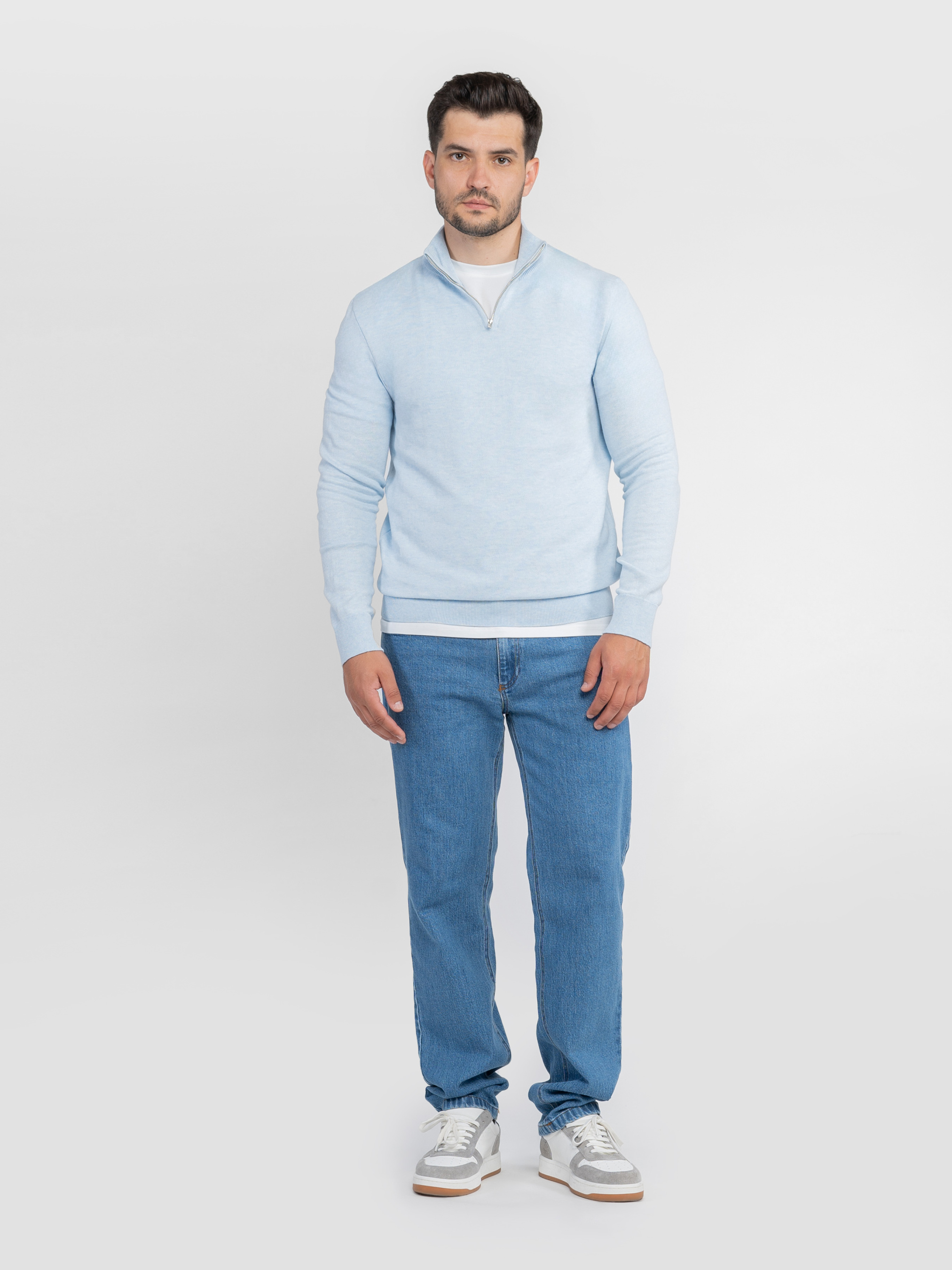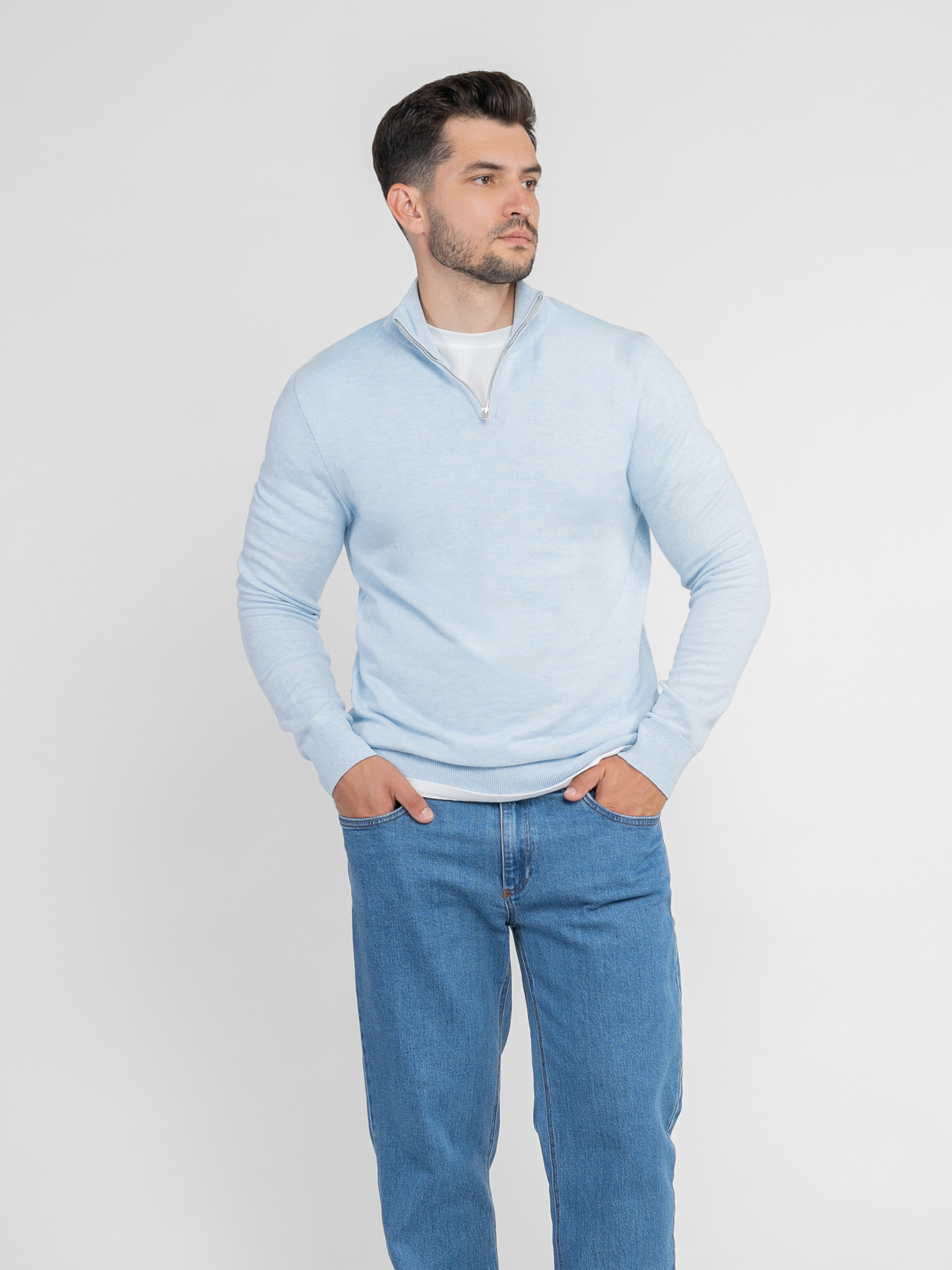 Мужской свитер Arber голубого цвета создан из тонкой пряжи высококачественного хлопка с добавками. Изделие мягкое и приятное на ощупь, фактура дышит и обеспечивает комфорт в течение всего дня. Модель с воротником-стойкой на молнии и длинными рукавами легко сочетается с джинсами или классическими брюками для непринужденного и элегантного образа. Модель на фото: размер 48, рост 180 см, параметры 103/85/97.