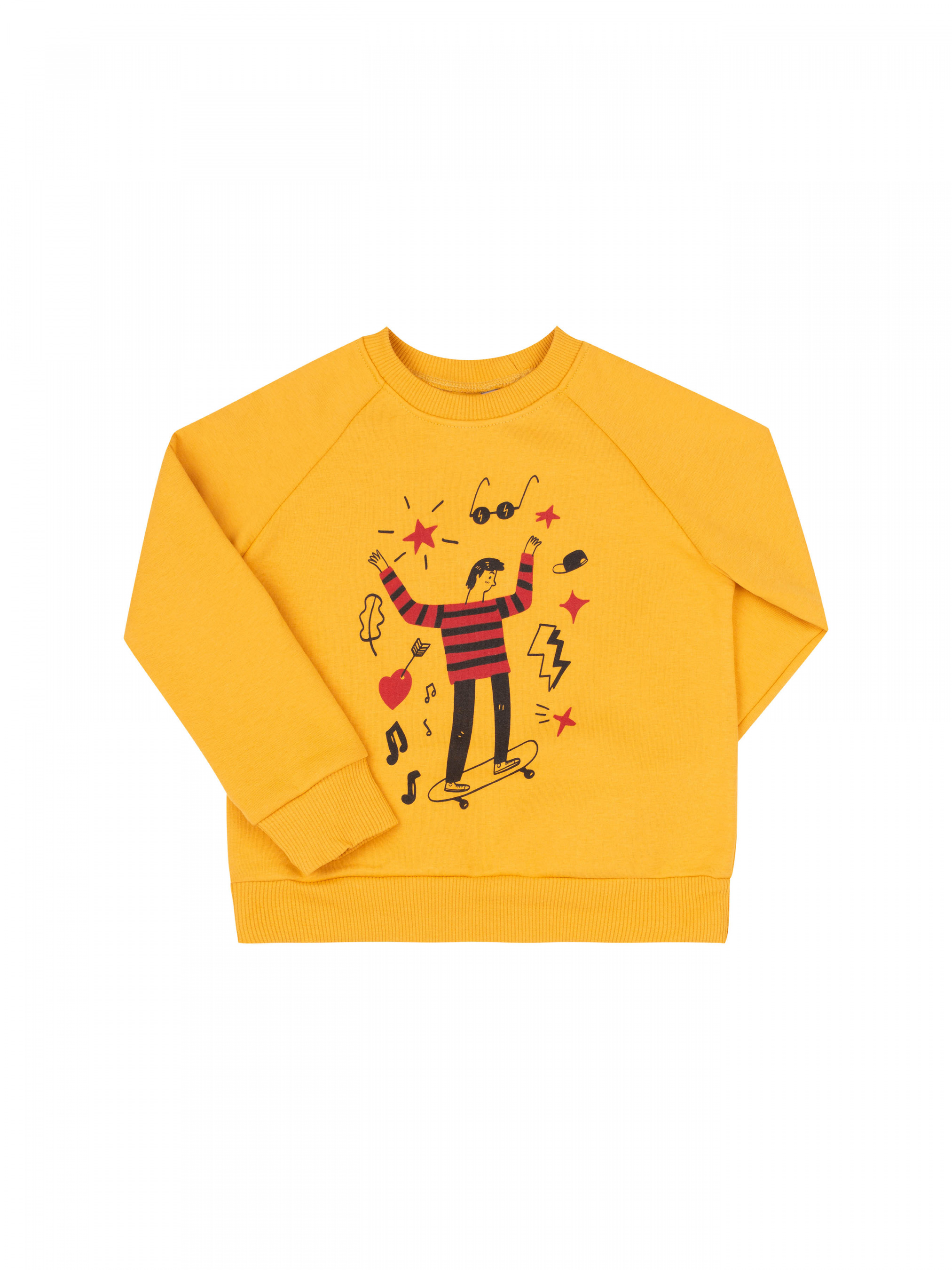 Свитшот з рукавом реглан для хлопчика. Виготовлено з м"якого трикотажу утепленого флісом. Рукав довгий на манжеті. Горловина, низ джемпера та манжет рукава оброблені качкорсою. Спереду цікавий друк.