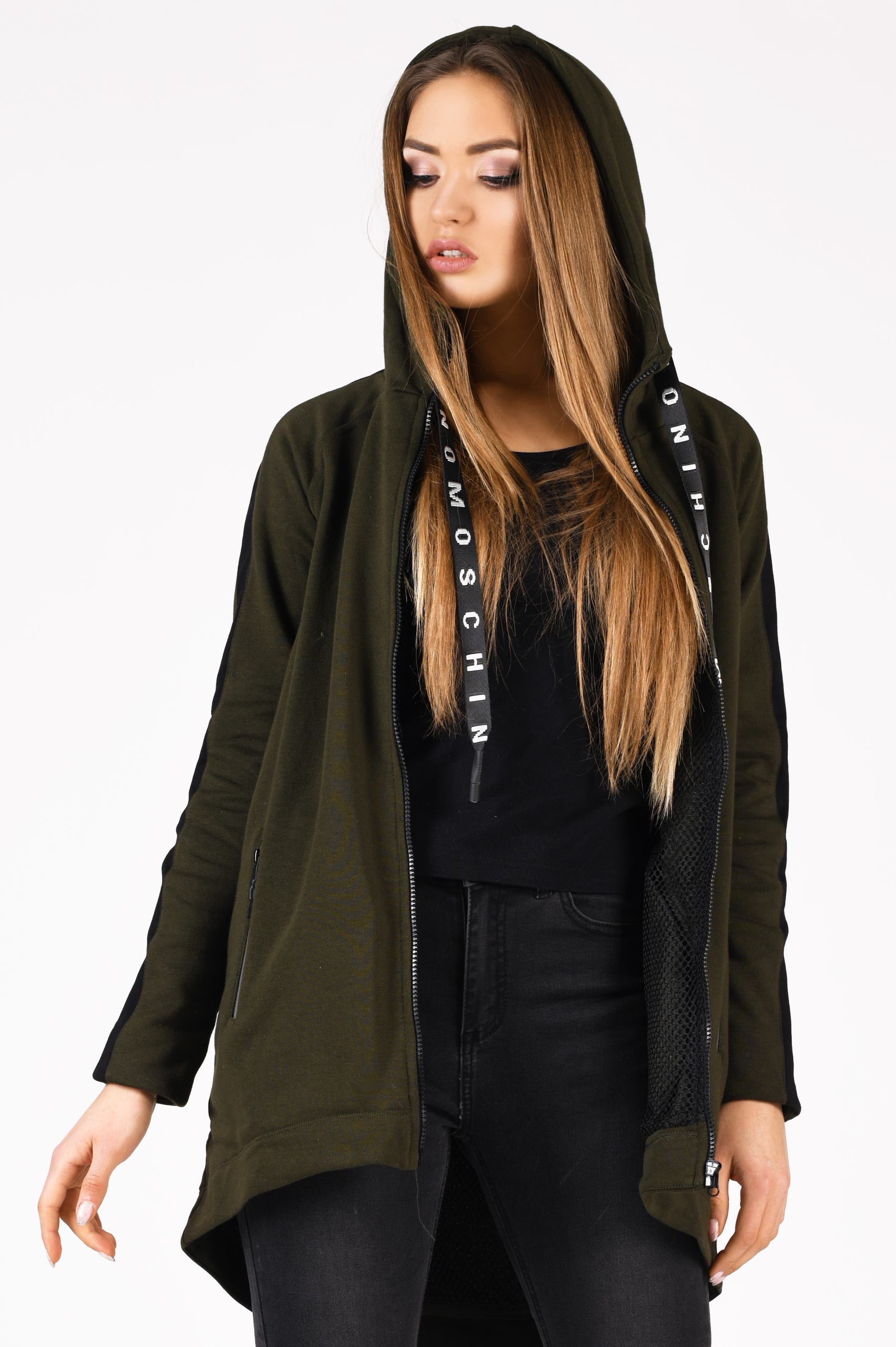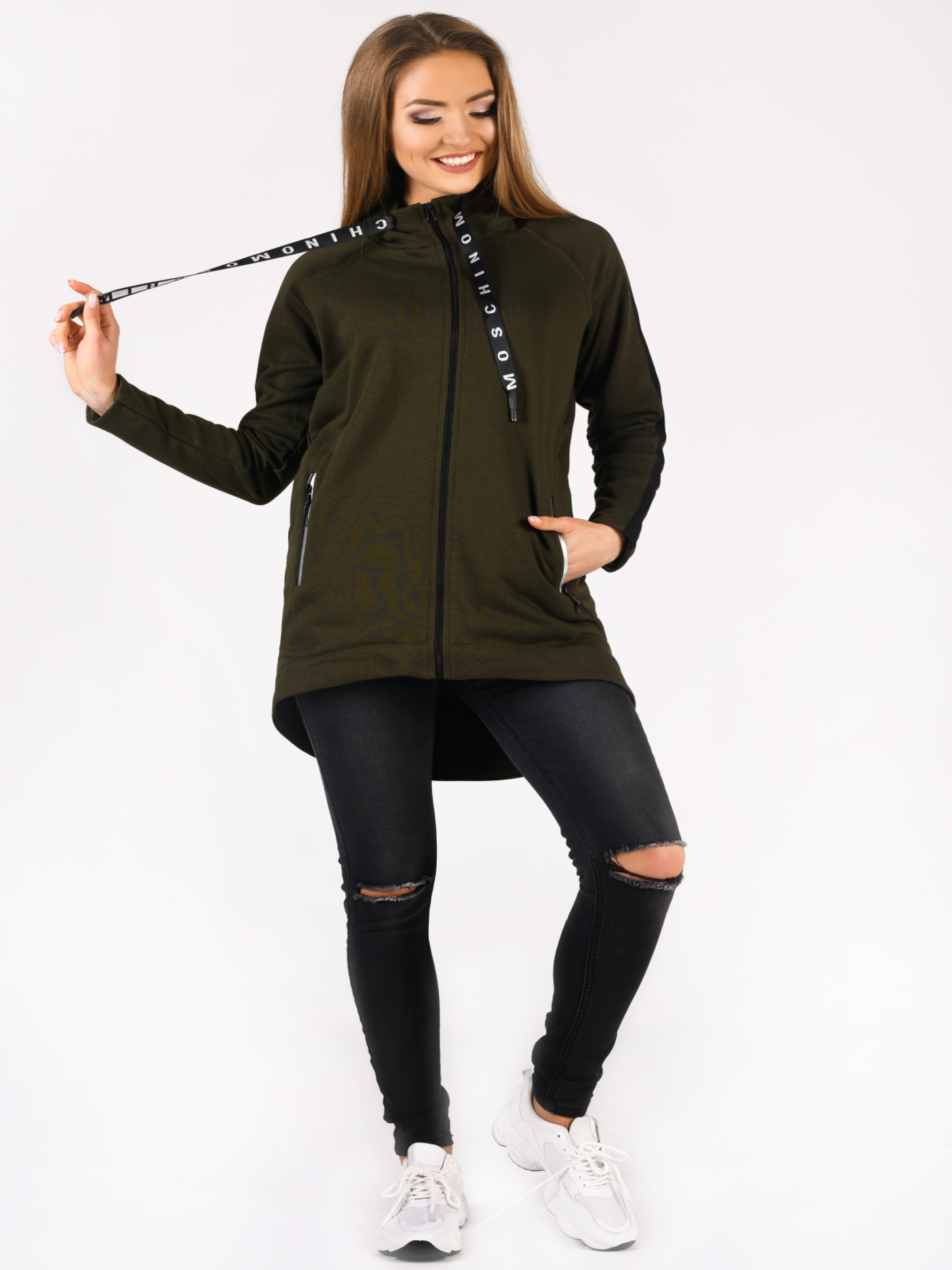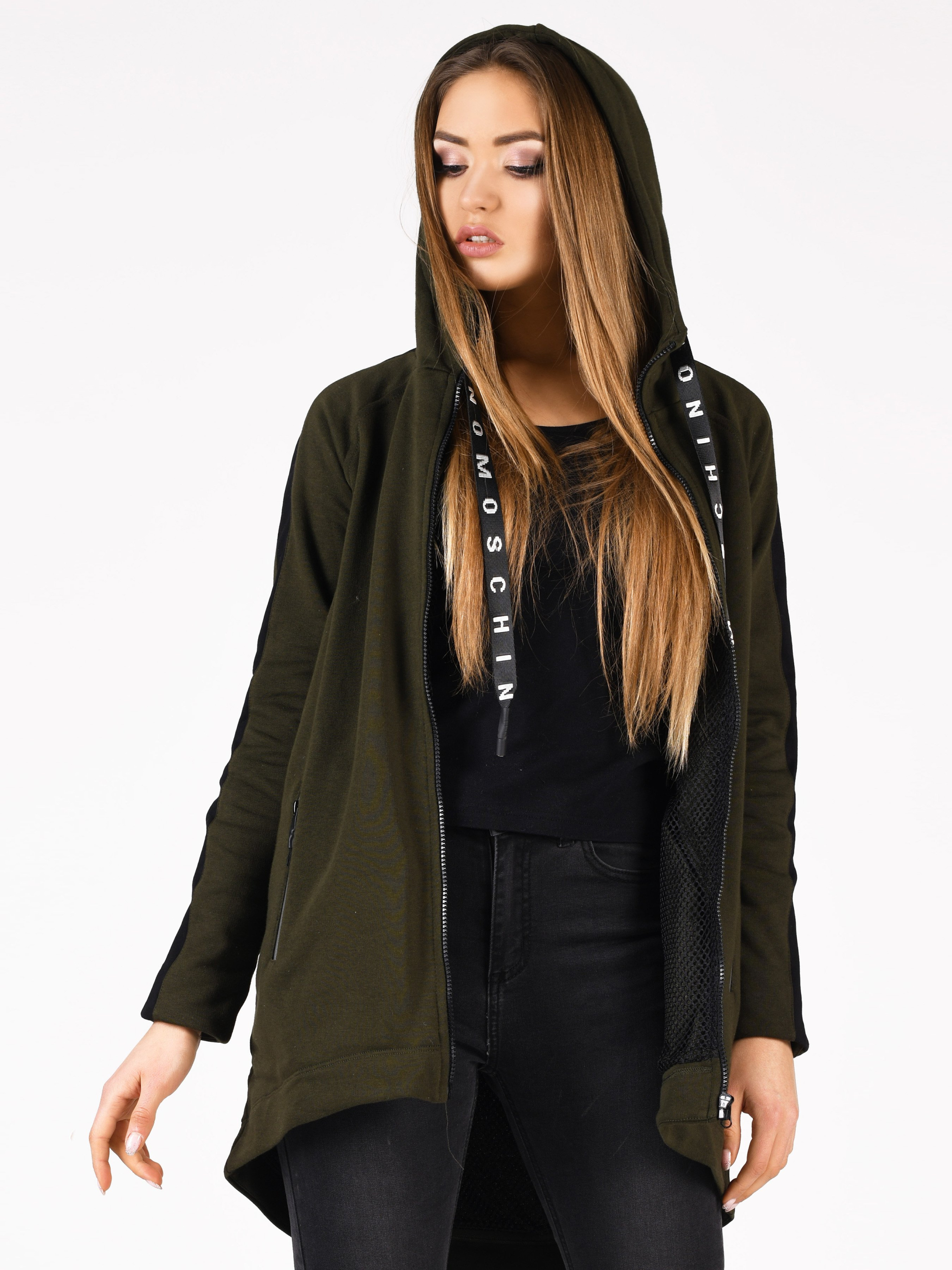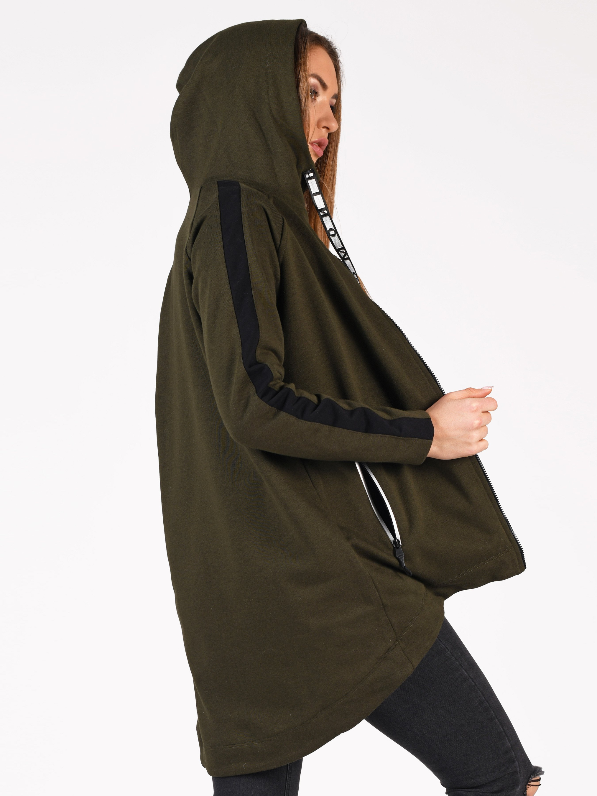 Удлиненная толстовка с лампасами на рукавах и глубоким капюшоном. Изделие имеет подкладку из сетки, два прорезных кармана на молнии, завязки на капюшоне. Толстовка сделает любой спортивный образ стильным и комфортным, подойдет для прохладных осенних вечеров и согреет вас в любую непогоду.