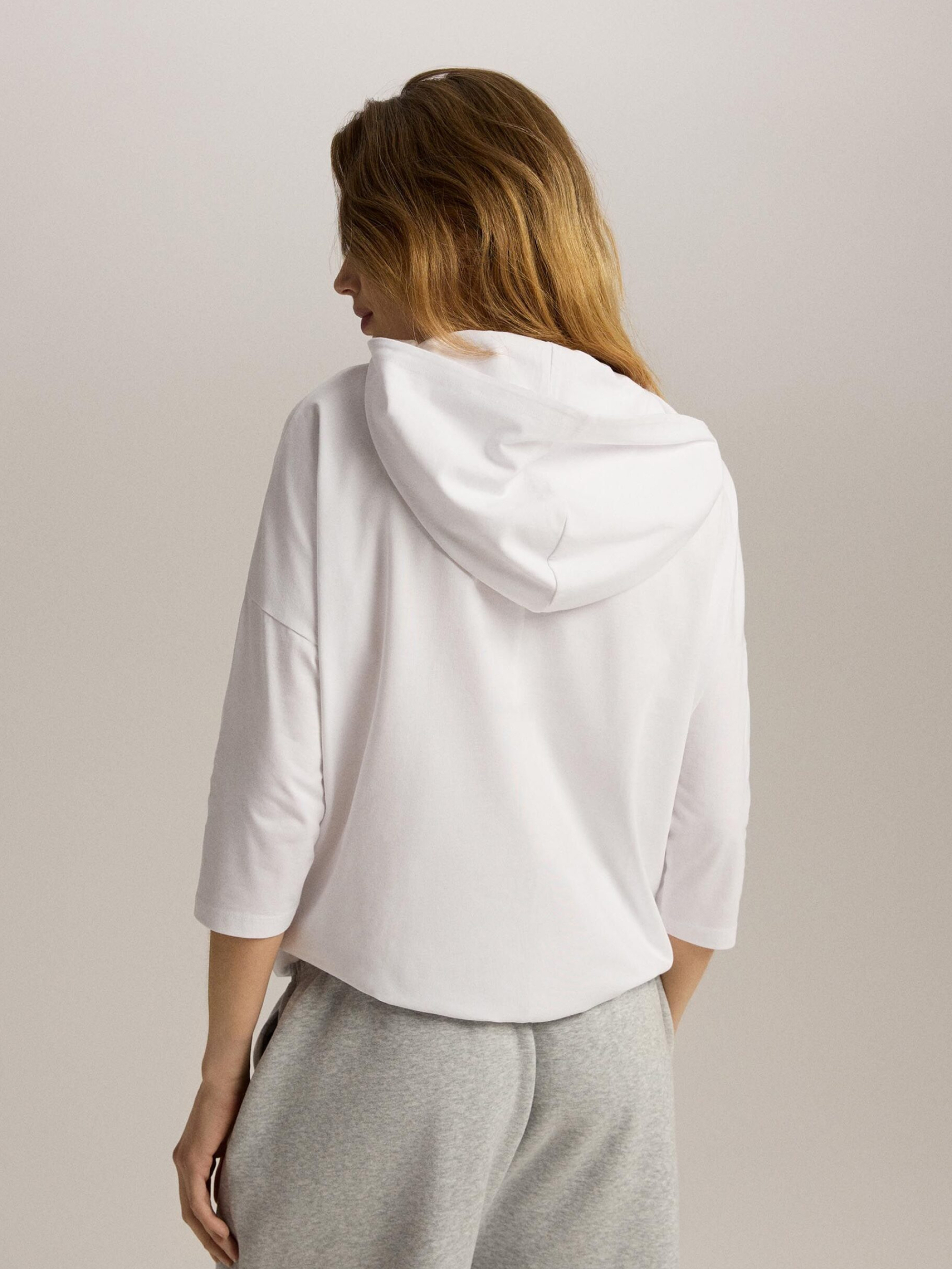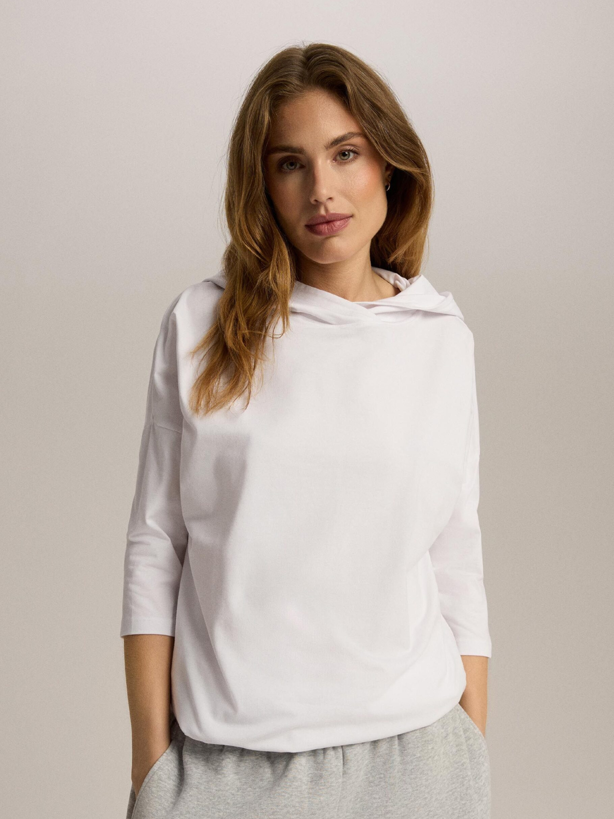 Футболка с длинным рукавом OPENLY / ID: 10047542 Рост модели: 176 см Размер товара: S Женский лонгслив со спущенными плечами: – свободного кроя, – капюшон, – с рукавами 3/4, – можно затянуть внизу шнурком. Наружный состав: 95% хлопок 5% эластан Уход: - стирка при максимуме 30 °С - деликатные вещи - не отбеливать - не сушить в сушильной машине - гладить максимум при темпе. 110 °С - не подвергать химчистке