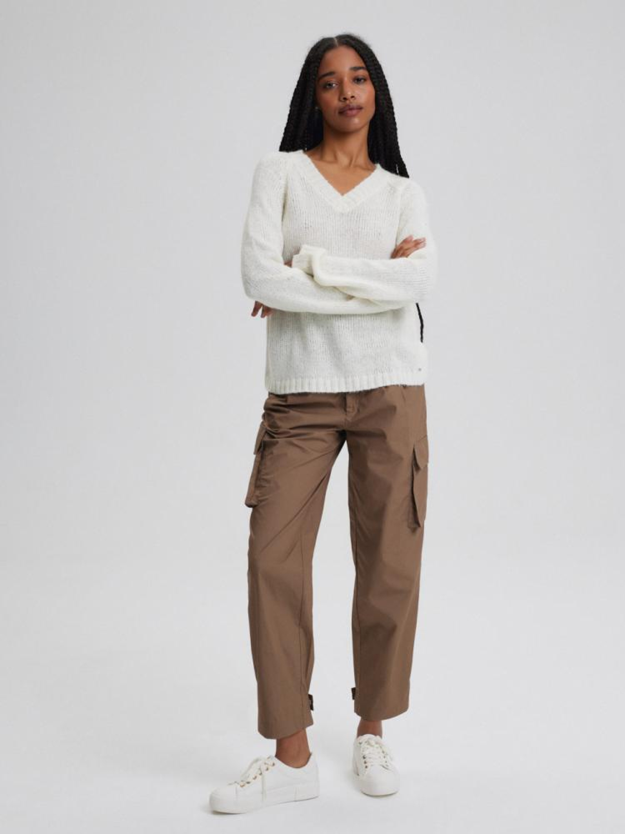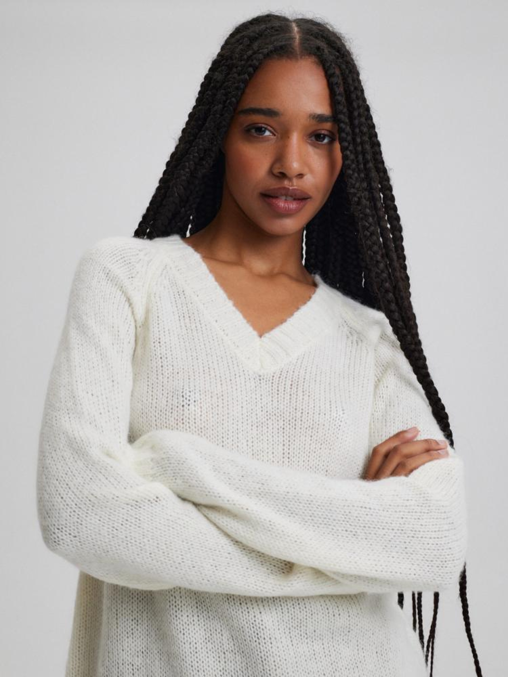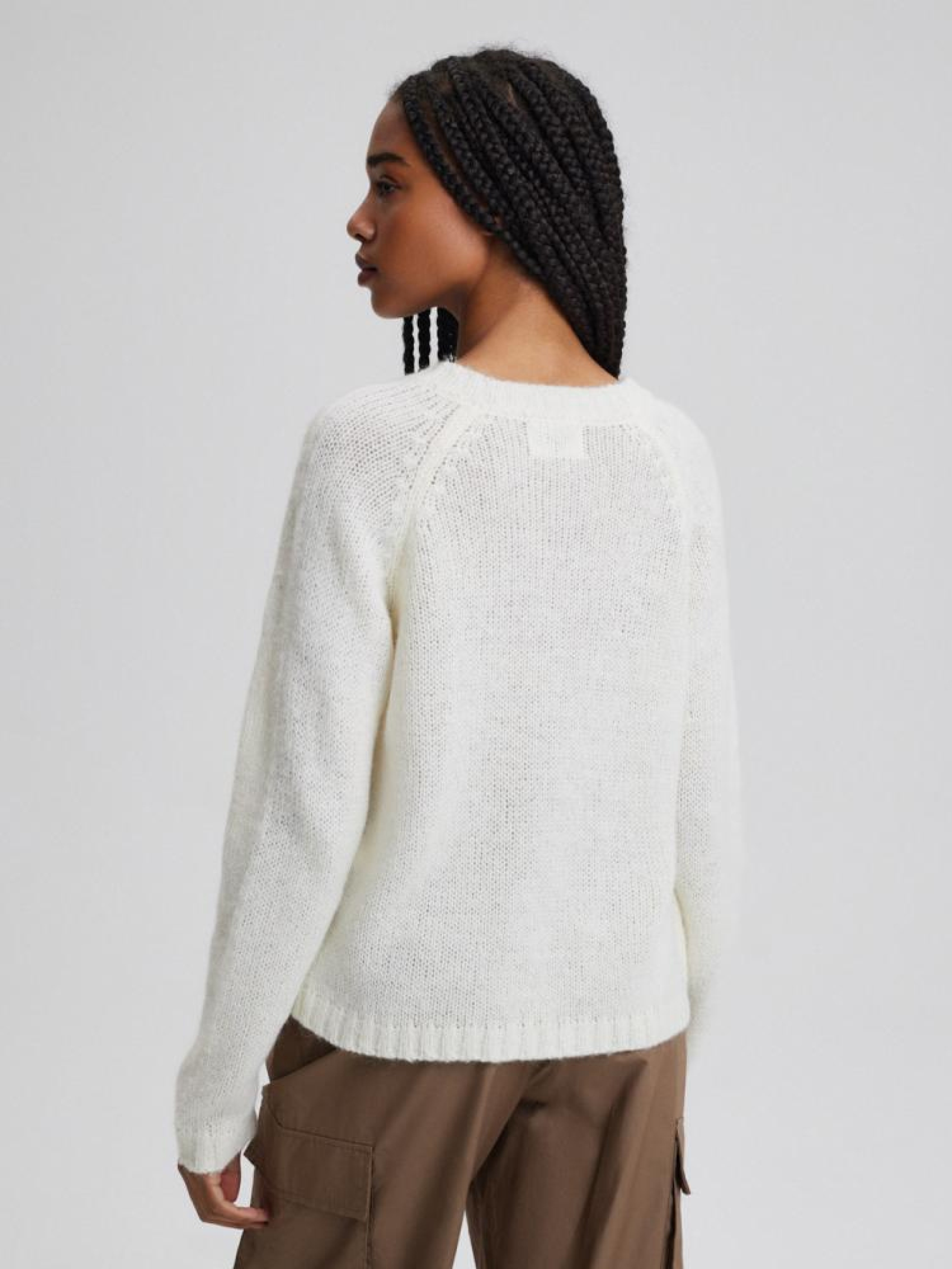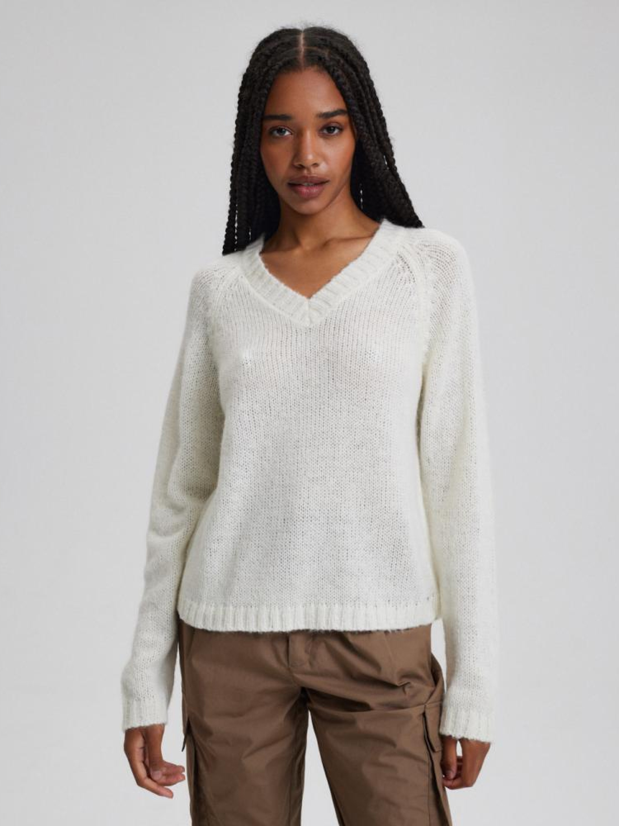Свитер TREY 10043730 Классический женский свитер: - V-образный вырез, - из трикотажа с шерстью и альпакой, - крой реглан, - элегантная отделка декольте, - доступен в теплом белом цвете. Состав: 80% акрил 11% шерсть 6% нейлон 3% альпака Сезон: Весна/Лето 2024 Уход: - не отбеливать - не сушить в сушильной машине - гладить максимум при темп. 110 °С - не химчистка - ручная стирка Размер на модели - S Рост модели - 172 см