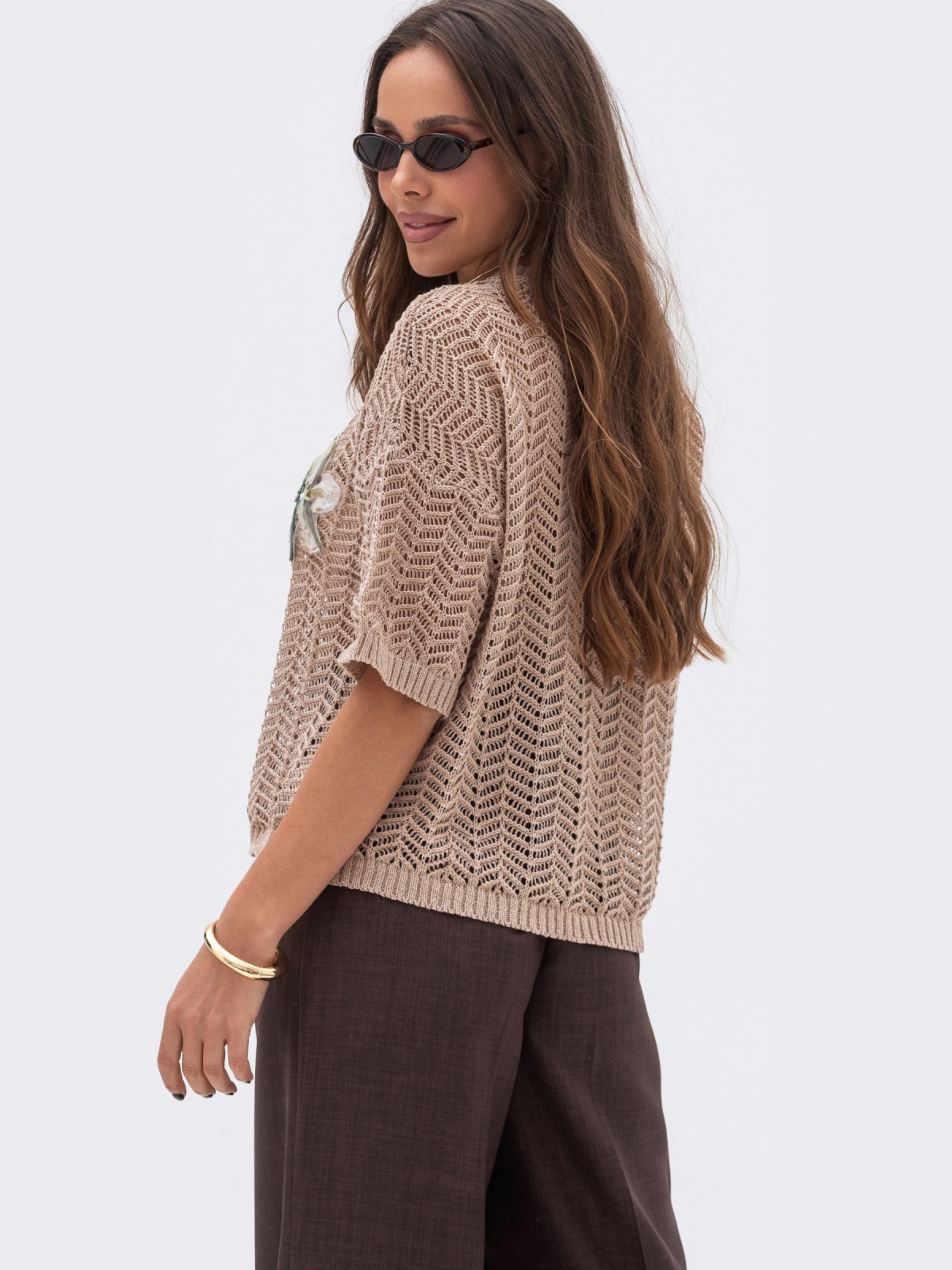 Вязаная футболка из высококачественного турецкого материала с узором "ёлочка". Полупрозрачная текстура придаёт образу изысканности и лёгкости. Модель с классическим круглым вырезом горловины, который подчёркивает линию шеи, и короткими рукавами, обеспечивающими лёгкость и комфорт в тёплую погоду. По линии груди декорирована фактурным цветком. Топ в комплект не входит.