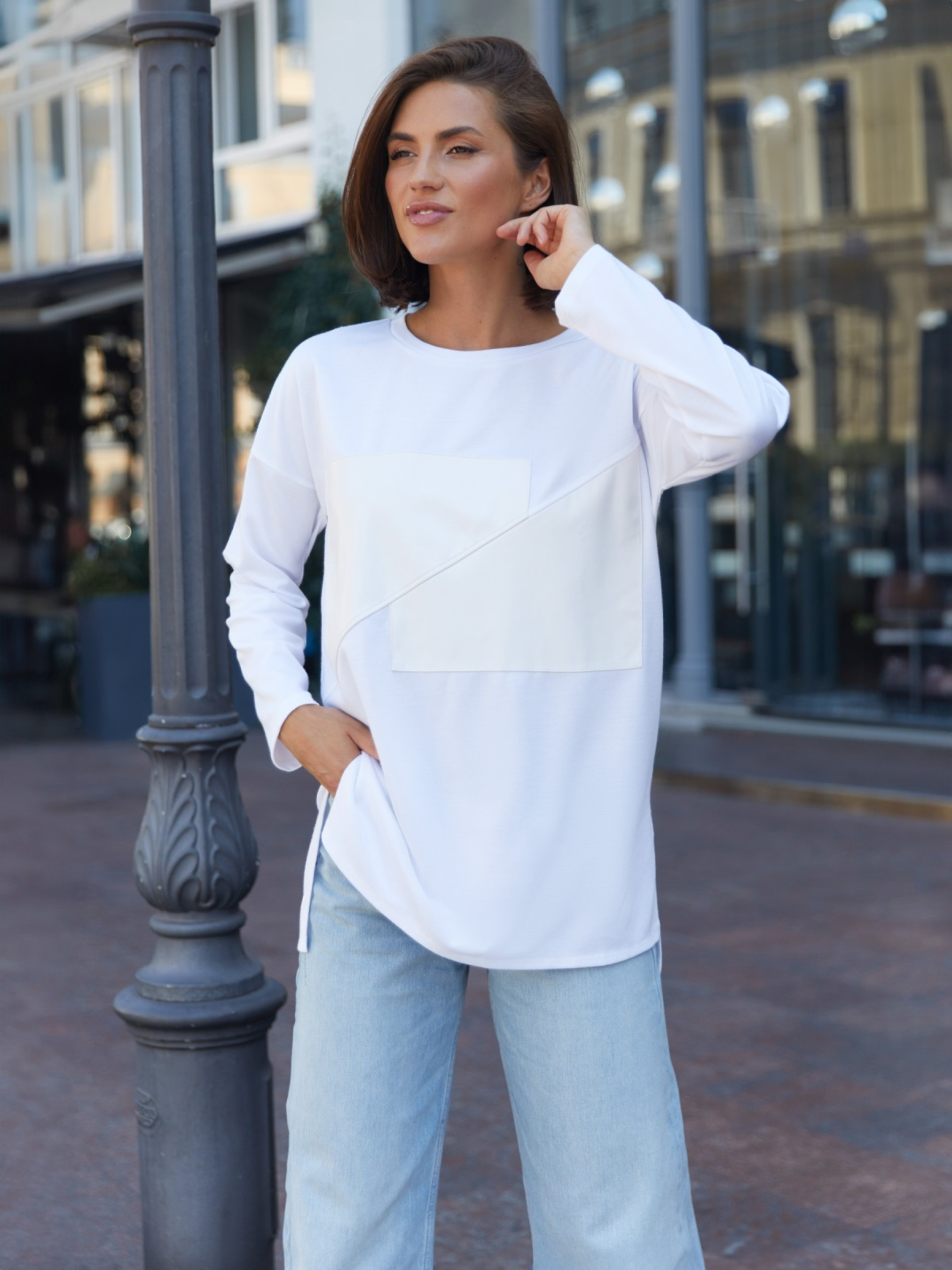 Туника из французского трикотажа с акцентной вставкой из эко-кожи. Модель свободного кроя со спущенной линией плеча. Круглый вырез горловины подчёркивает линию шеи. Удлинённая спинка и боковые разрезы делают тунику удобной и визуально вытягивают силуэт. Контраст мягкого трикотажа и гладкой эко-кожи придаёт модели выразительность.