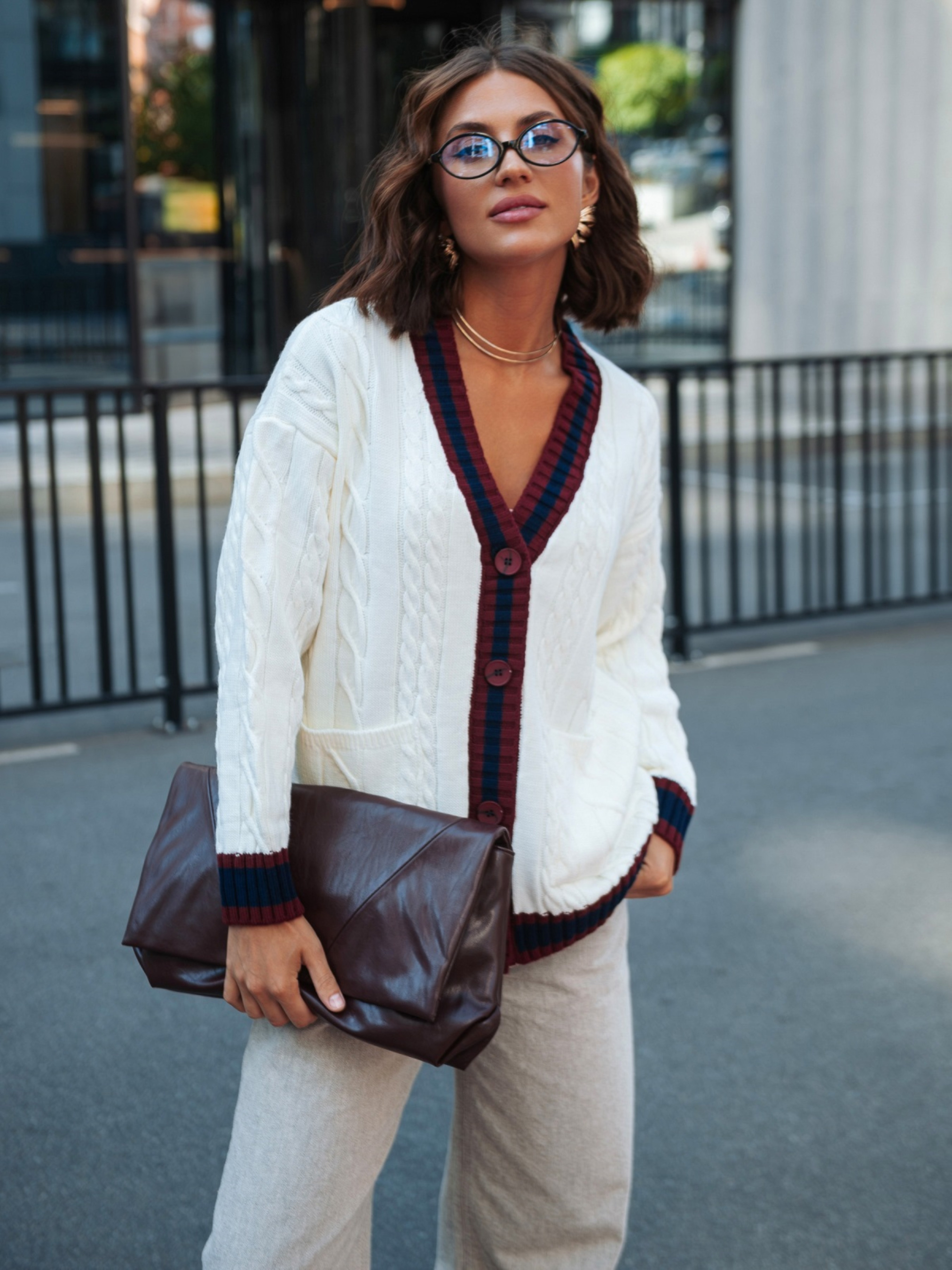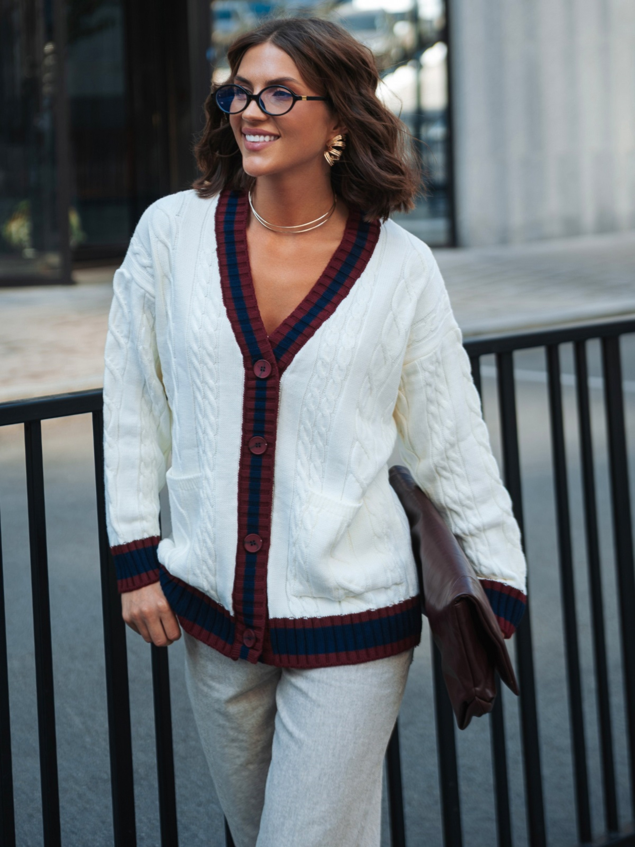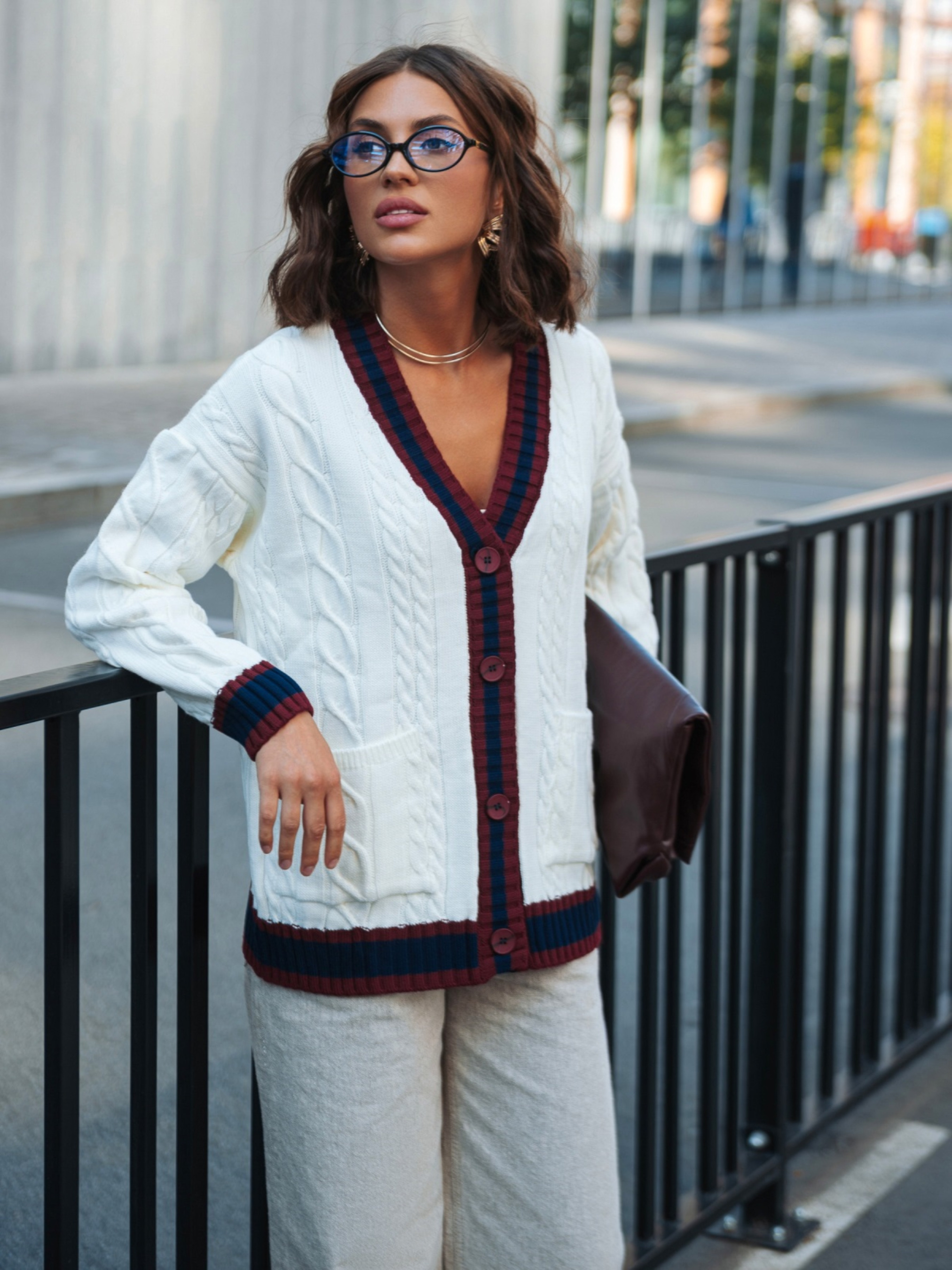 Вязаная кофта из высококачественного турецкого материала. Модель с фактурным узором косы, который придаёт модели объём и делает её визуально интересной. Контрастная планка создаёт выразительный акцент. Изделие прямого кроя со спущенной линией плеча обеспечивает комфорт и свободу движений. Длинные рукава дополнены манжетами в рубчик, что помогает держать форму. Внизу расположены удобные накладные карманы, которые добавляют практичности. Застёгивается на пуговицы.