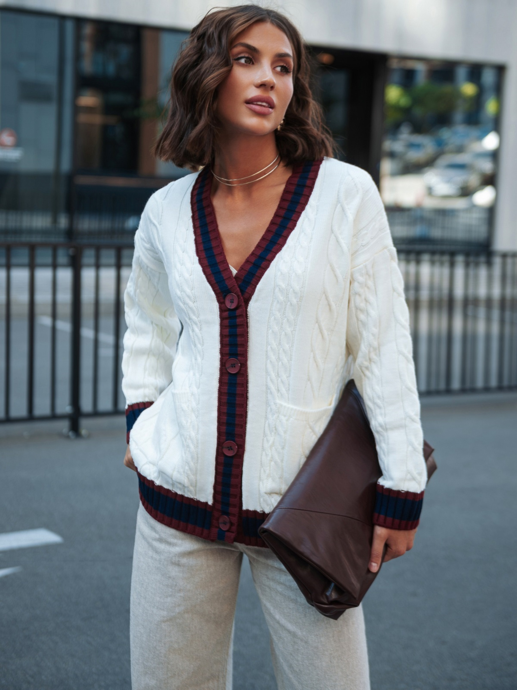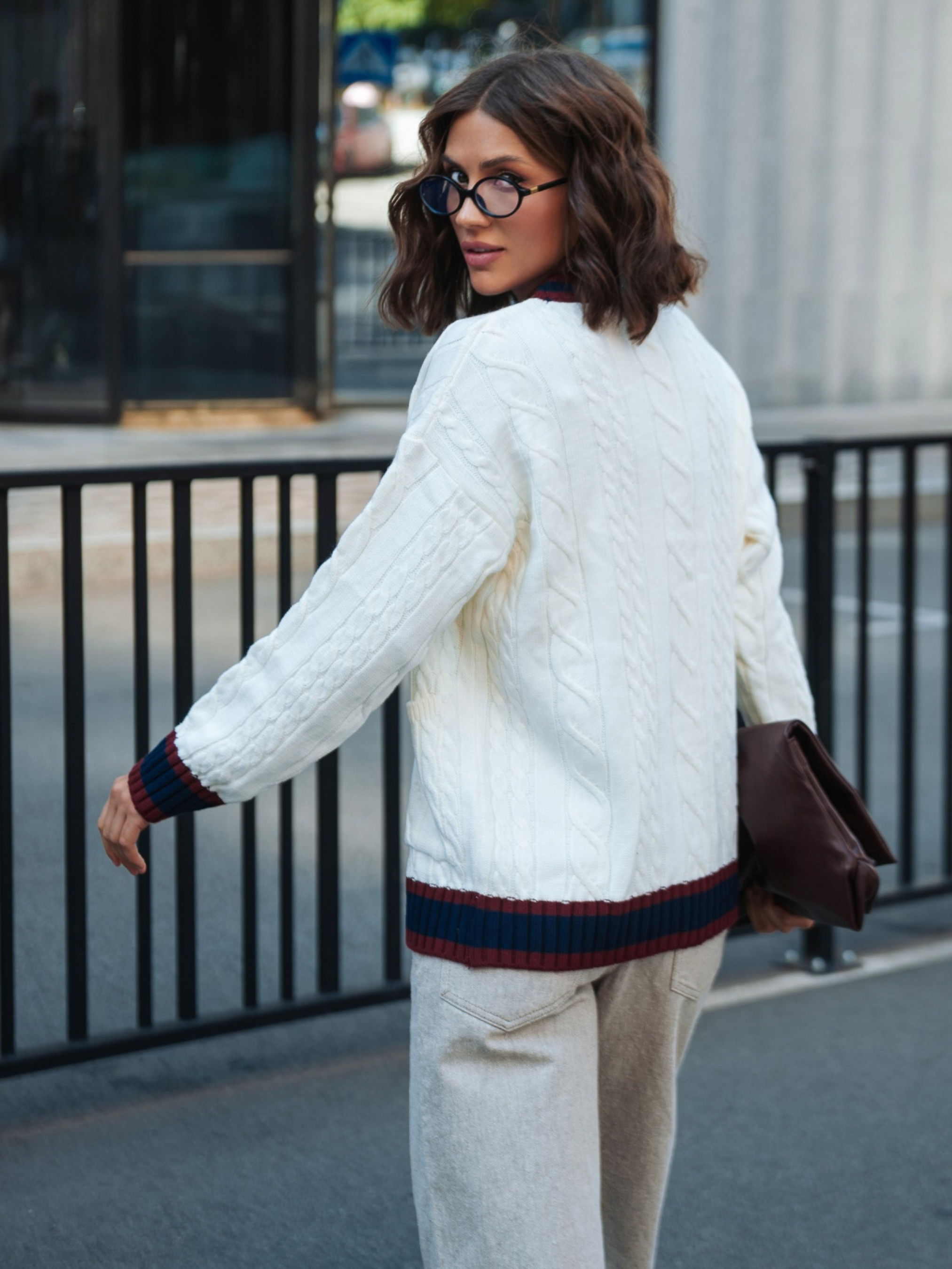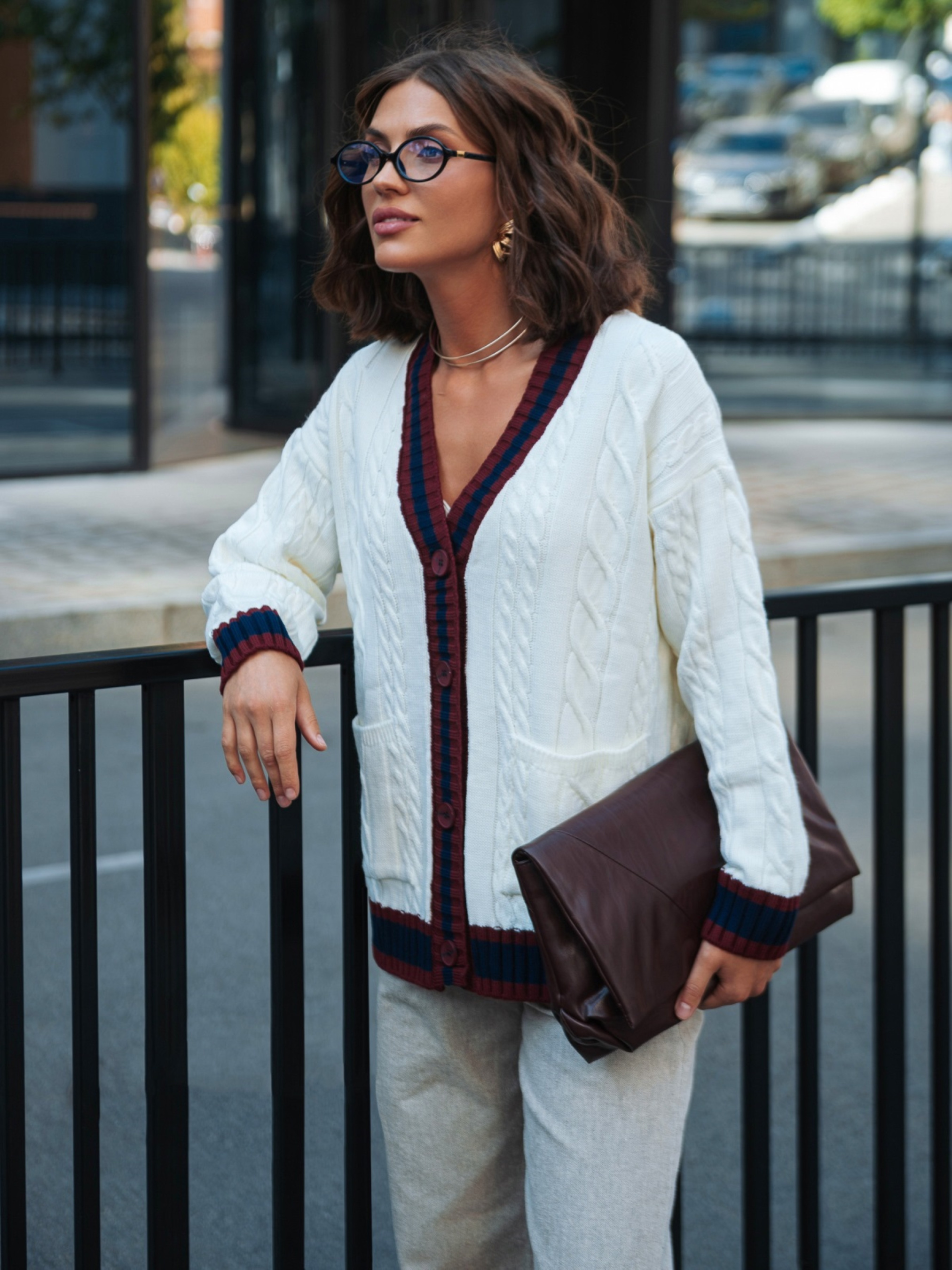 Вязаная кофта из высококачественного турецкого материала. Модель с фактурным узором косы, который придаёт модели объём и делает её визуально интересной. Контрастная планка создаёт выразительный акцент. Изделие прямого кроя со спущенной линией плеча обеспечивает комфорт и свободу движений. Длинные рукава дополнены манжетами в рубчик, что помогает держать форму. Внизу расположены удобные накладные карманы, которые добавляют практичности. Застёгивается на пуговицы.