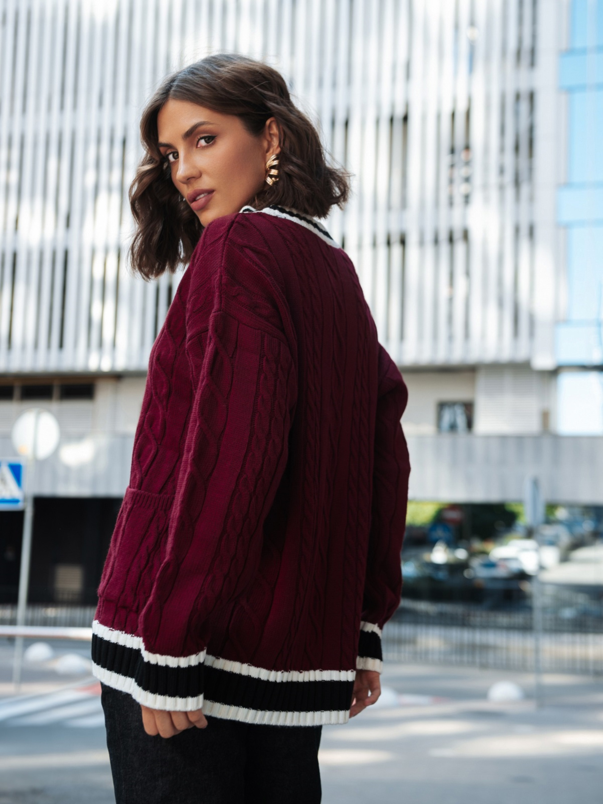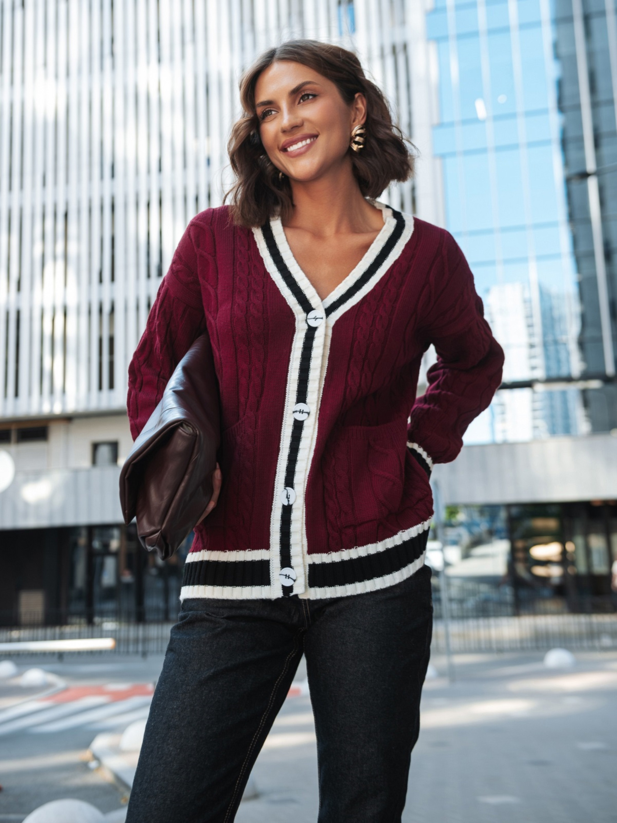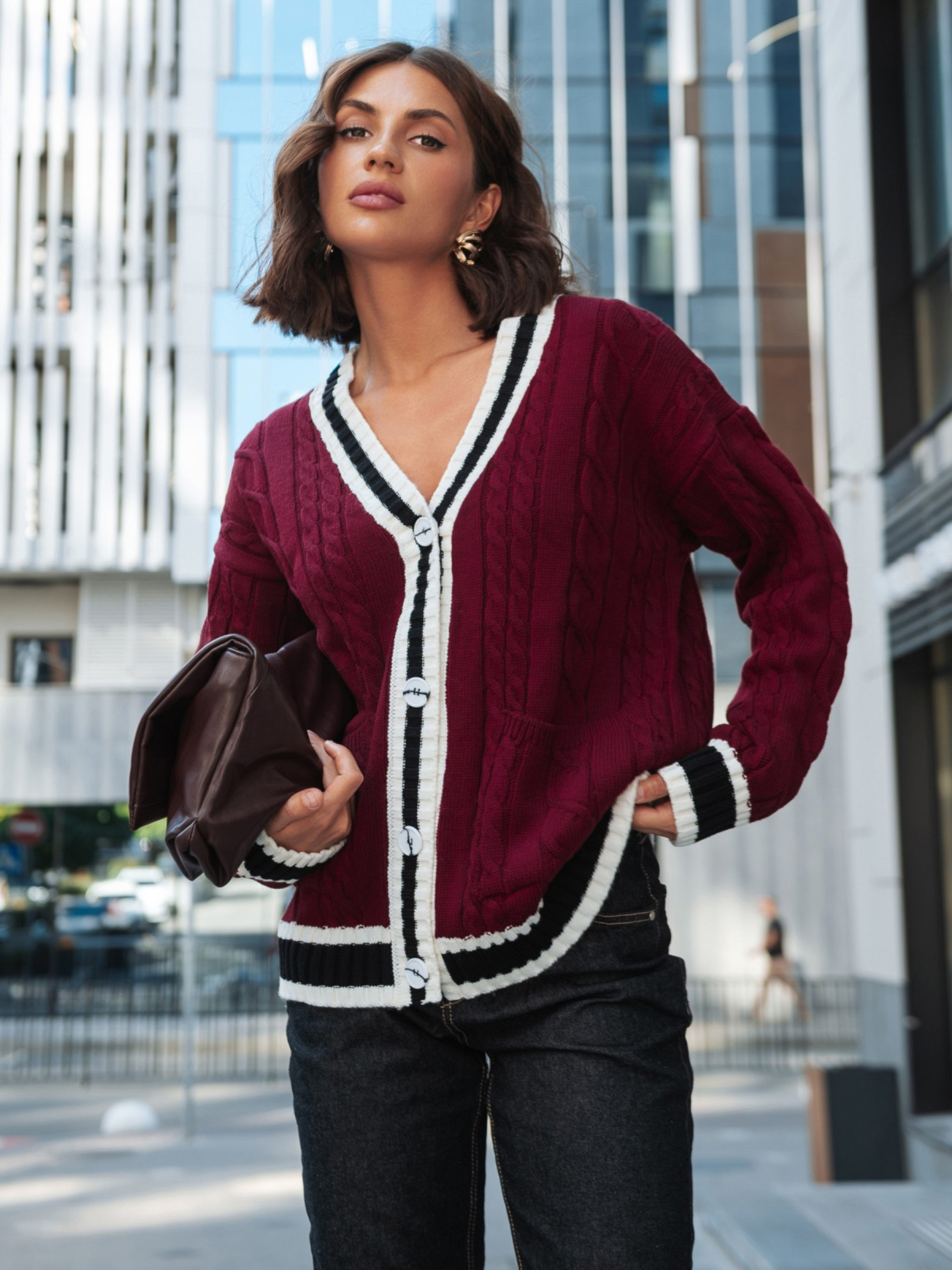 Вязаная кофта из высококачественного турецкого материала. Модель с фактурным узором косы, который придаёт модели объём и делает её визуально интересной. Контрастная планка создаёт выразительный акцент. Изделие прямого кроя со спущенной линией плеча обеспечивает комфорт и свободу движений. Длинные рукава дополнены манжетами в рубчик, что помогает держать форму. Внизу расположены удобные накладные карманы, которые добавляют практичности. Застёгивается на пуговицы.