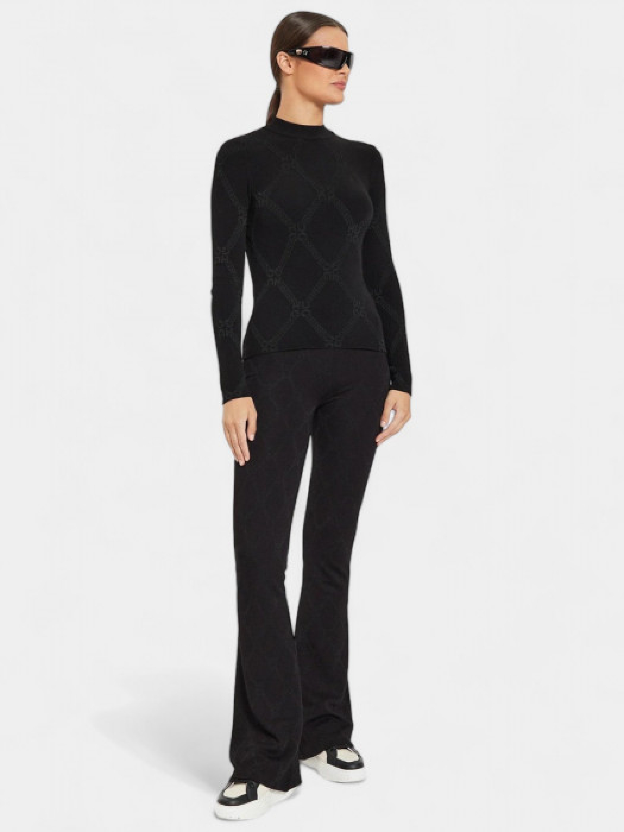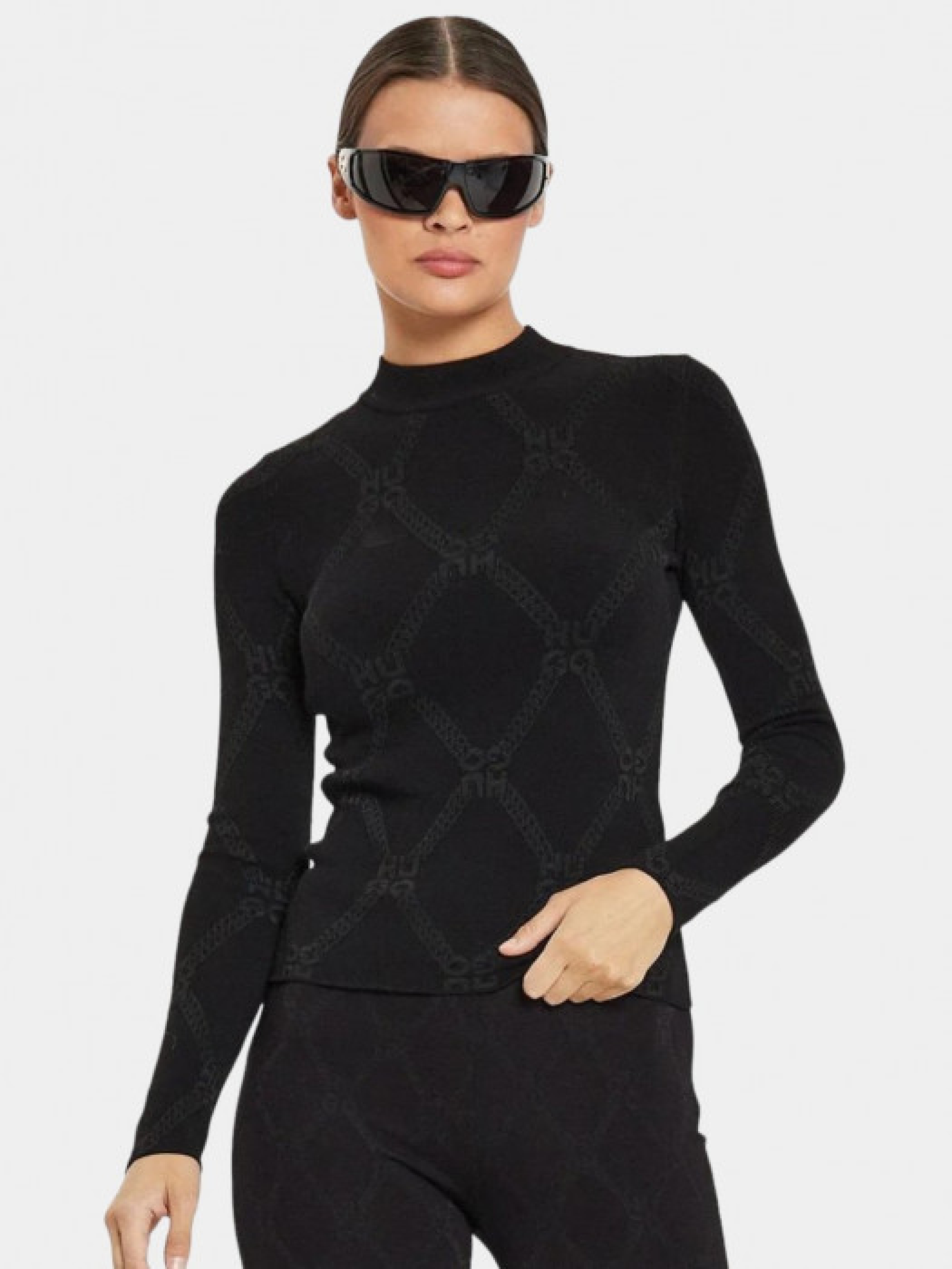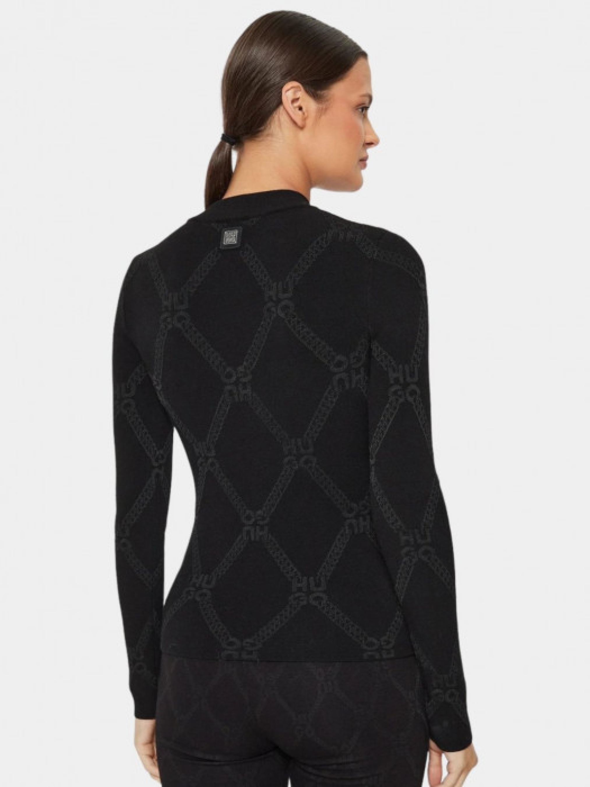 Черный гольф Sater от бренда HUGO, выполненный в стиле Slim Fit с контрастным узором. Изготовлен из сочетания вискозы, полиэстера и полиамида, что делает его приятным для тела и комфортным в ношении. Гольф имеет длинные рукава и классический воротник, подходящий для элегантного повседневного образа. Рост модели – 176 см, на модели размер S.